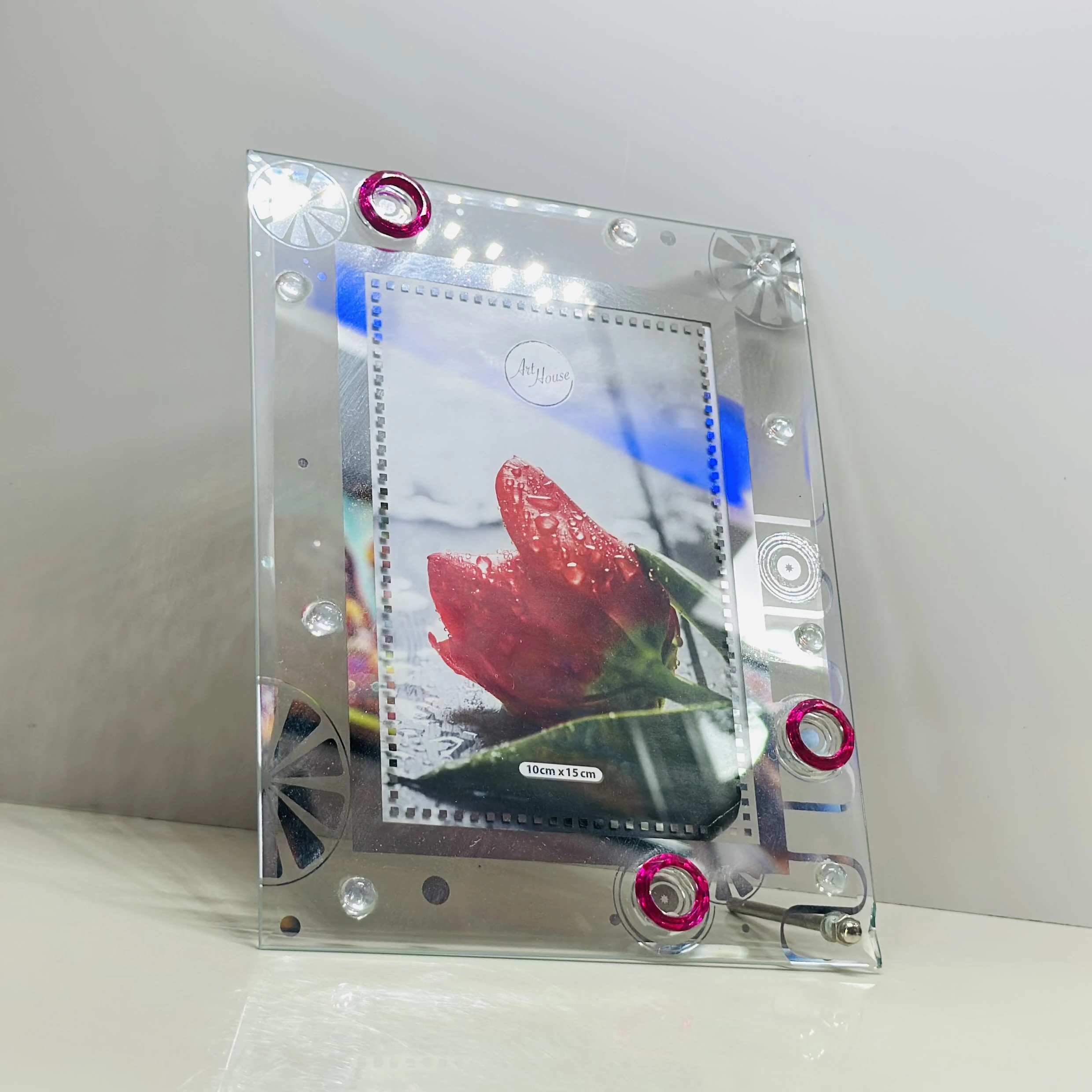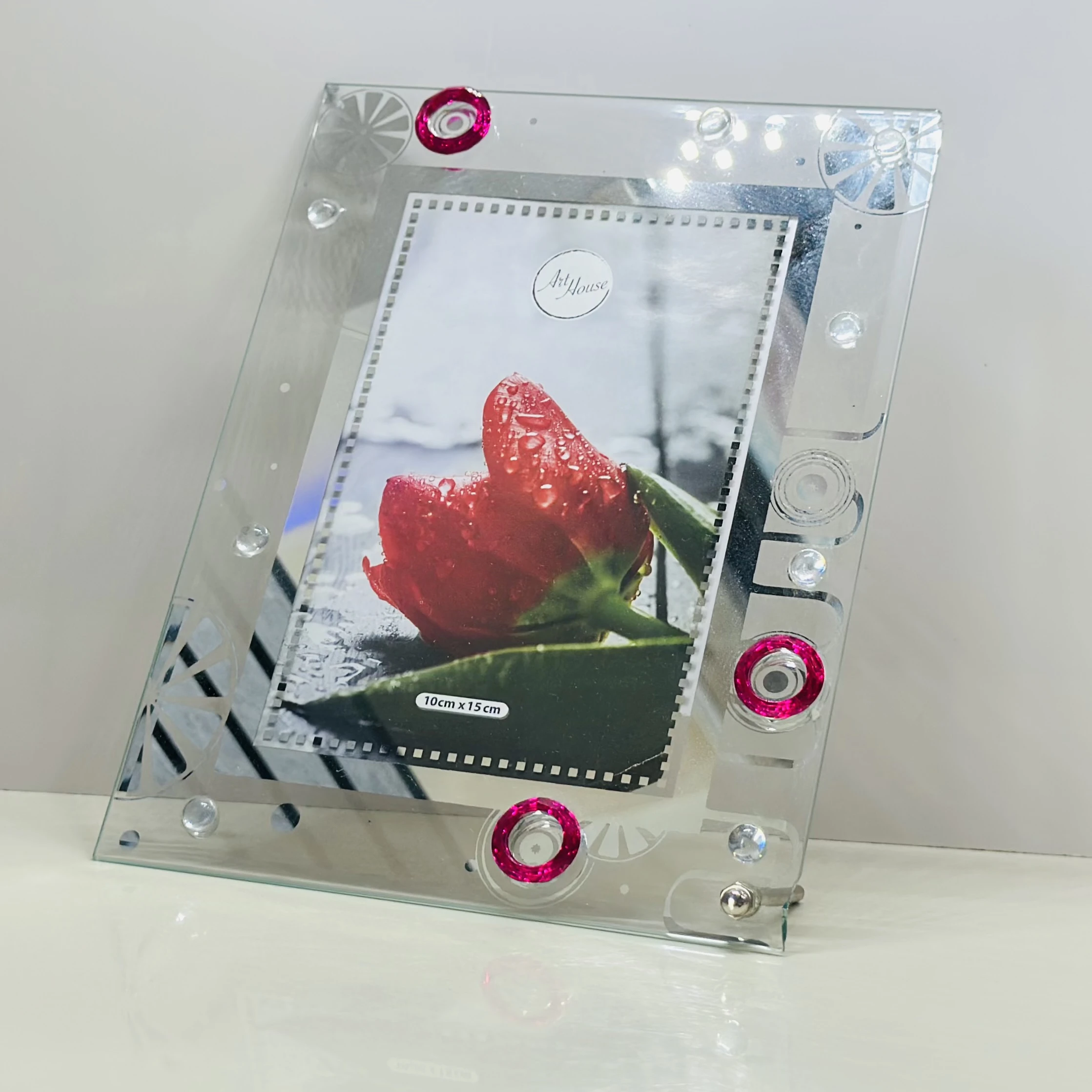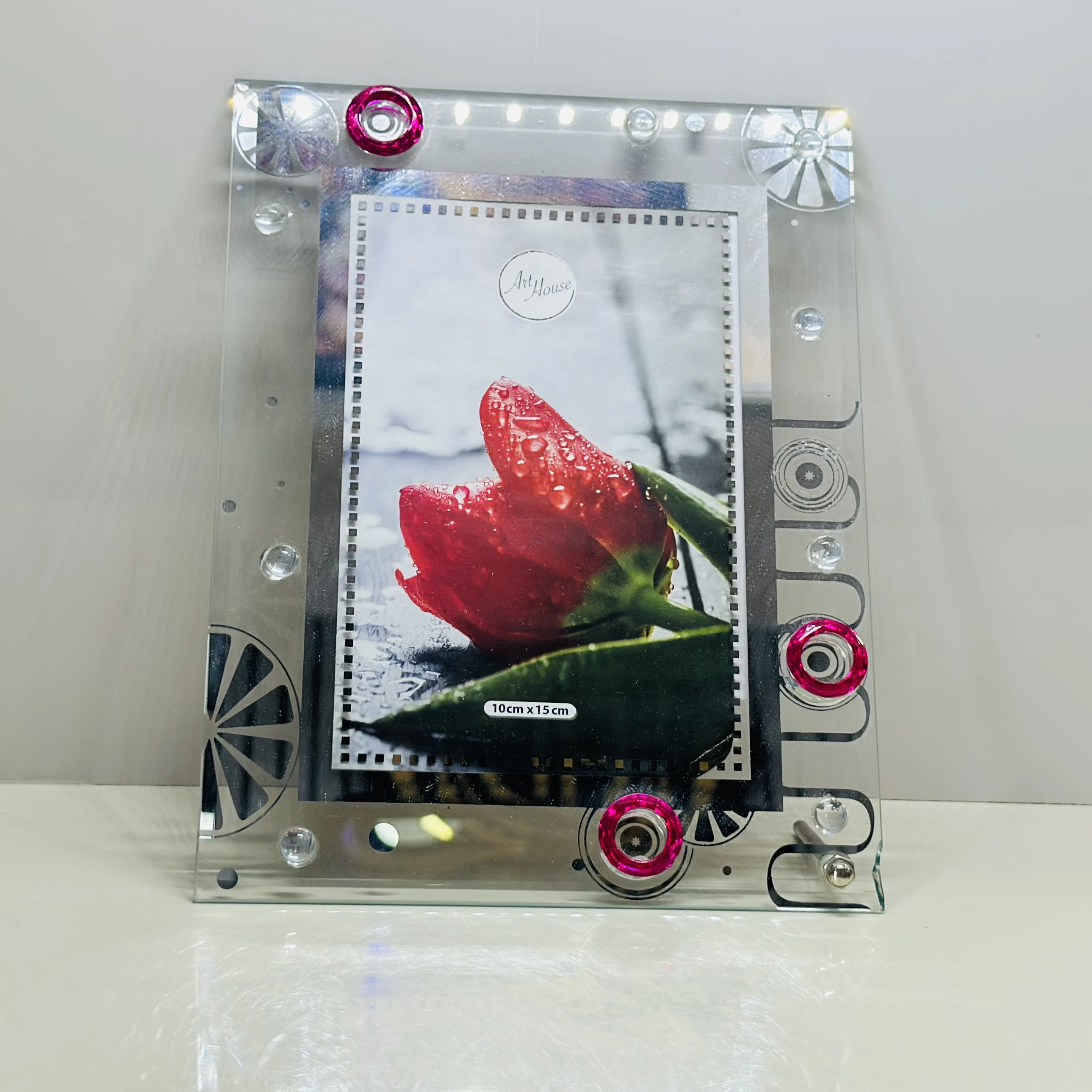 👉 Theme :- glass photo frame with a picture of a red tulip inside.
