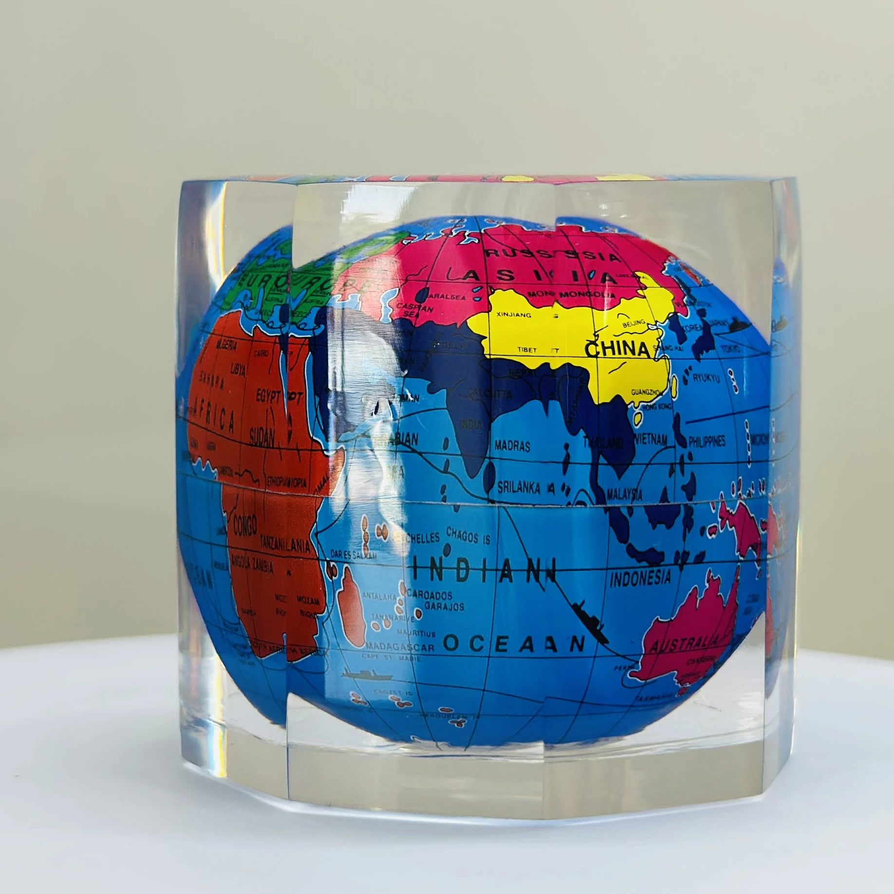 👉 Theme :- globe paperweight encased in a clear, multi-faceted acrylic or resin block