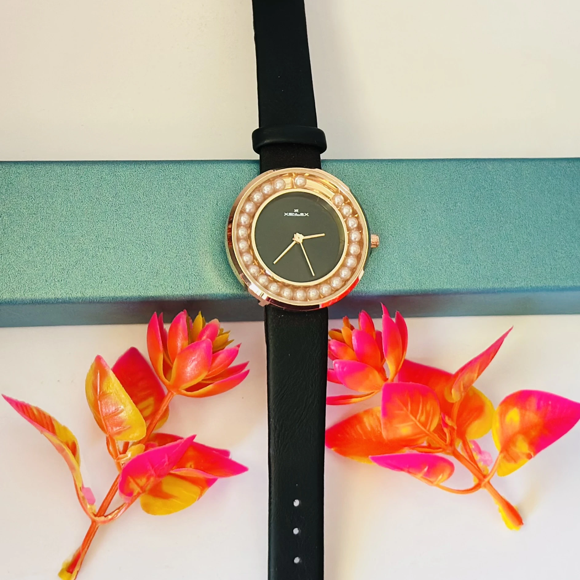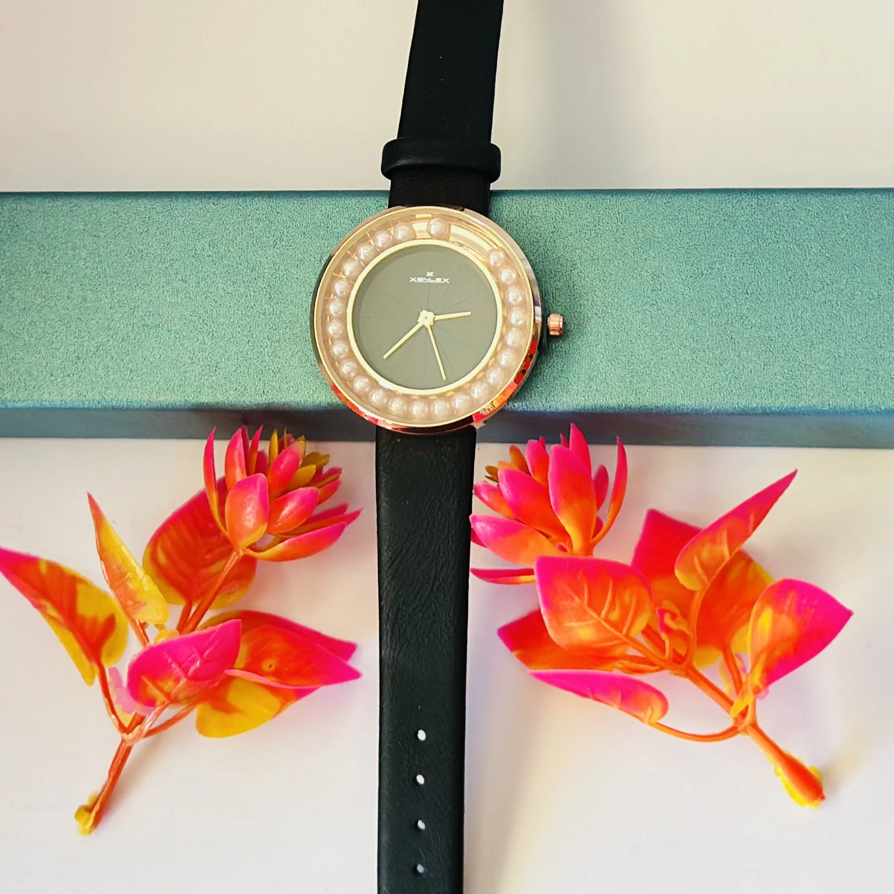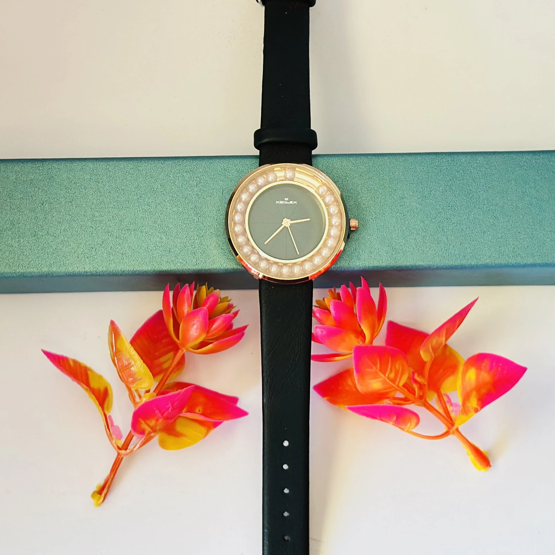 👉 Theme :- Gogoey women's analog watch with a black strap and a dial featuring a faux pearl-encrusted bezel.