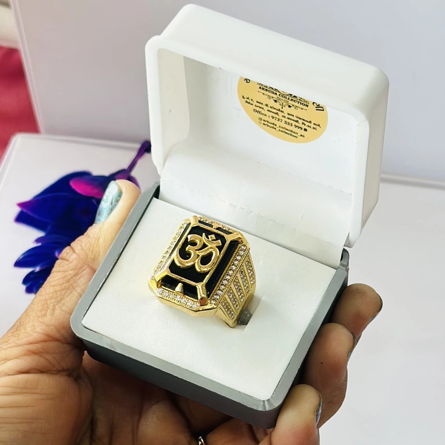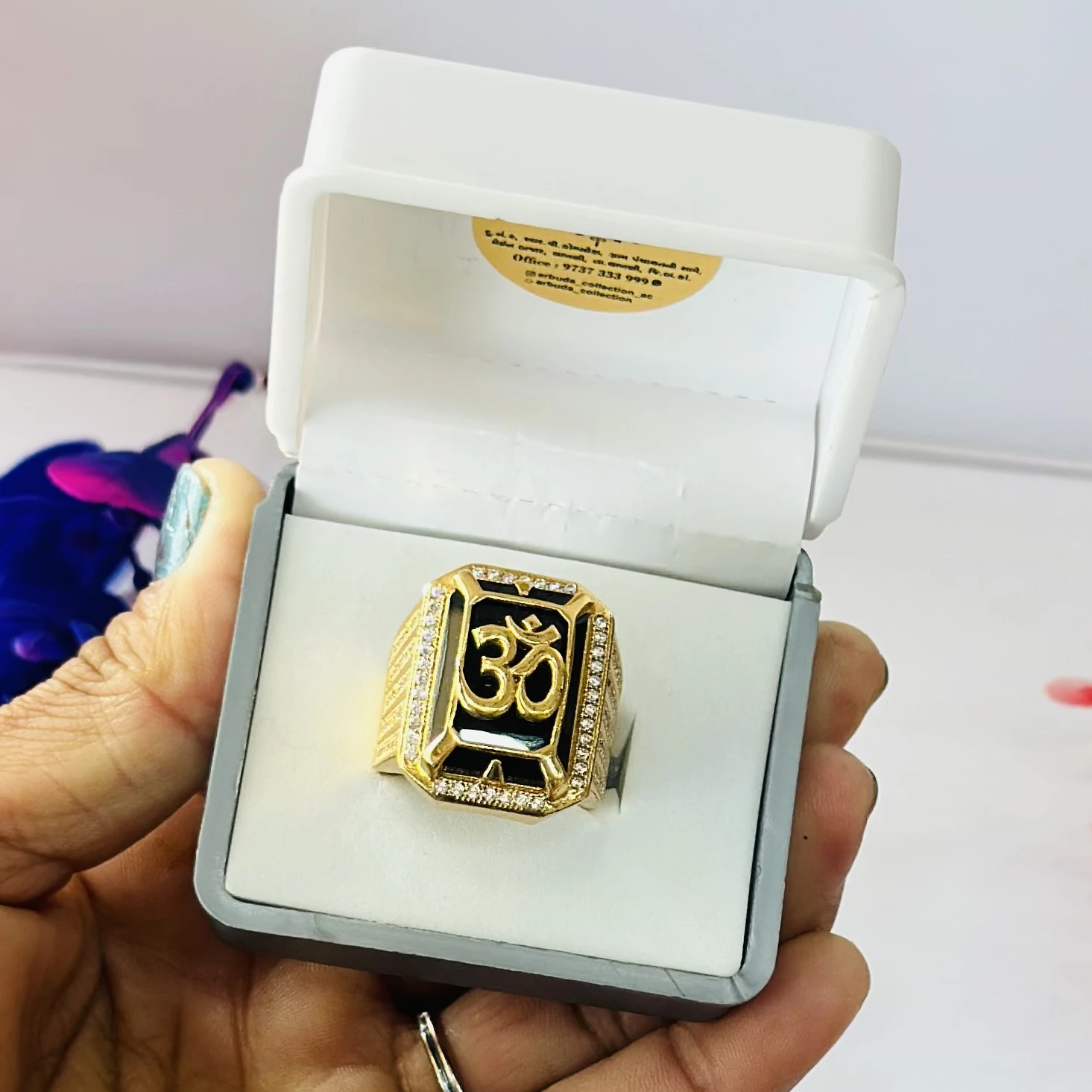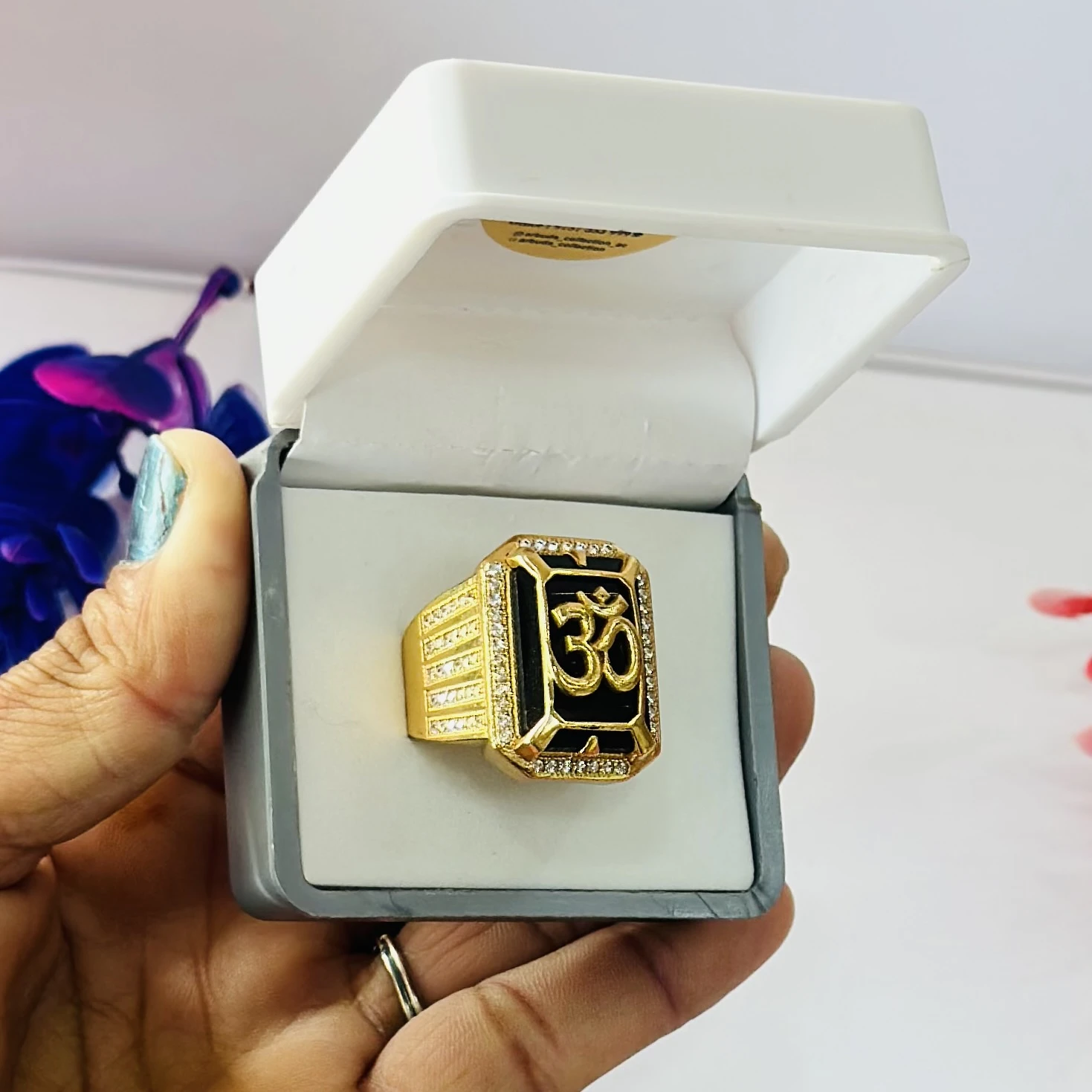 👉 Theme :- gold-plated brass men's ring featuring an 'Om' symbol