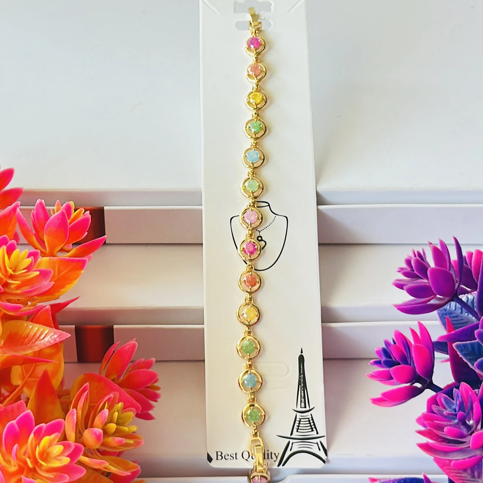 Gold plated chain bracelet with multicolor oval-shaped stones.