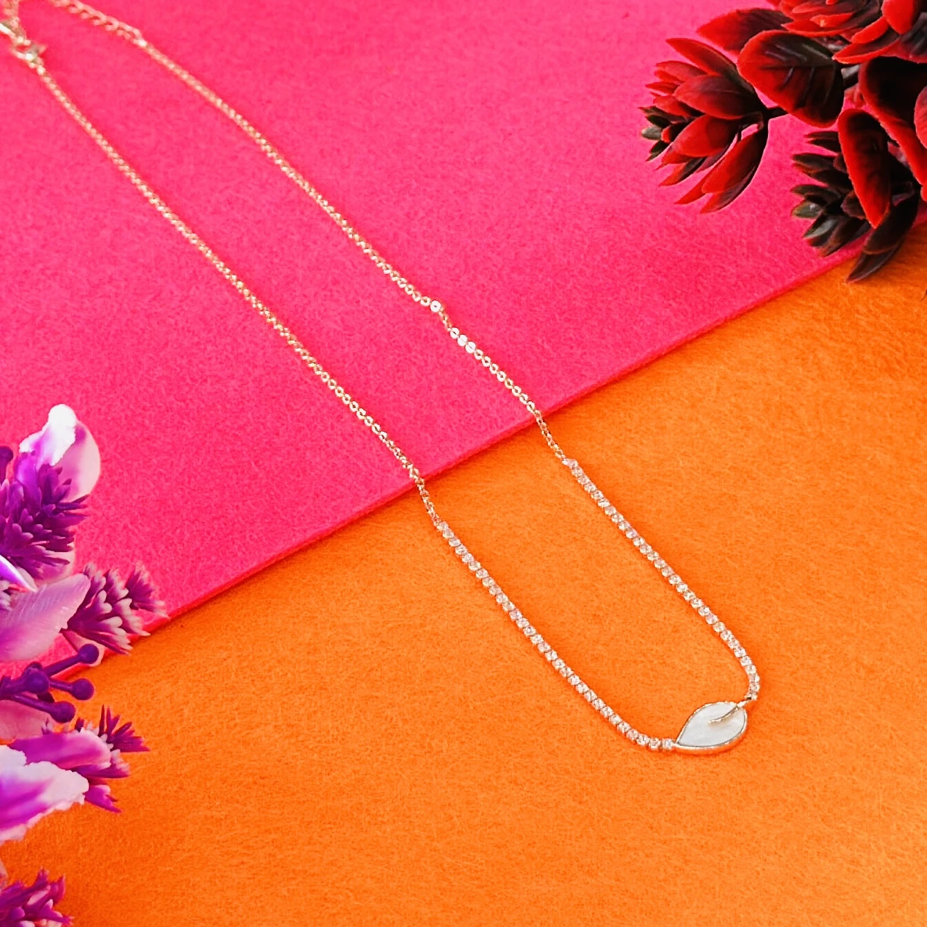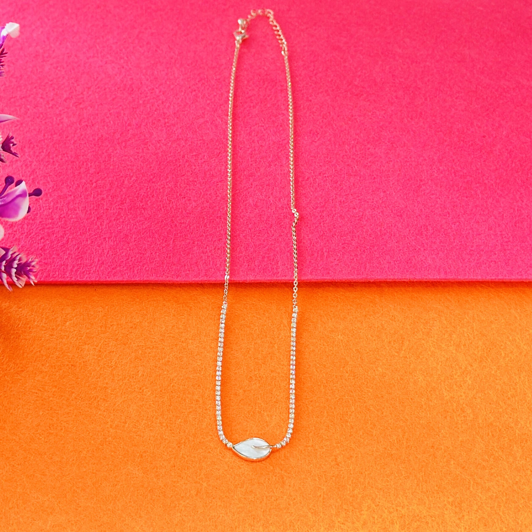Gold plated chain necklace with a leaf-shaped white pendant.