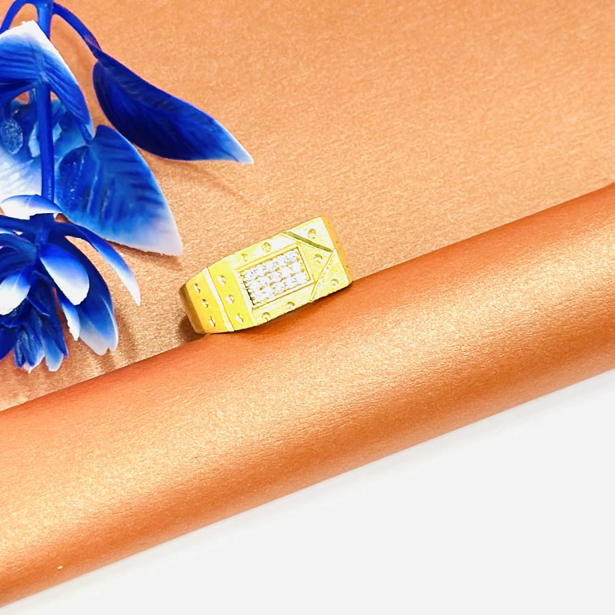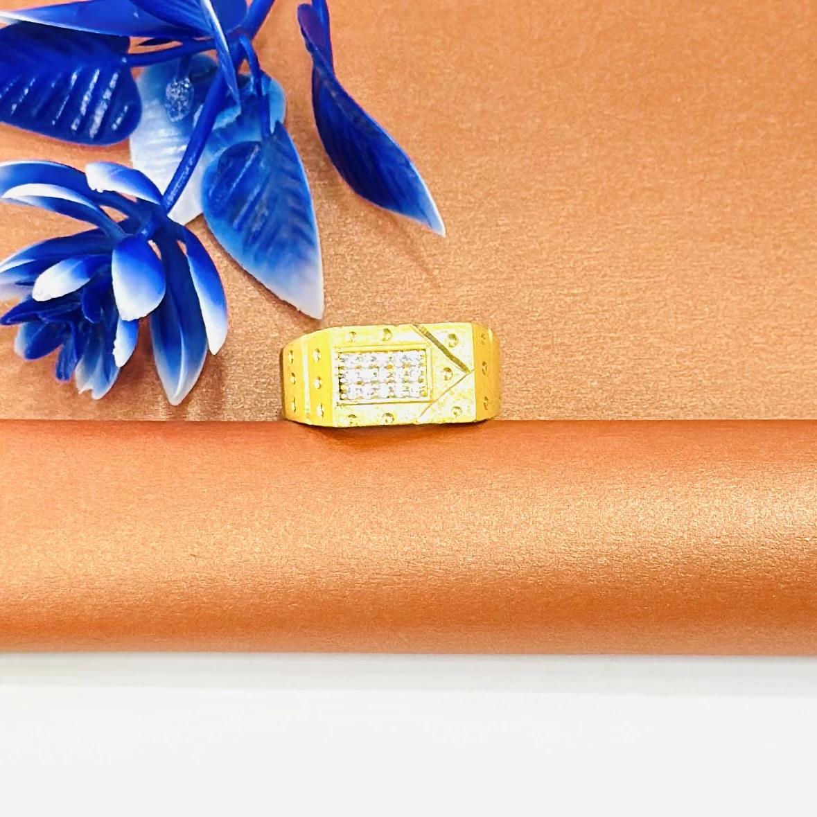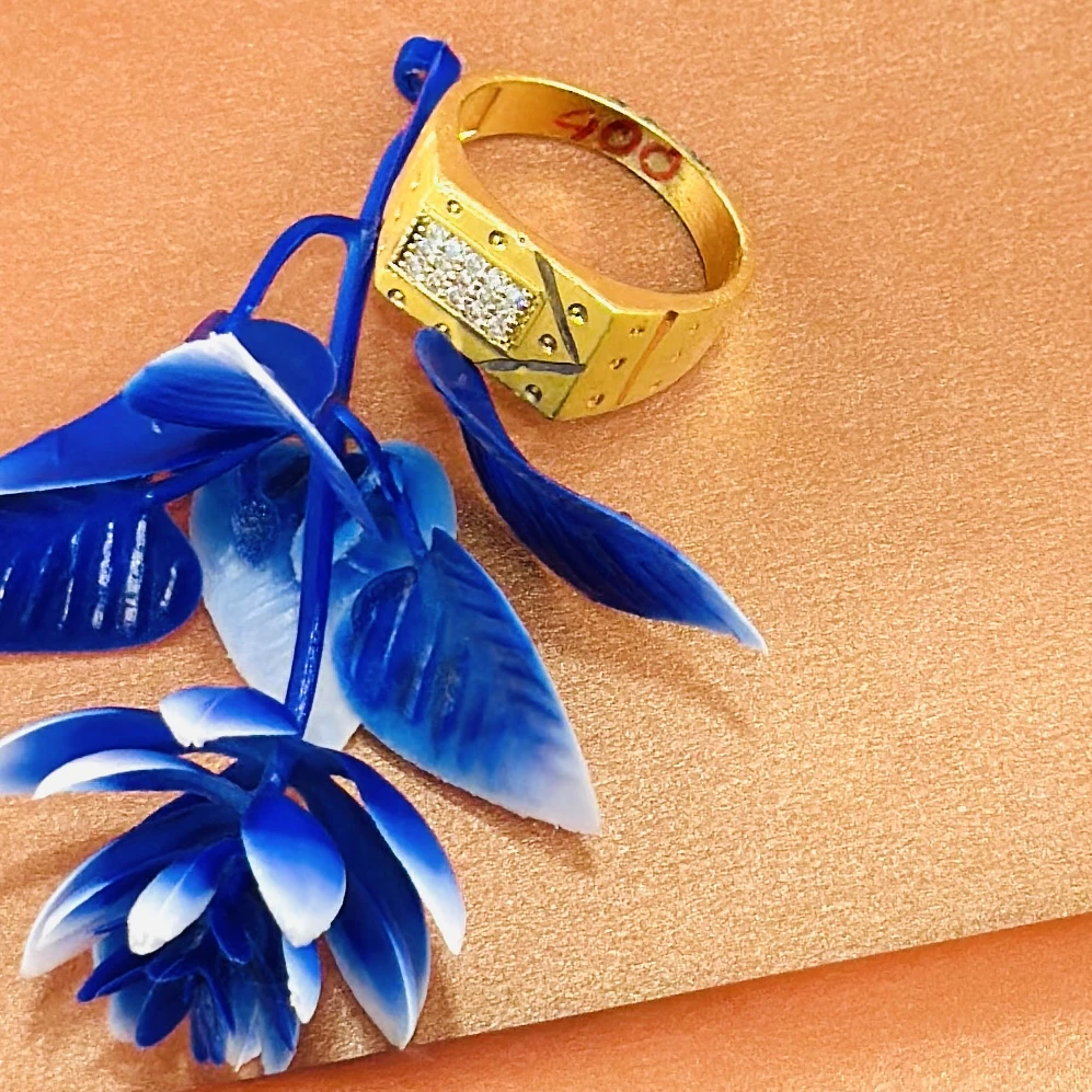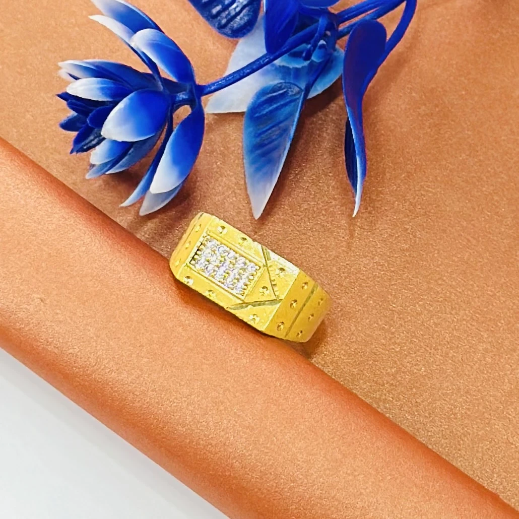 👉 Theme :- Gold gent's ring with a textured design and diamond accents.