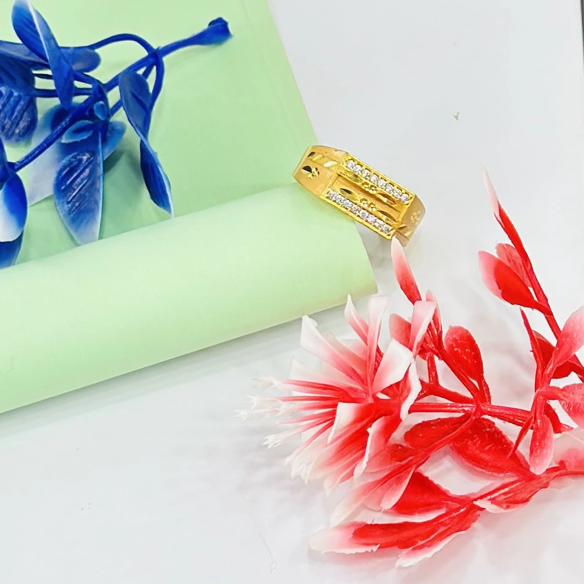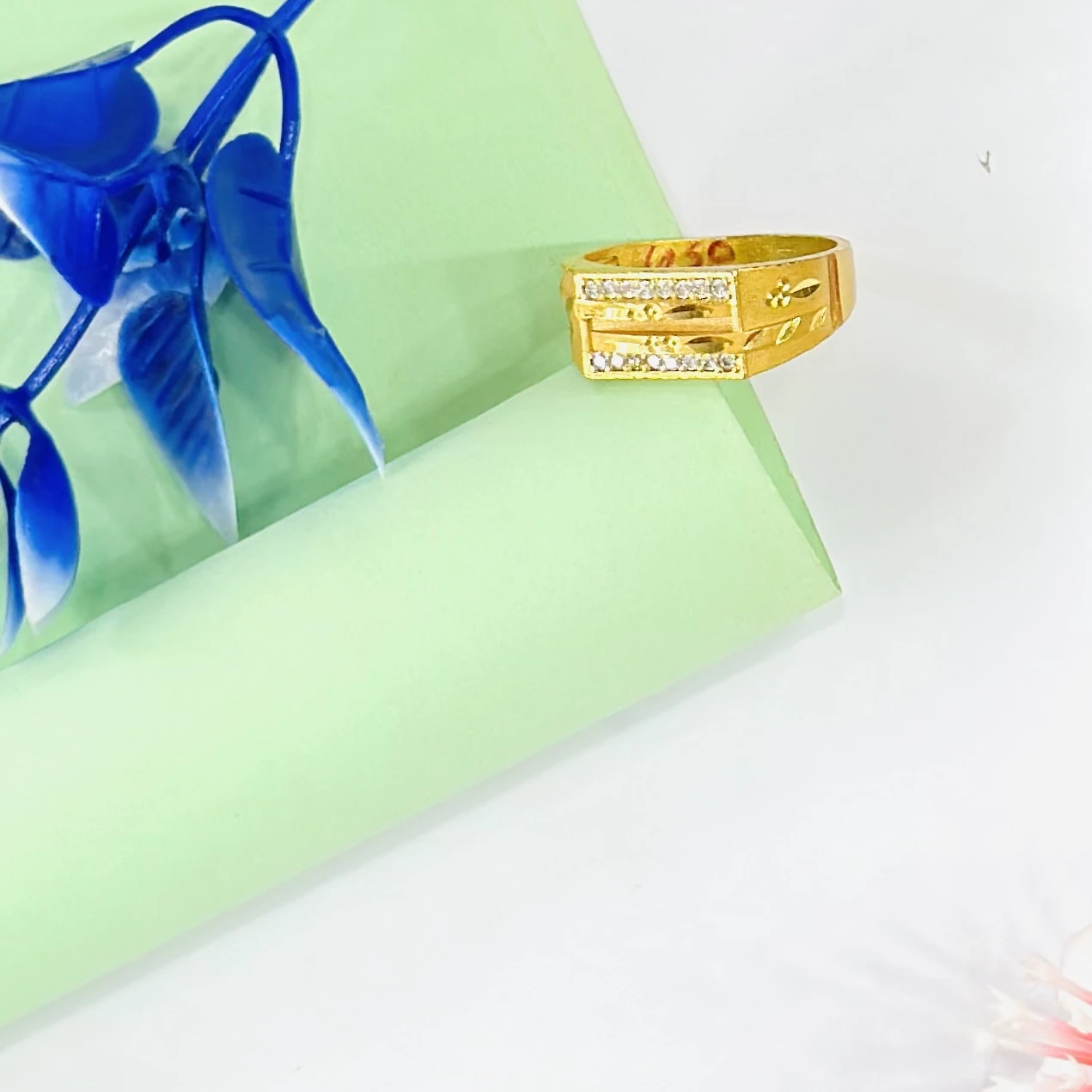 👉 Theme :- Gold gent's ring with a textured design and diamond accents.