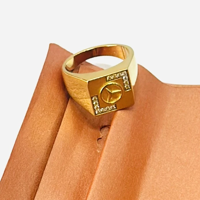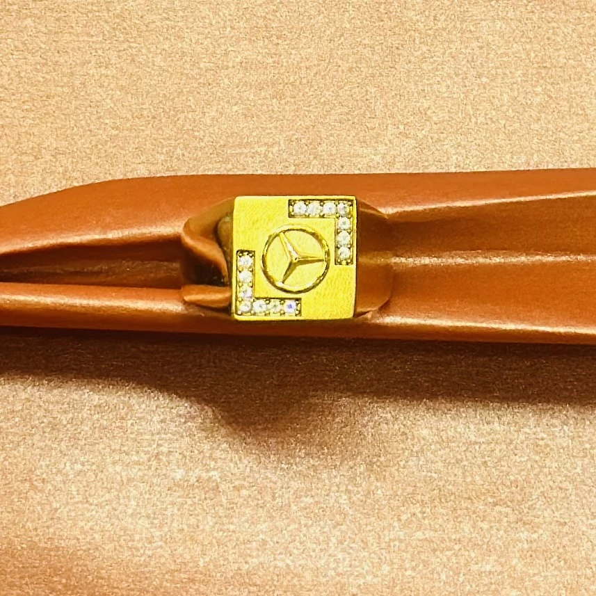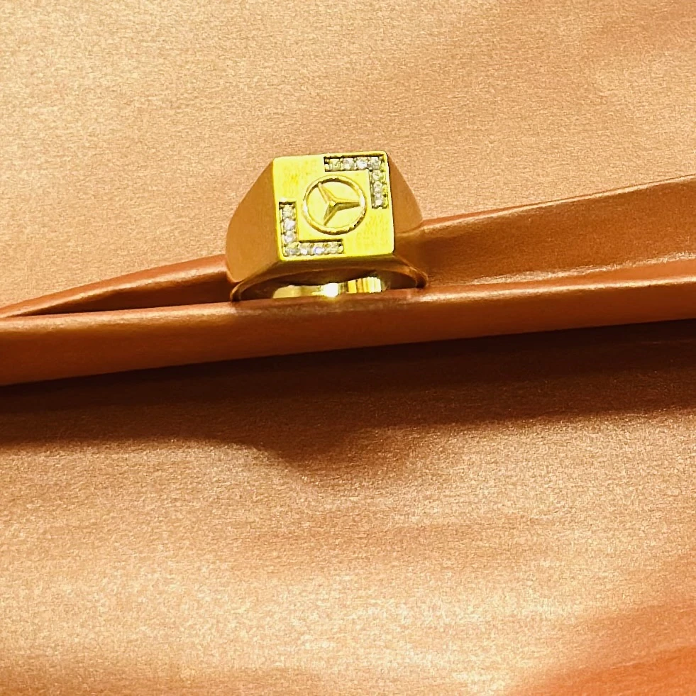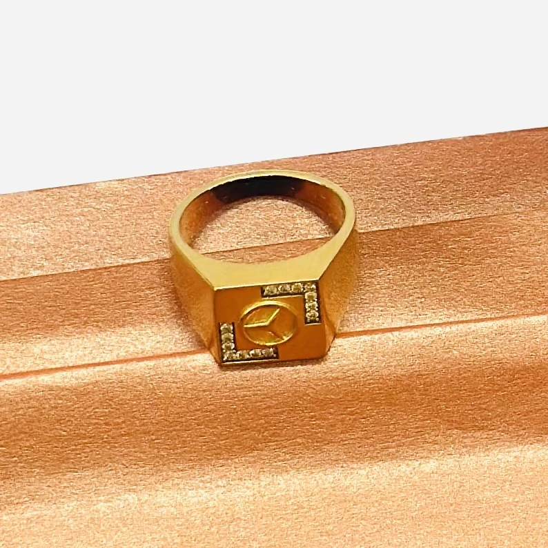 👉 Theme :- Gold plated men's finger ring with a Mercedes-Benz logo and diamond accents