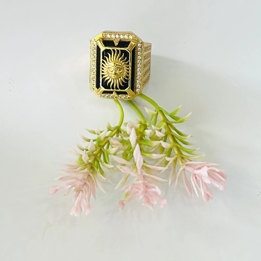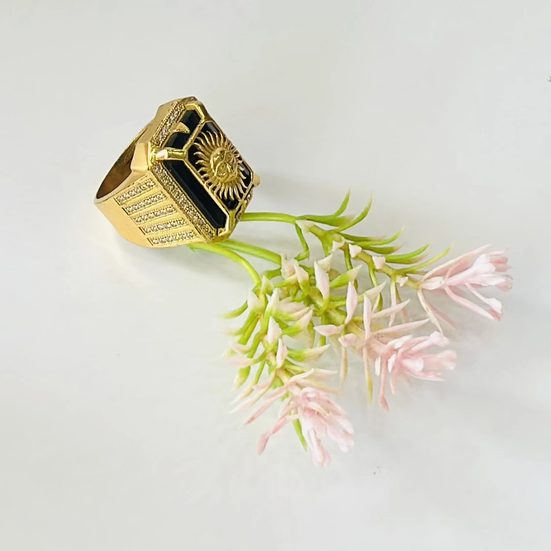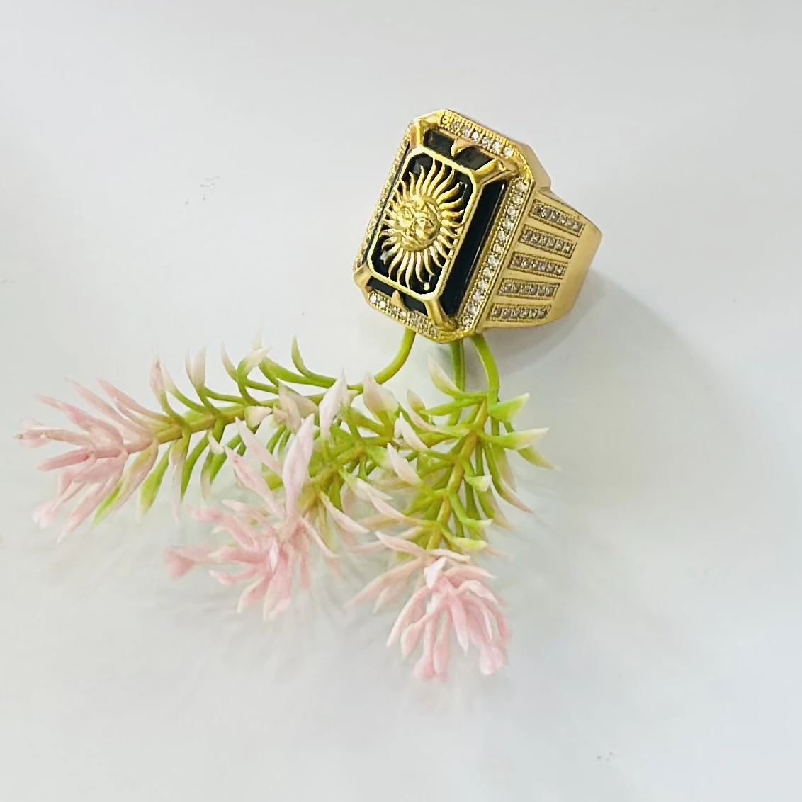 👉 Theme :- Gold plated men's ring featuring a sun emblem on a black background