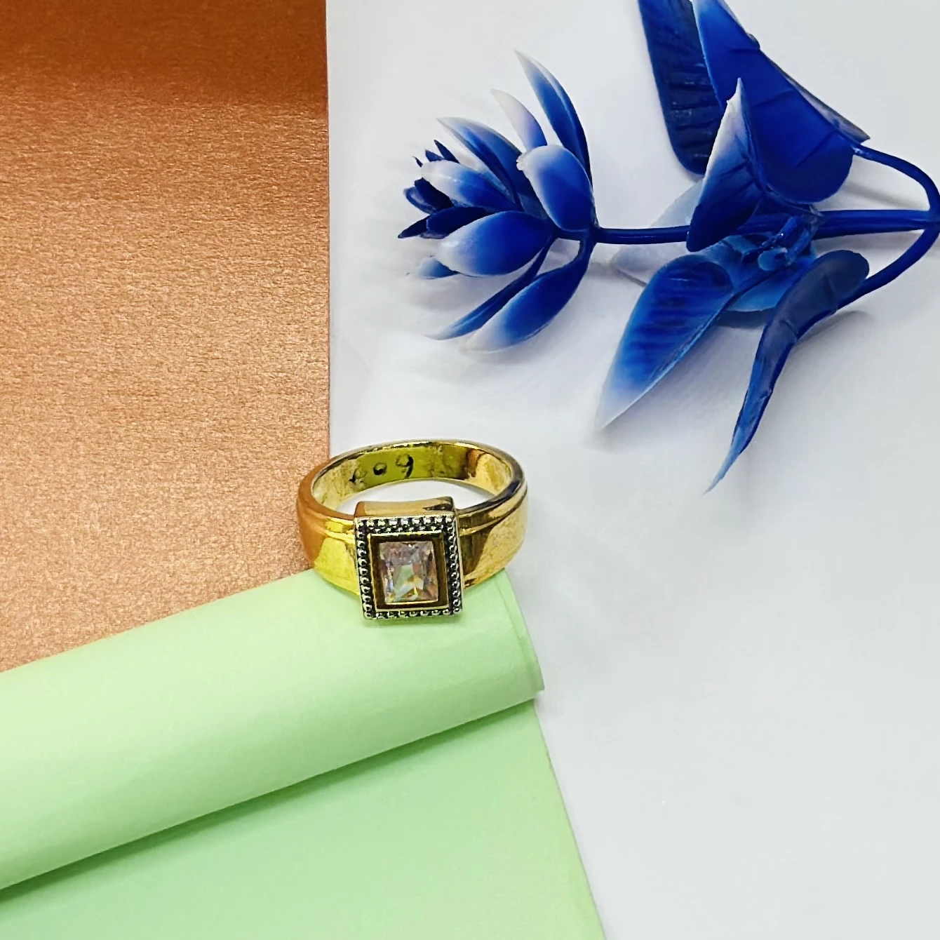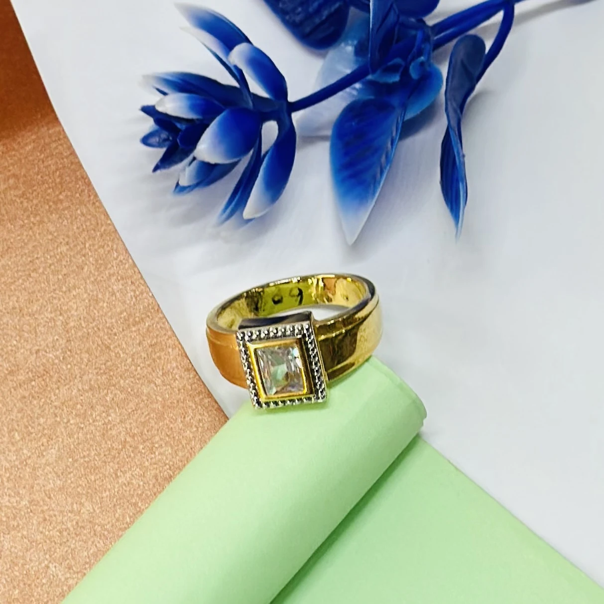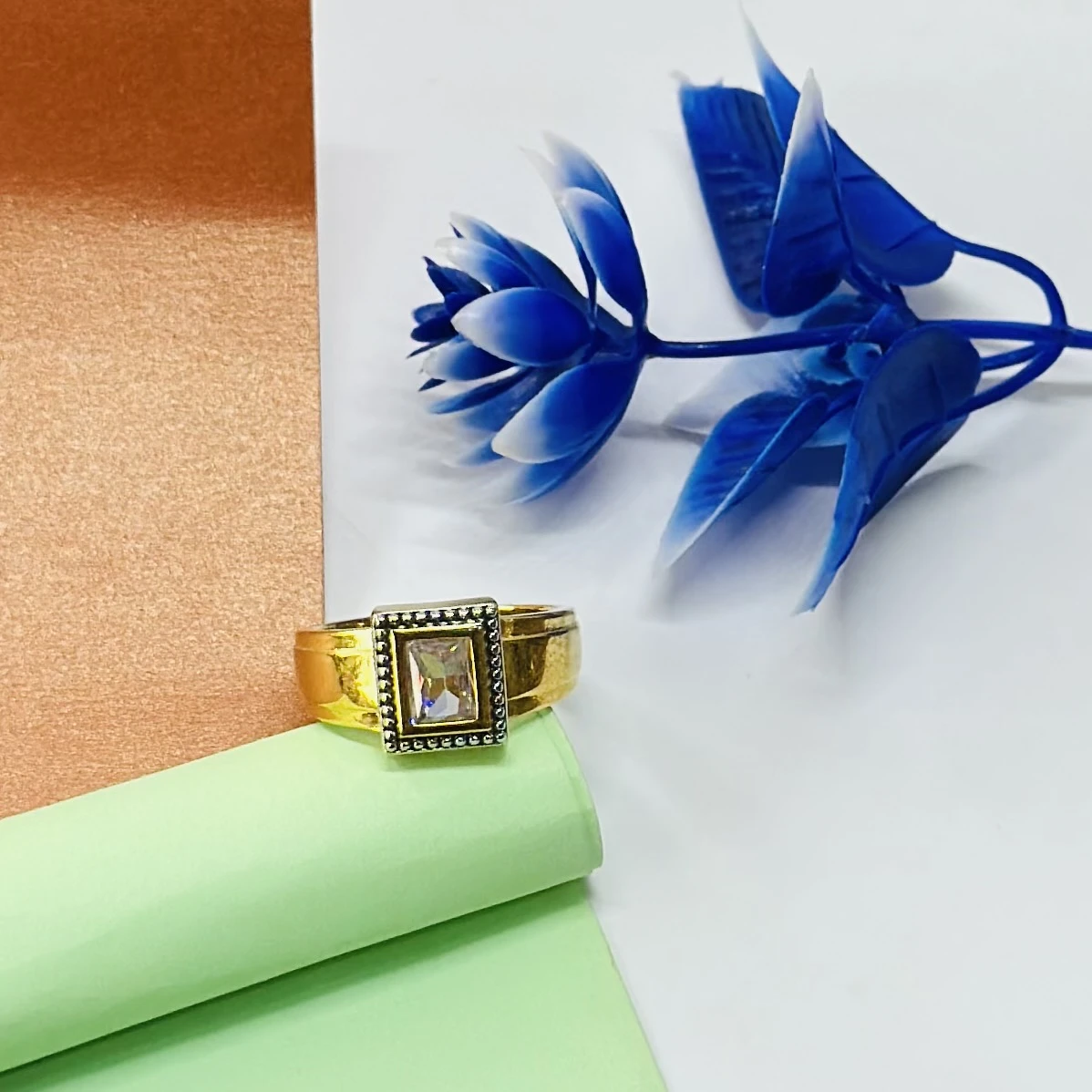Gold plated men's ring with a square-cut white stone center.
