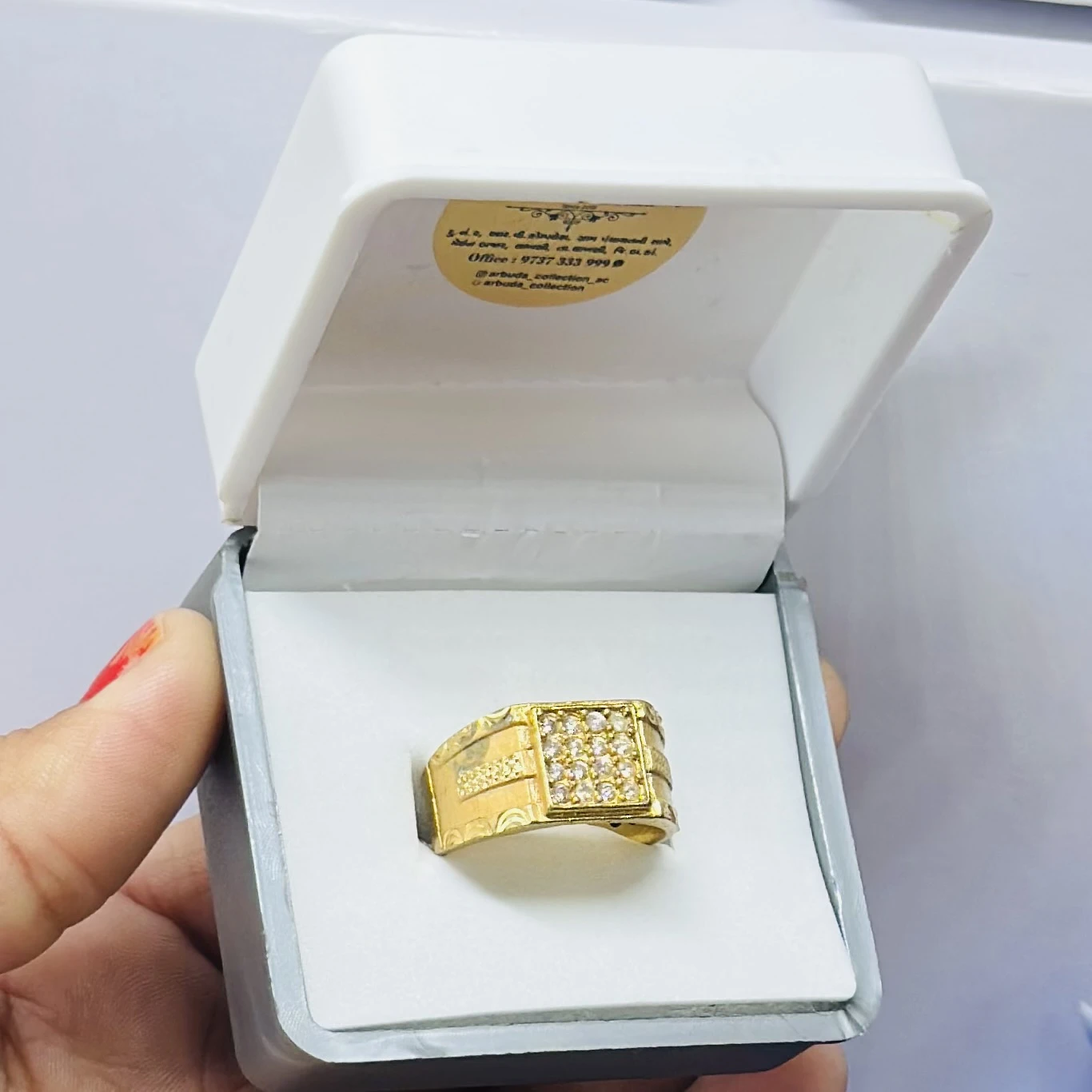 👉 Theme :- Gold plated men's ring with a square face featuring a grid of small, clear stones.