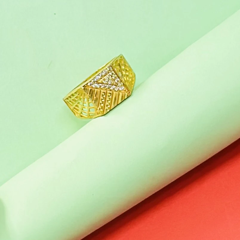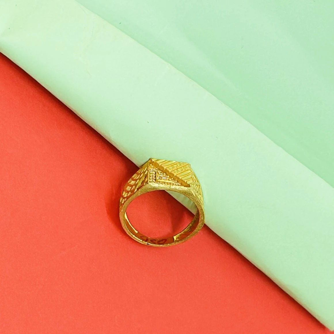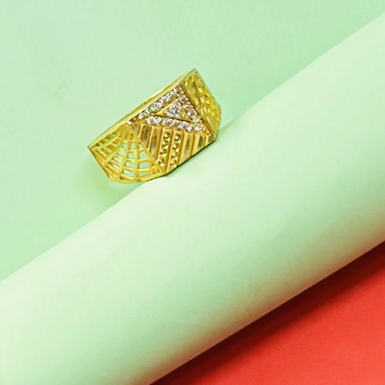 👉 Theme :- Gold gent's ring with a textured design and diamond accents.