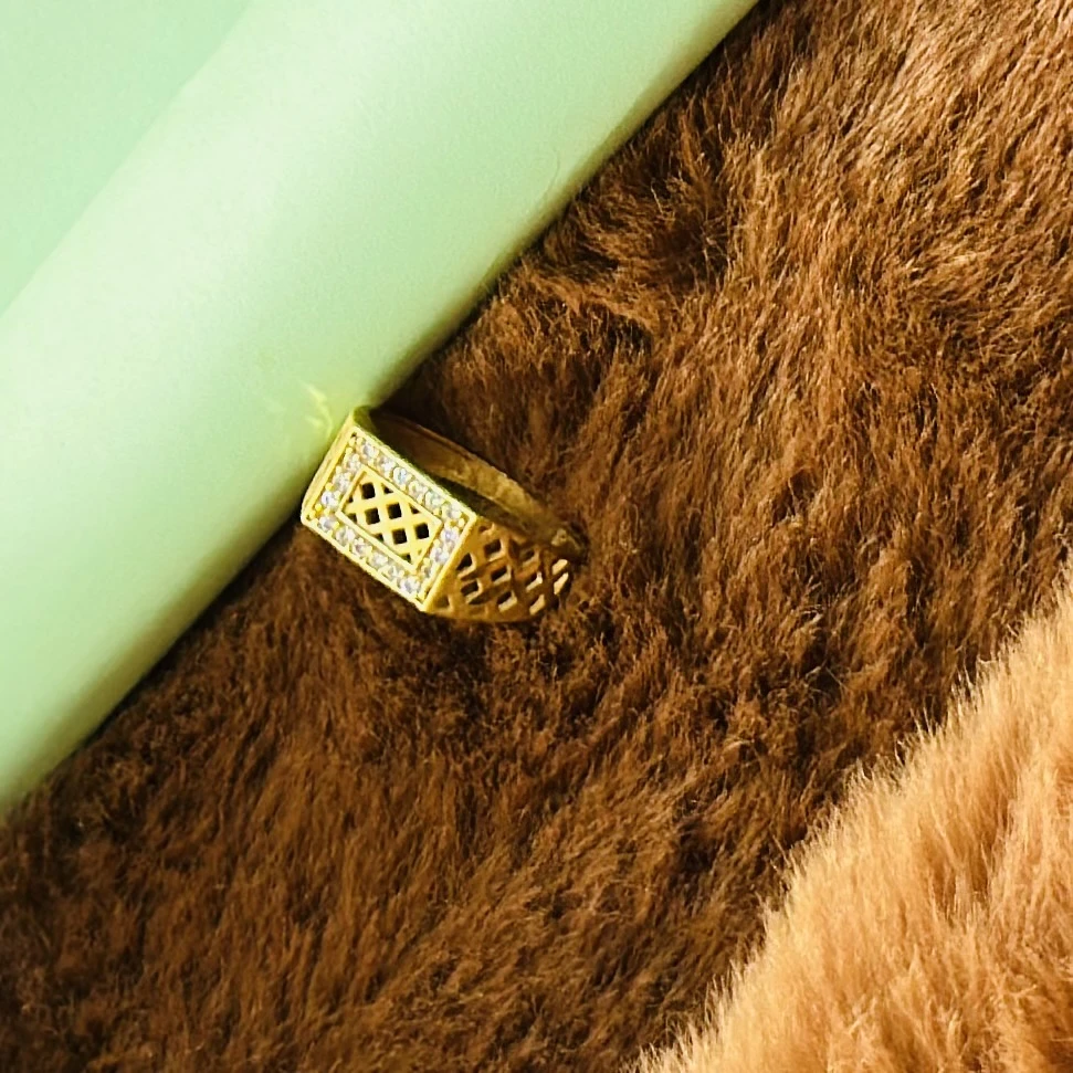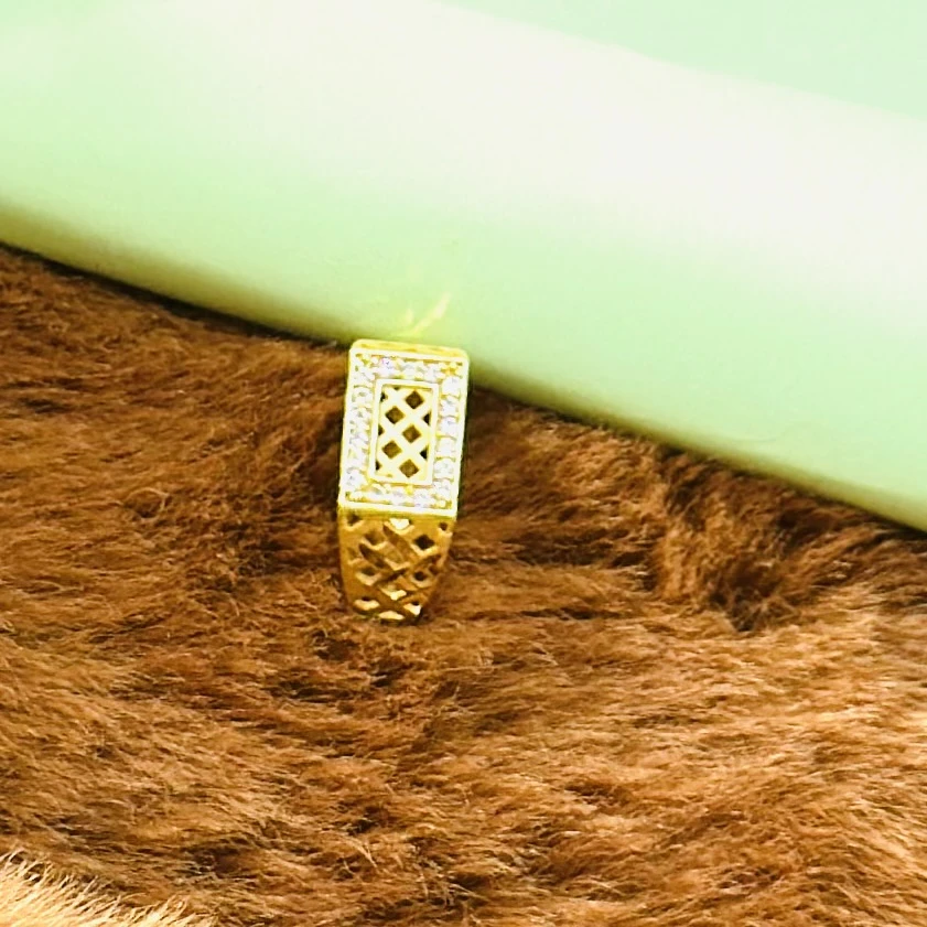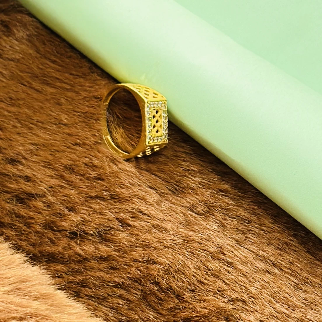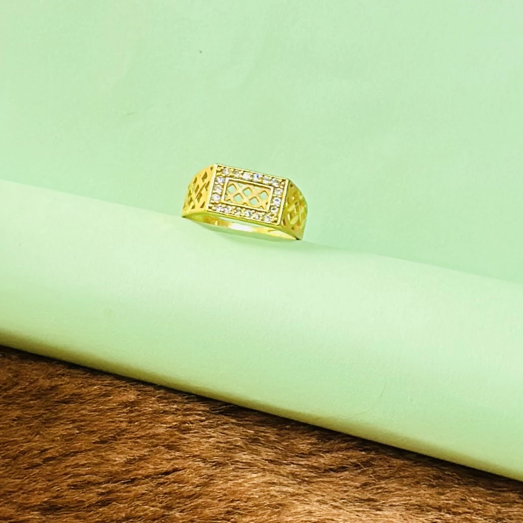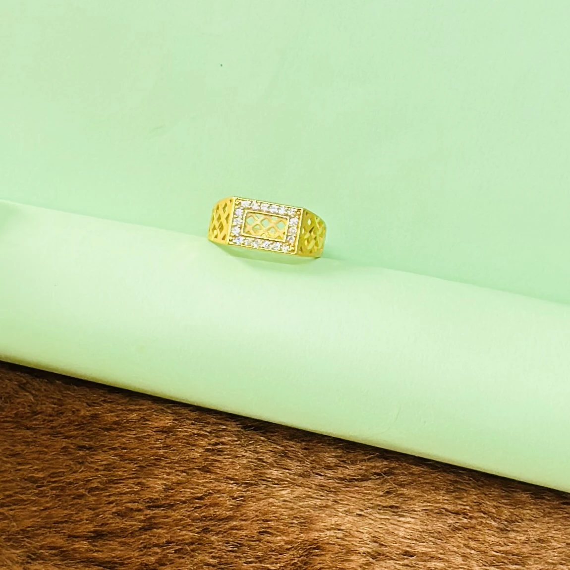 👉 Theme :- Gold gent's ring with a textured design and diamond accents.