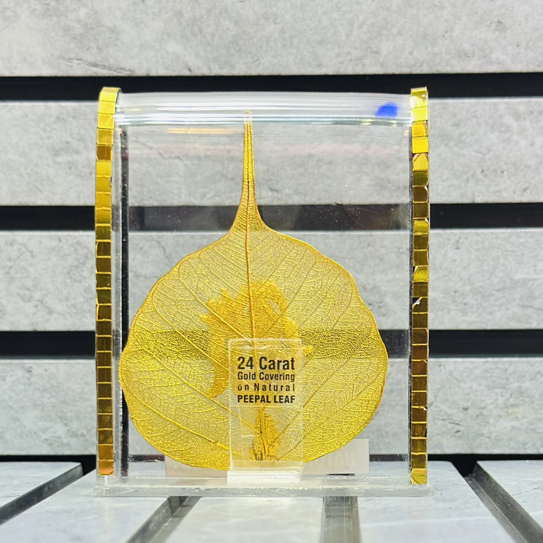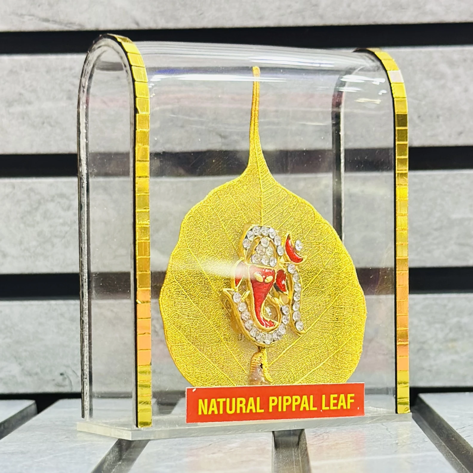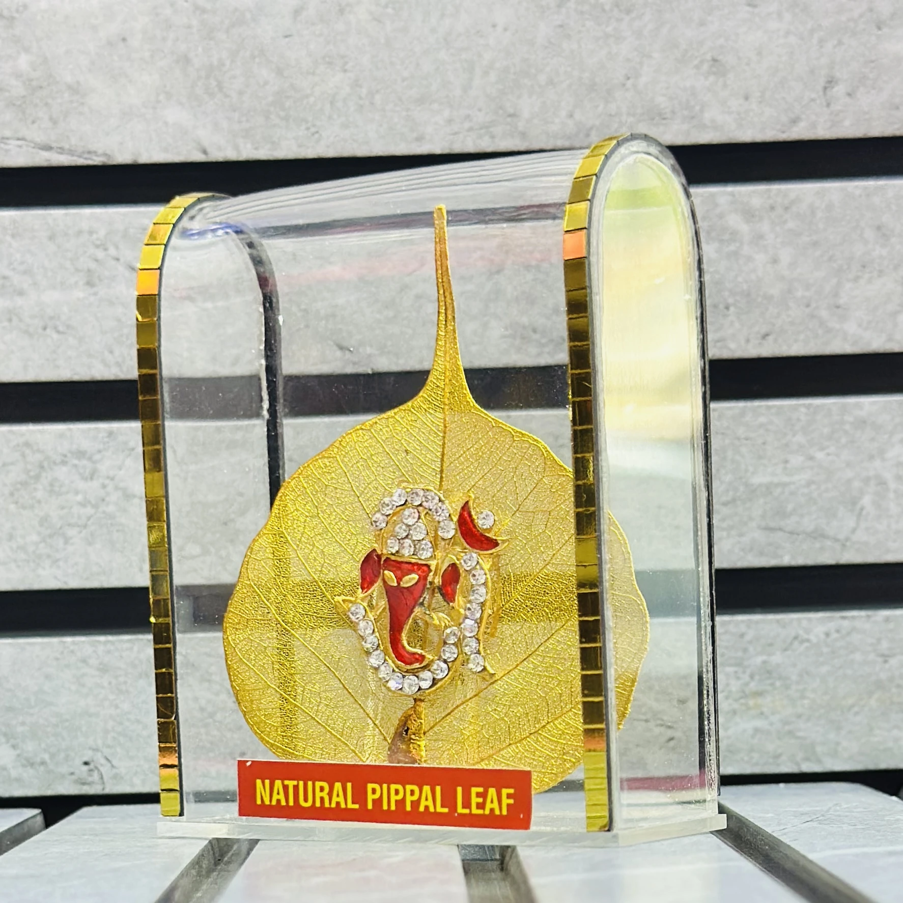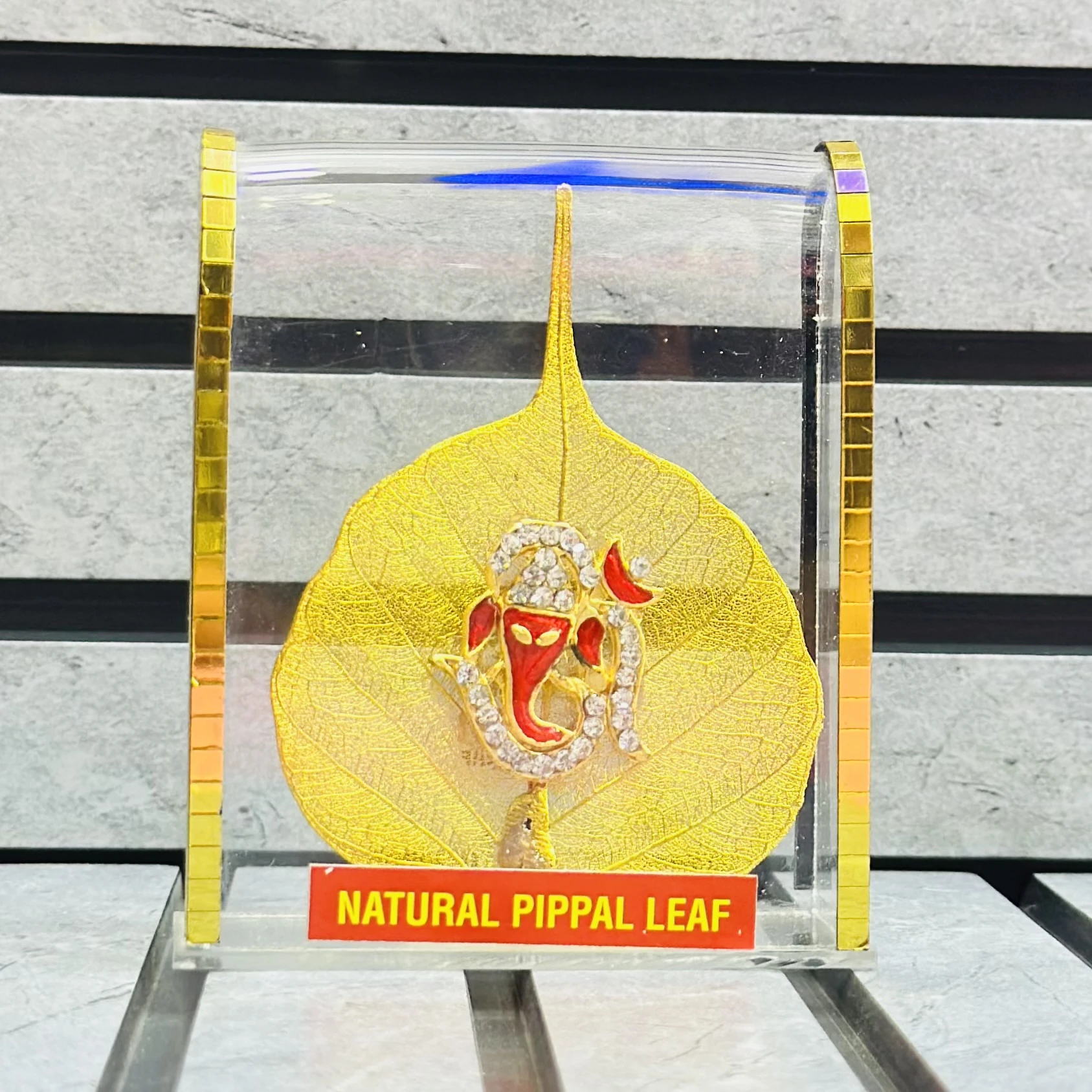👉 Theme :- gold-plated natural pipal leaf featuring a small idol of the Hindu deity Ganesha, encased in a transparent plastic case.