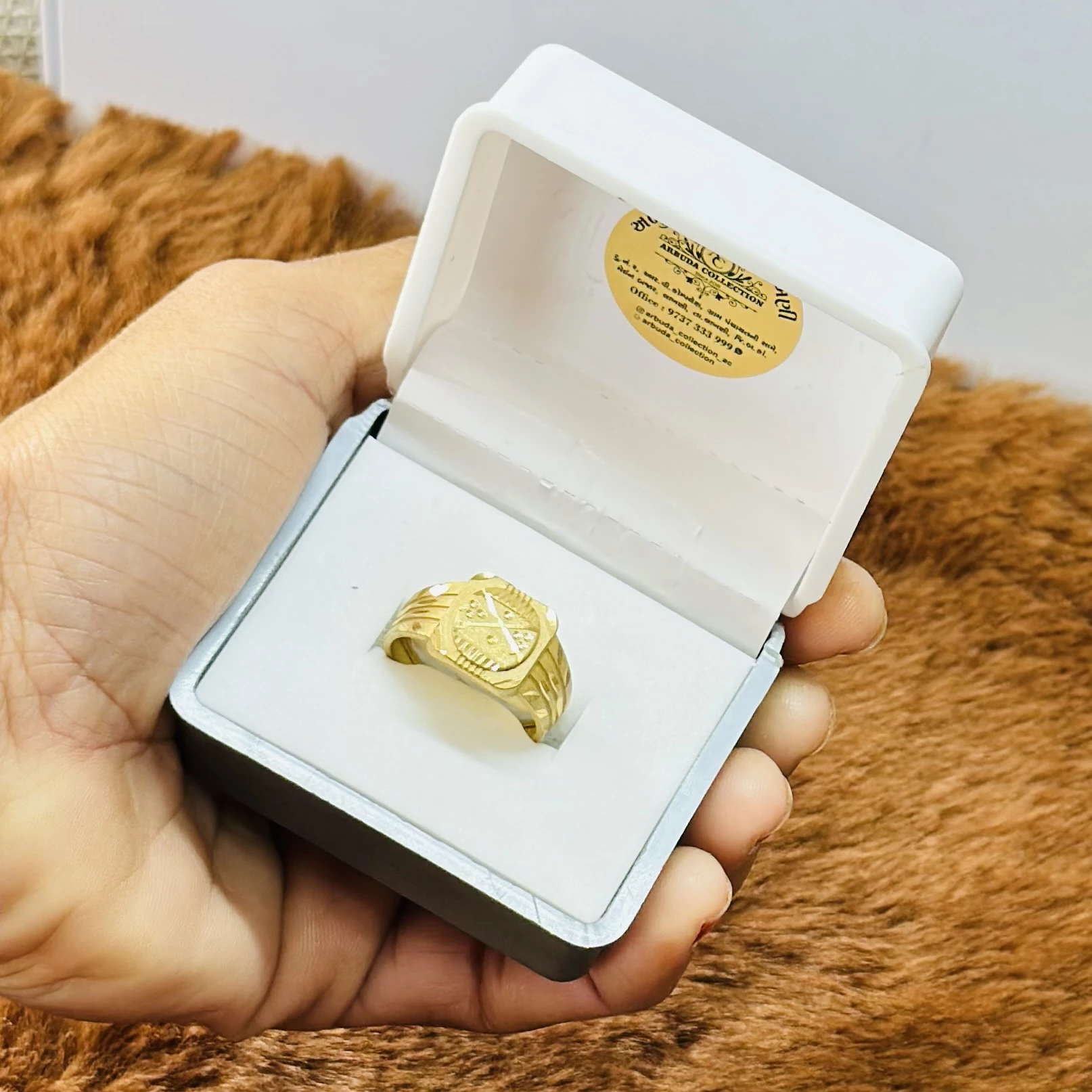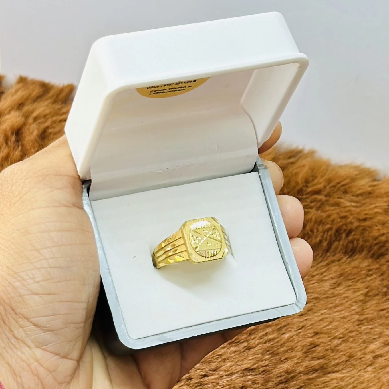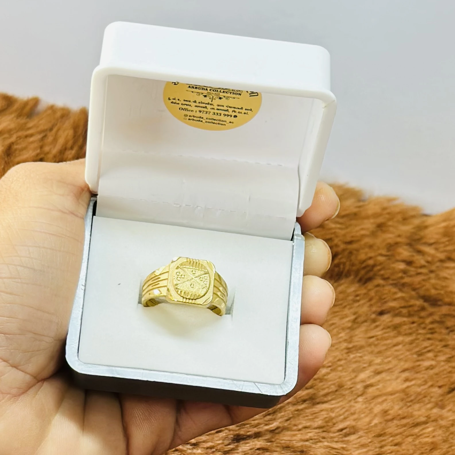👉 Theme :- Gold gent's ring with a textured design and diamond accents.