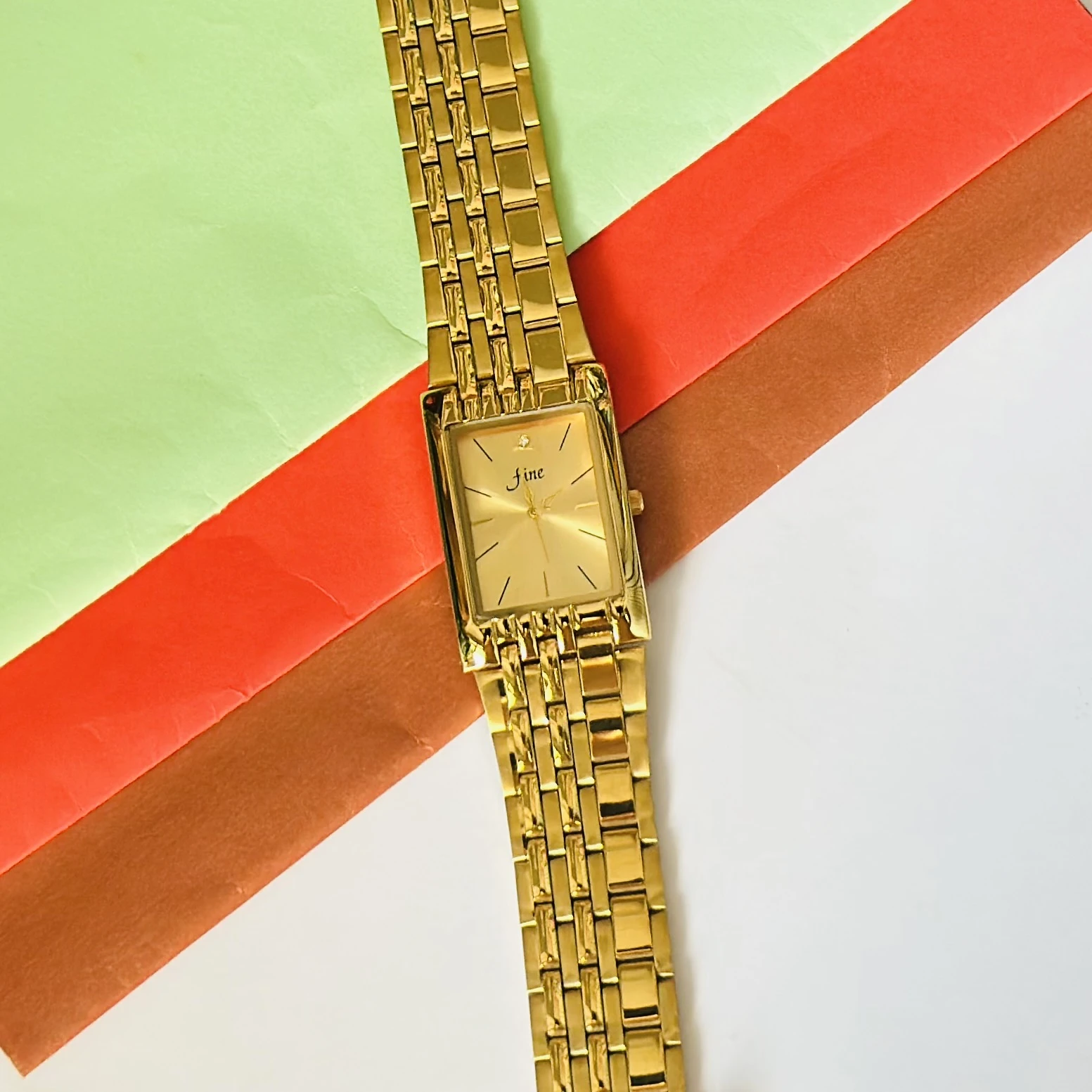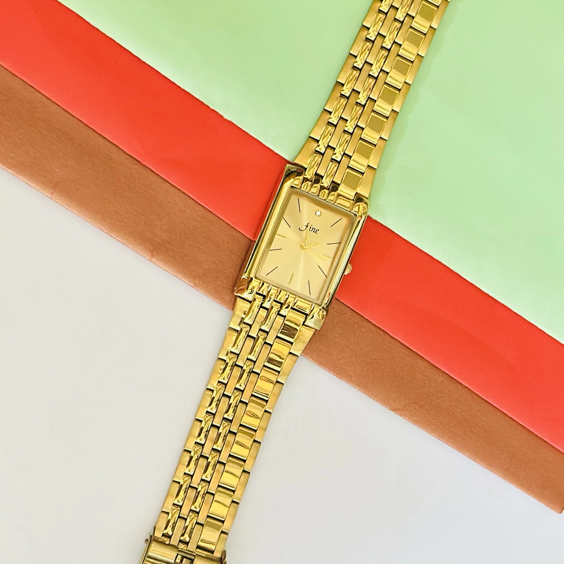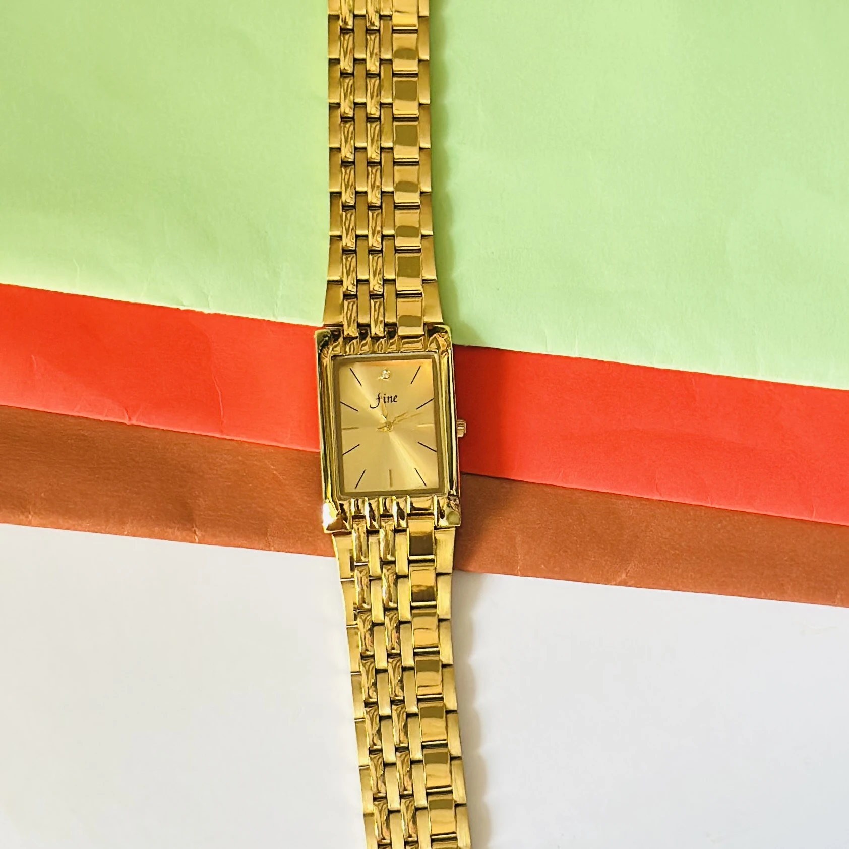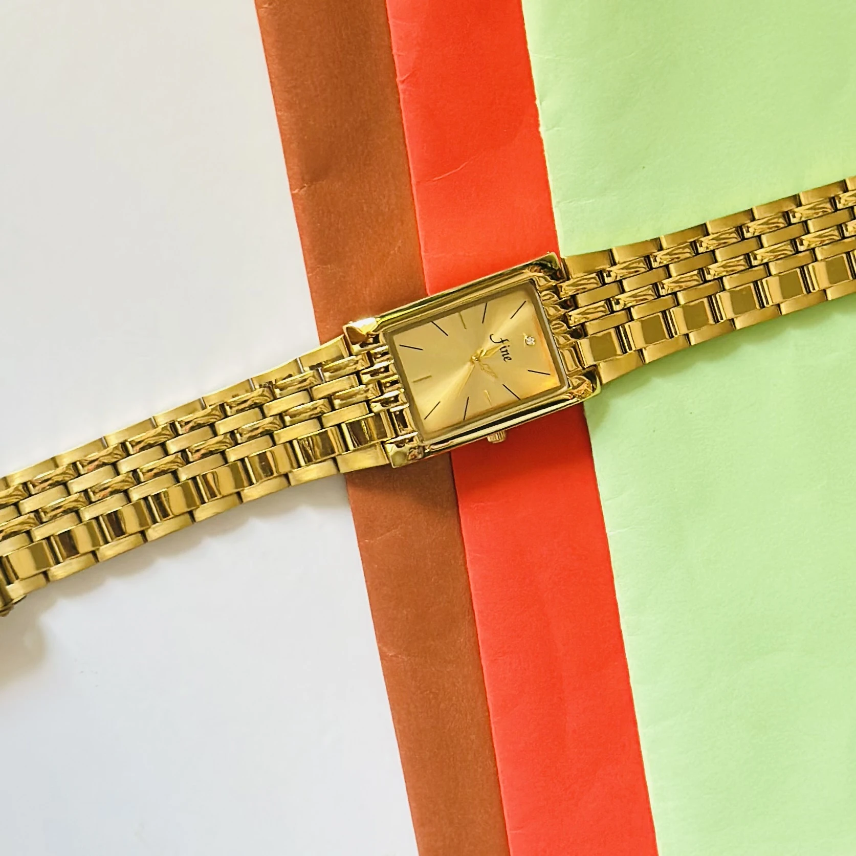 gold-plated quartz analog watch with a rectangular dial and metal bracelet.
