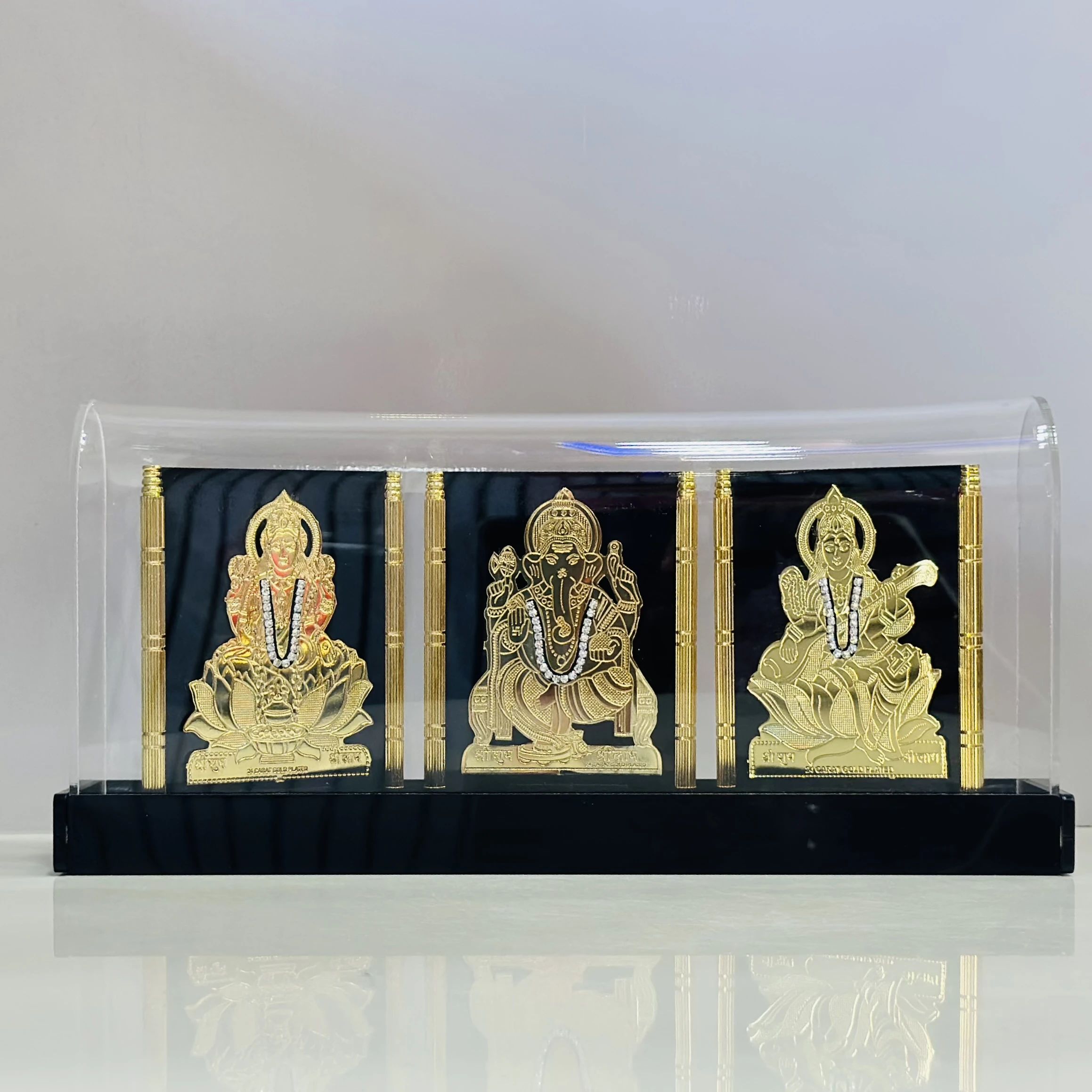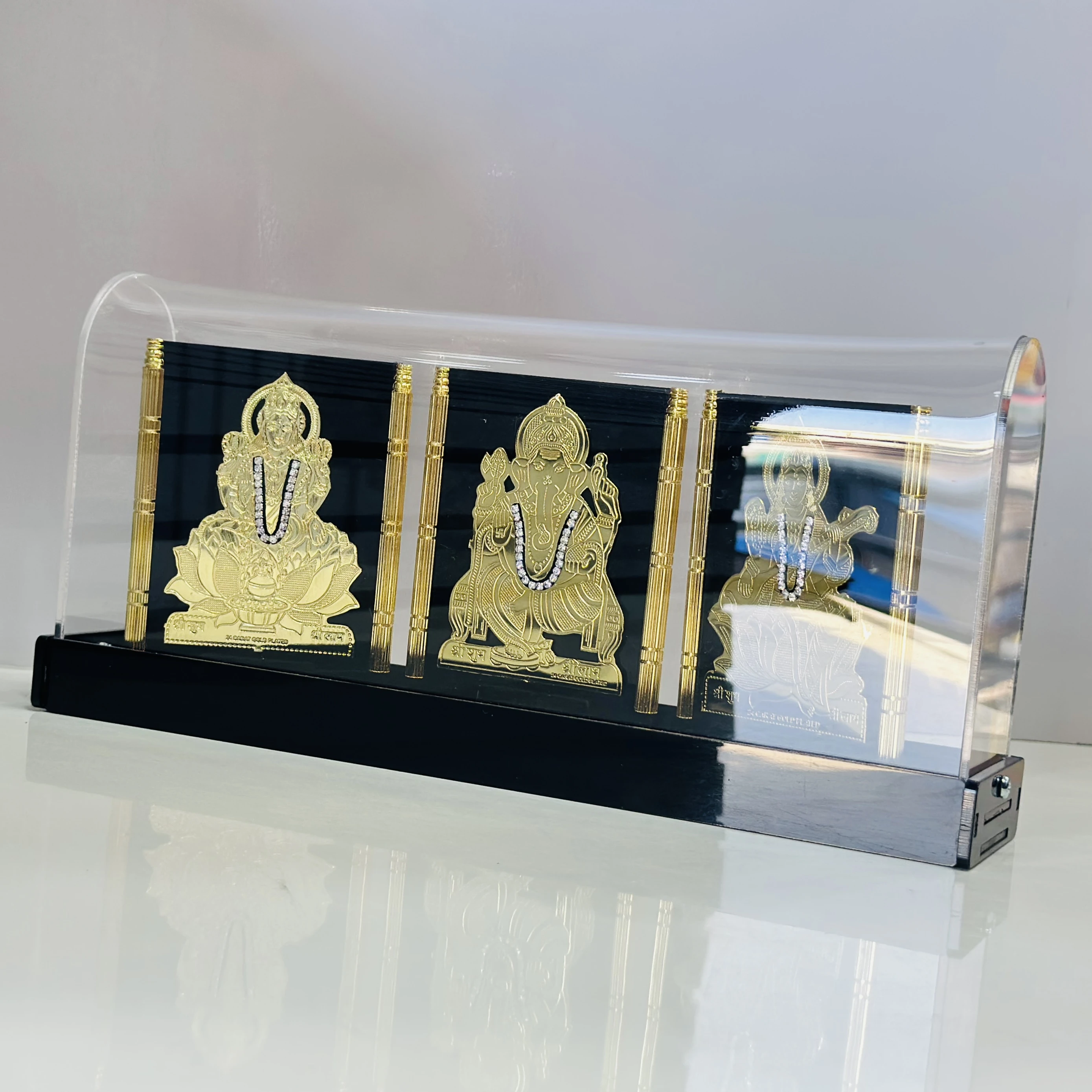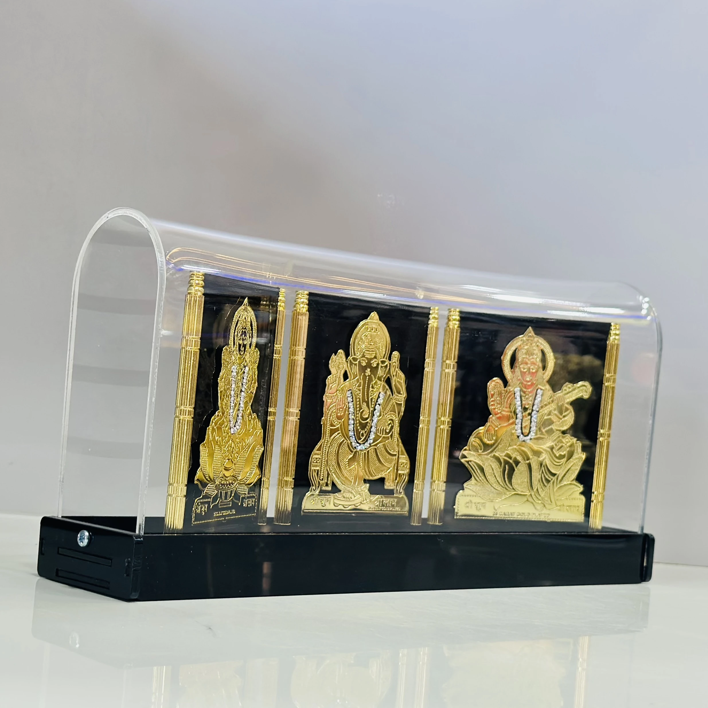 👉 Theme :- gold-plated showpiece featuring the Hindu deities Lakshmi, Ganesha, and Saraswati