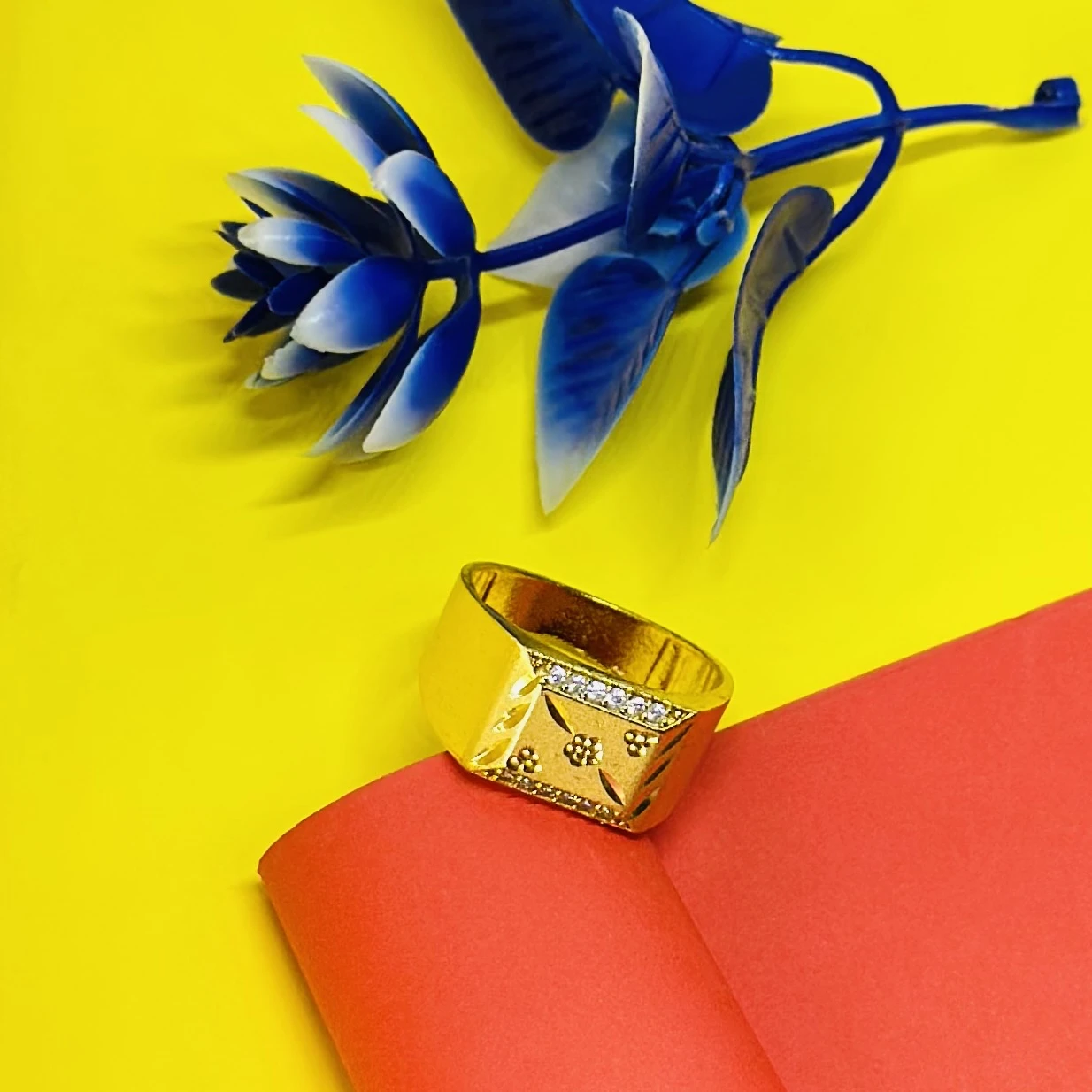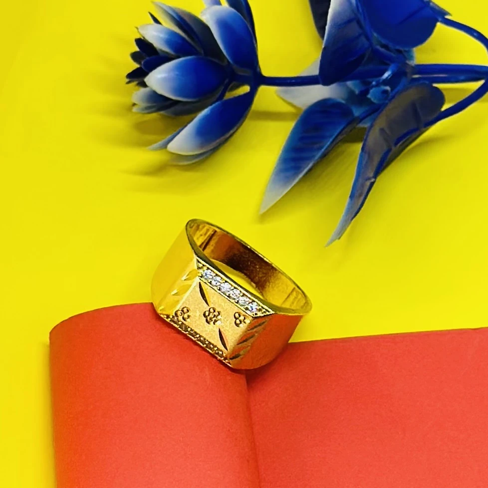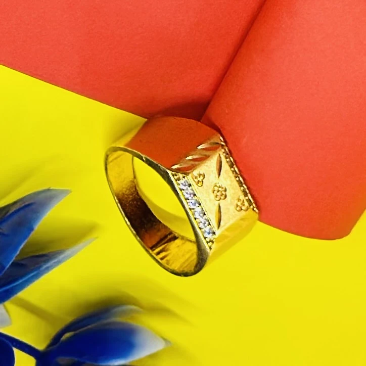 👉 Theme :- Gold gent's ring with a textured design and diamond accents.