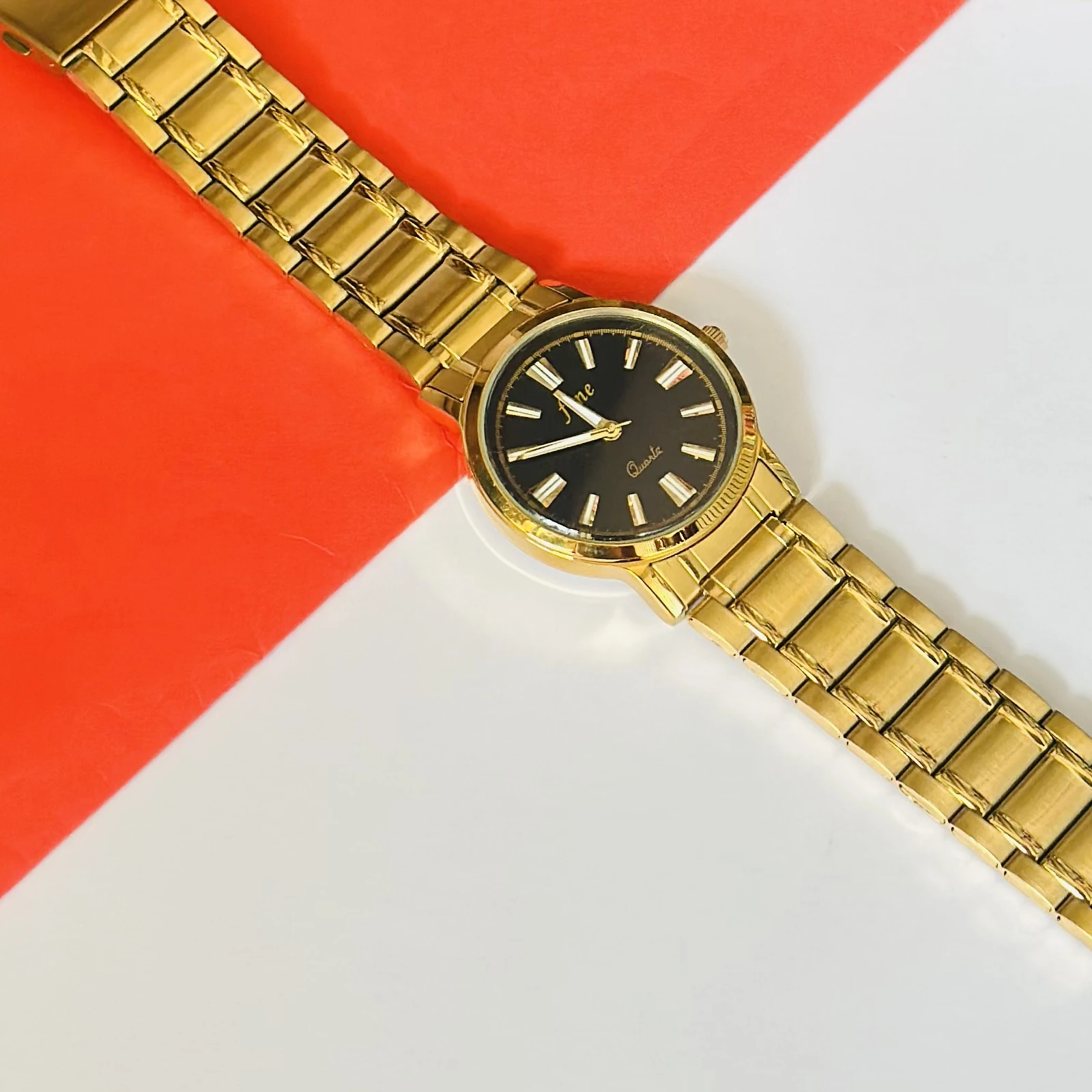 👉 Theme :- Gold plated stainless steel analog watch with a black dial.