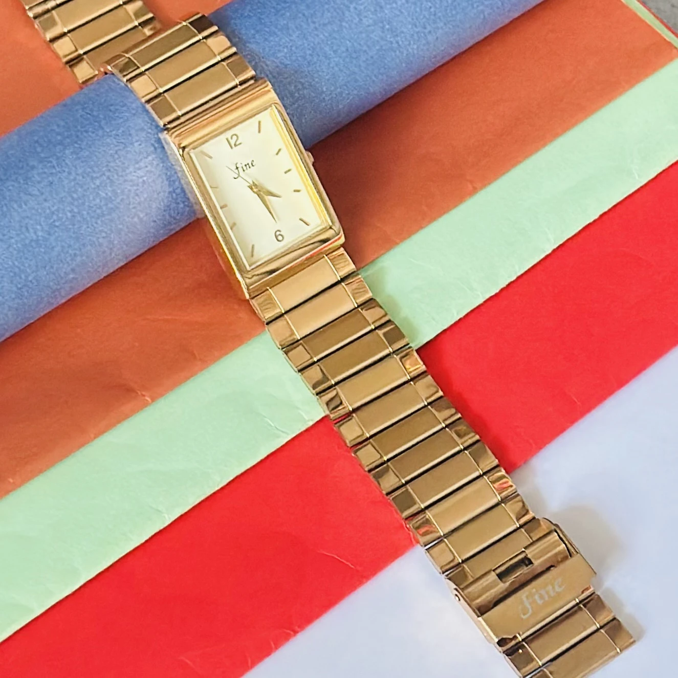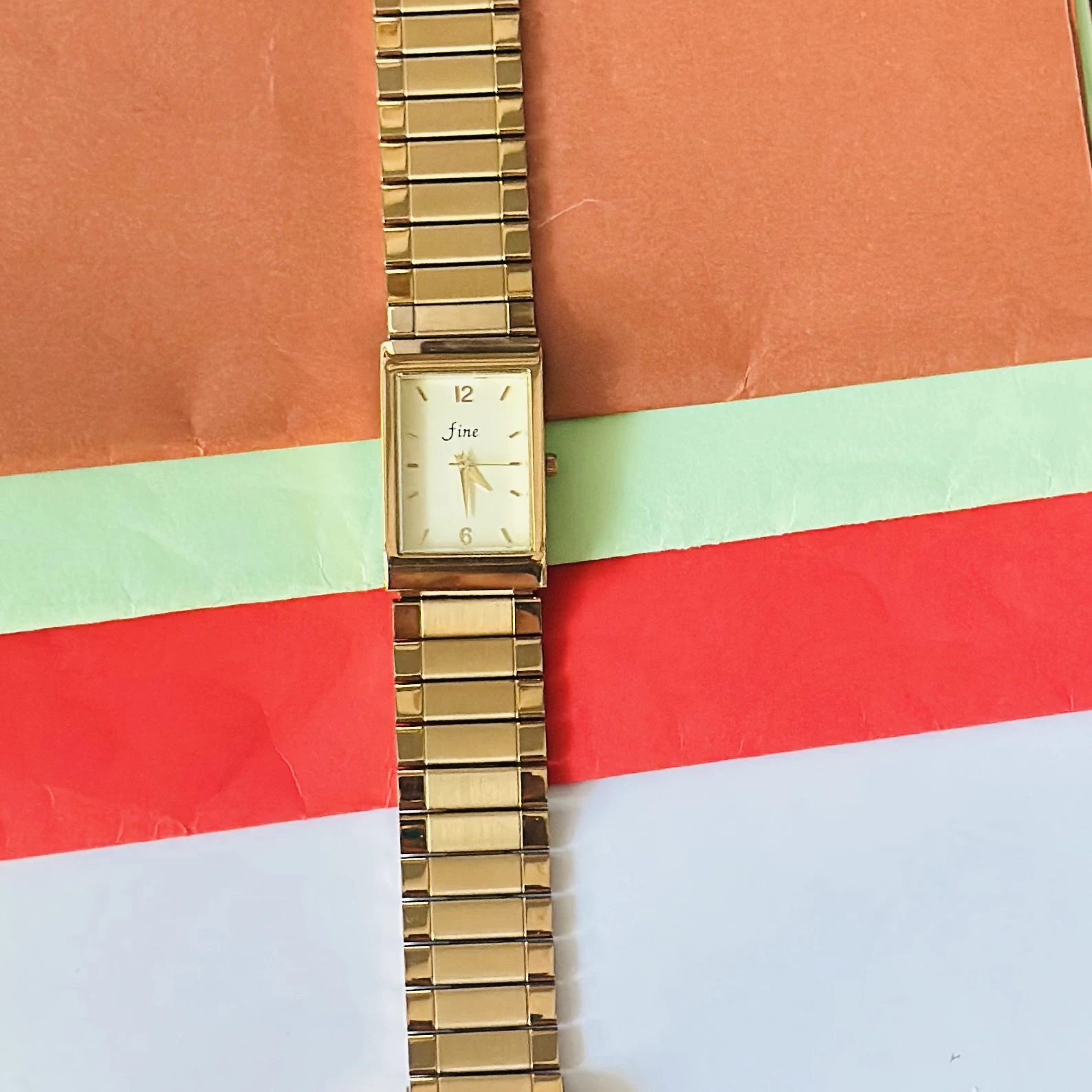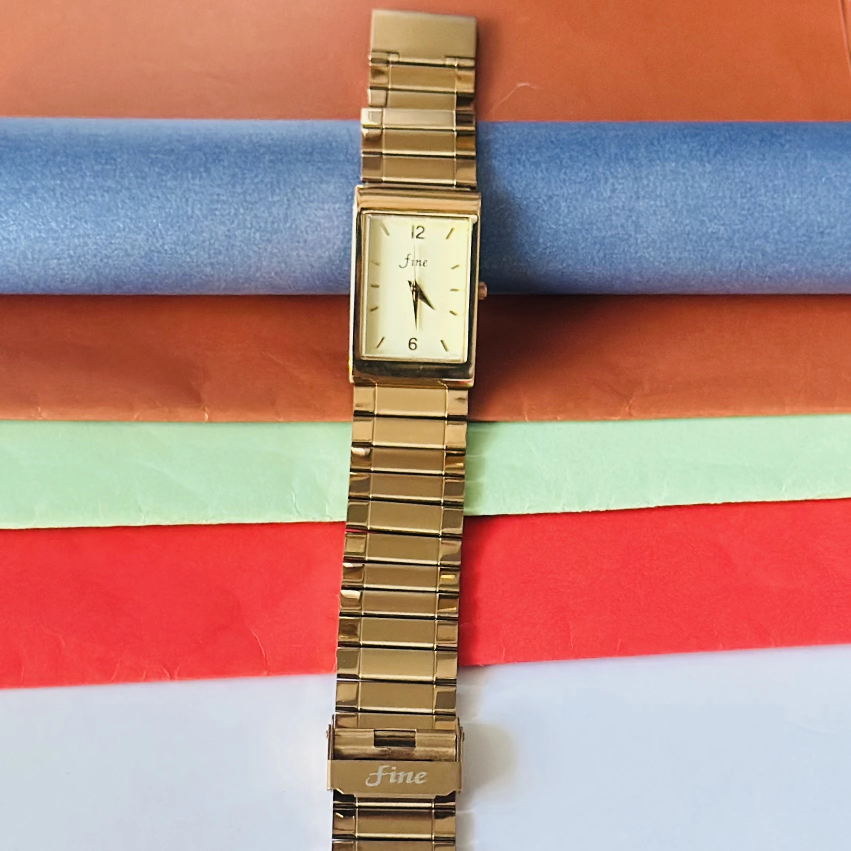 👉 Theme :- Gold tone analog quartz watch with a metal strap.