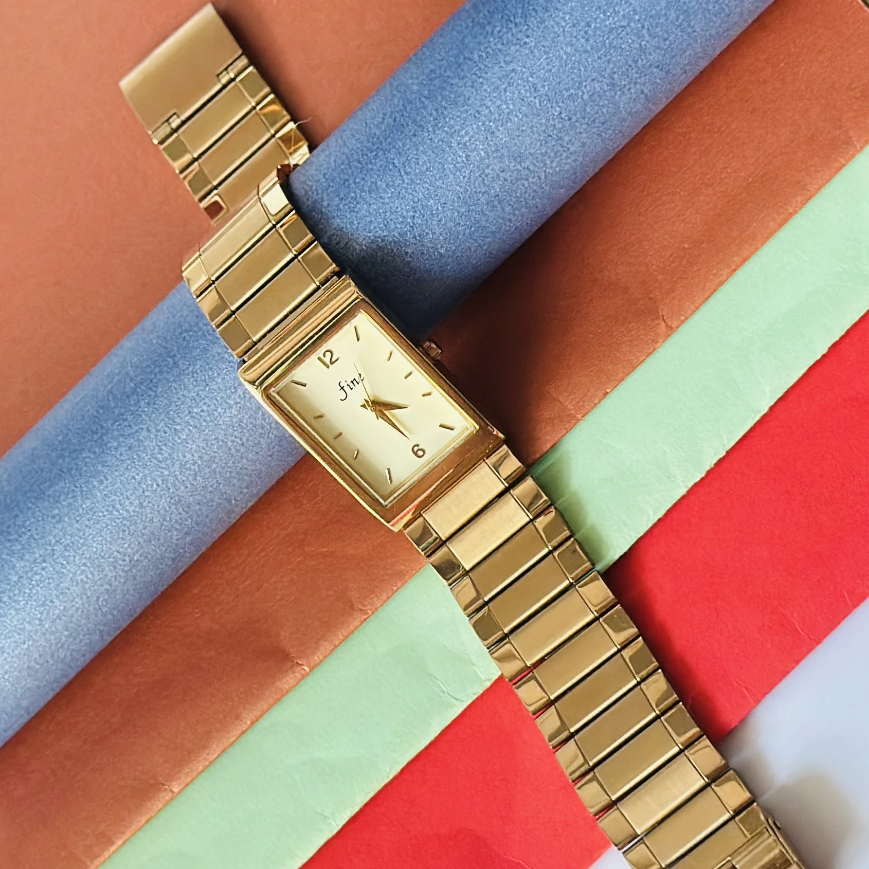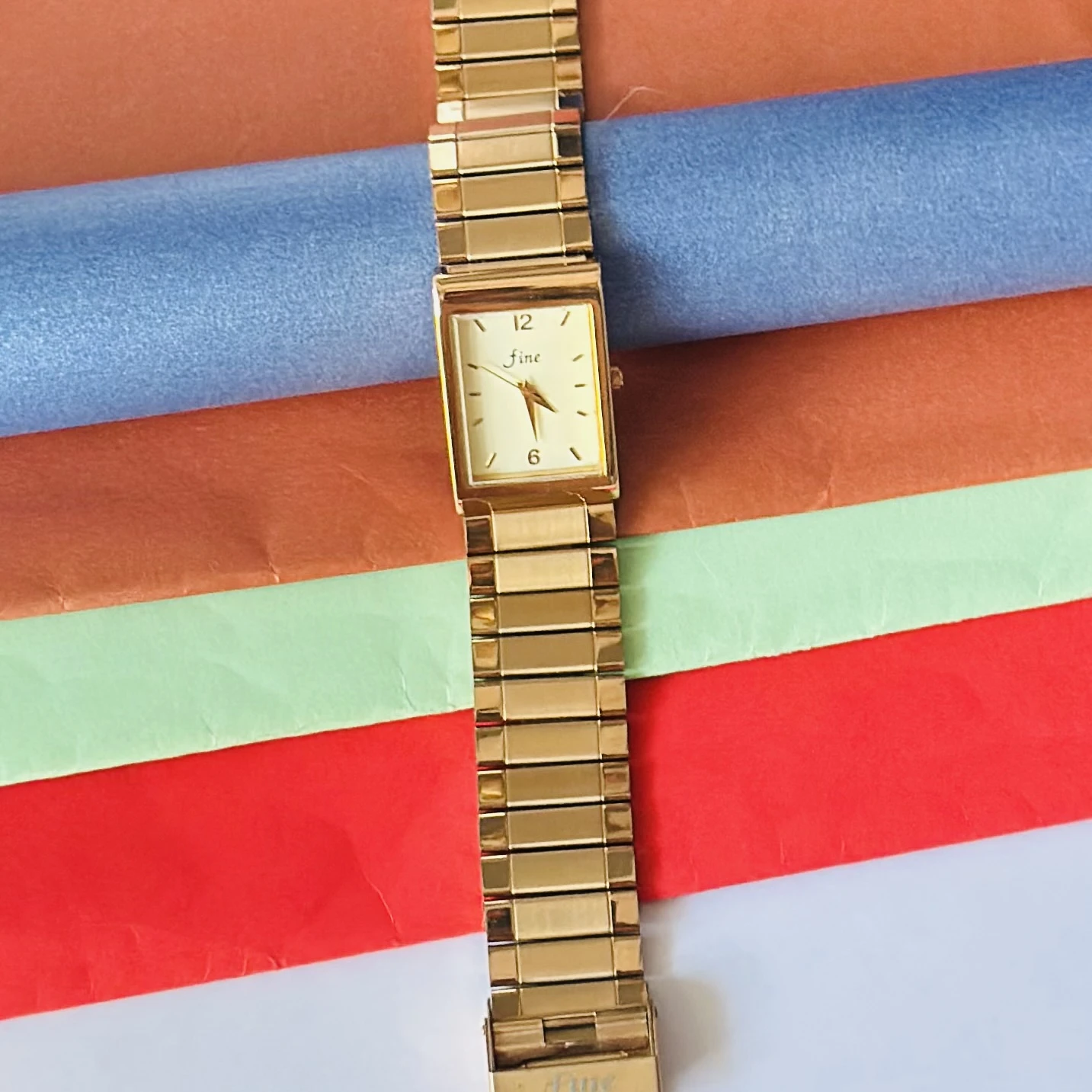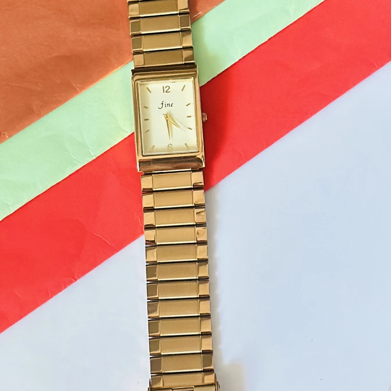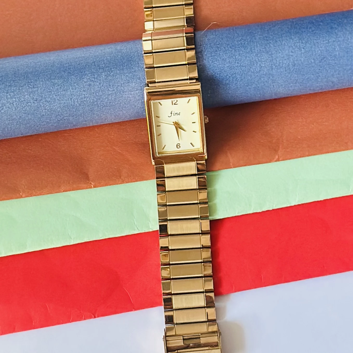👉 Theme :- Gold tone analog quartz watch with a metal strap.