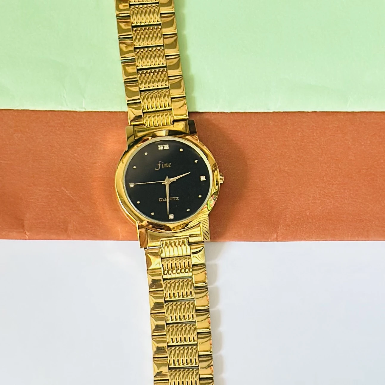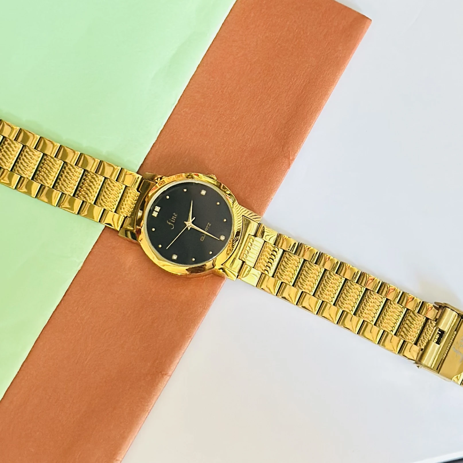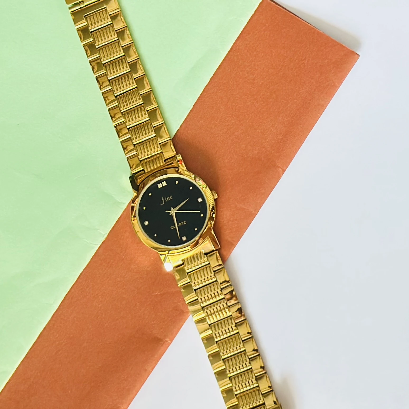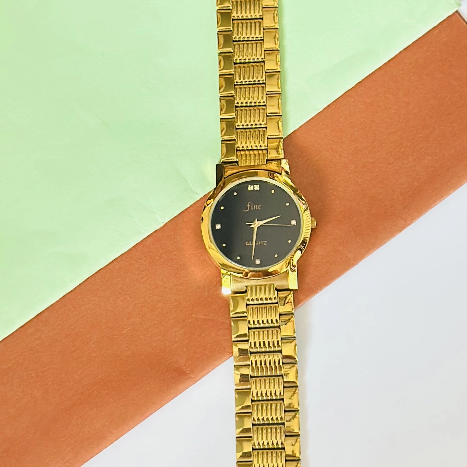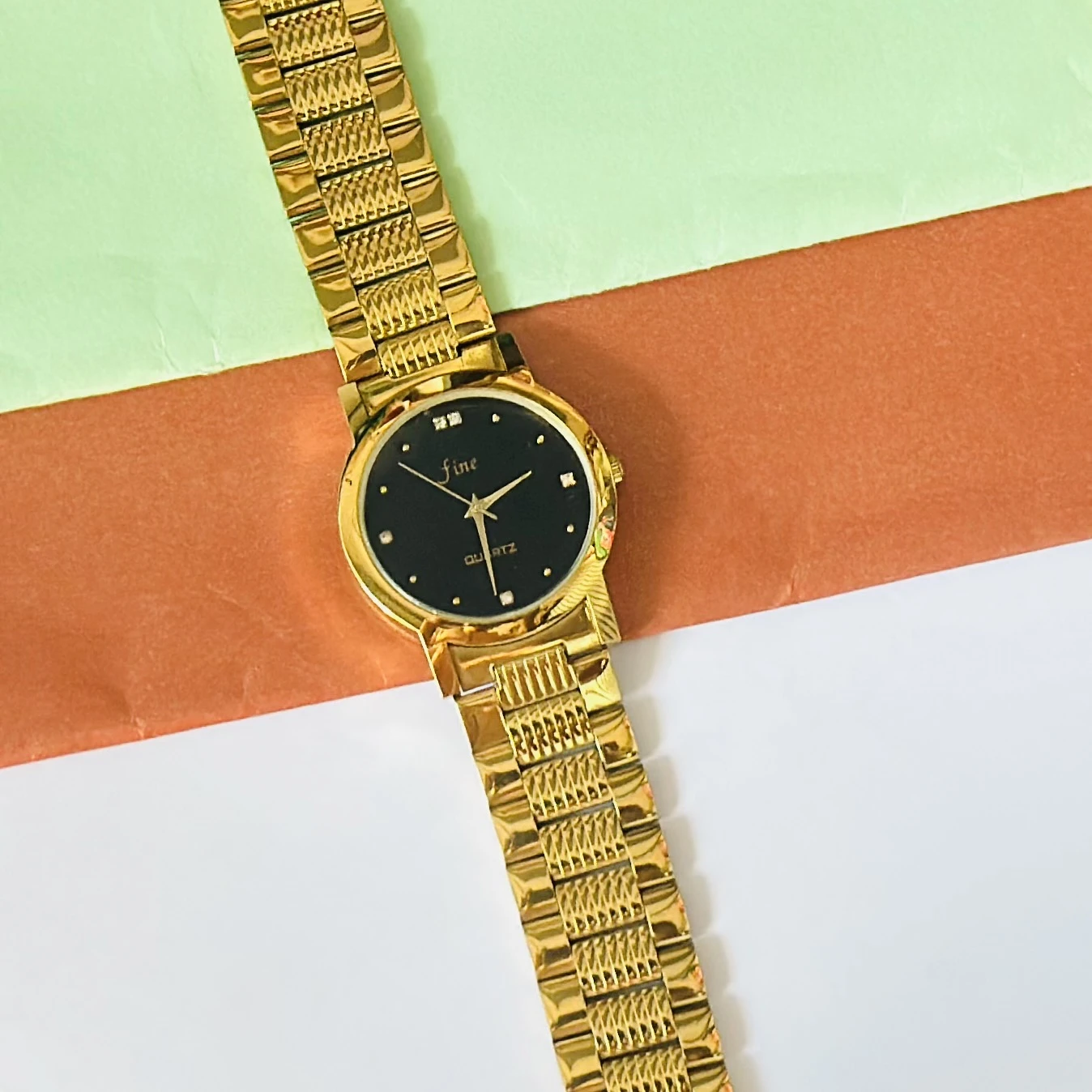👉 Theme :- Gold tone analog quartz watch with a metal strap.