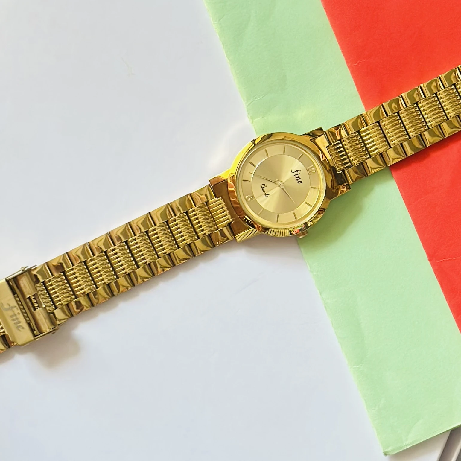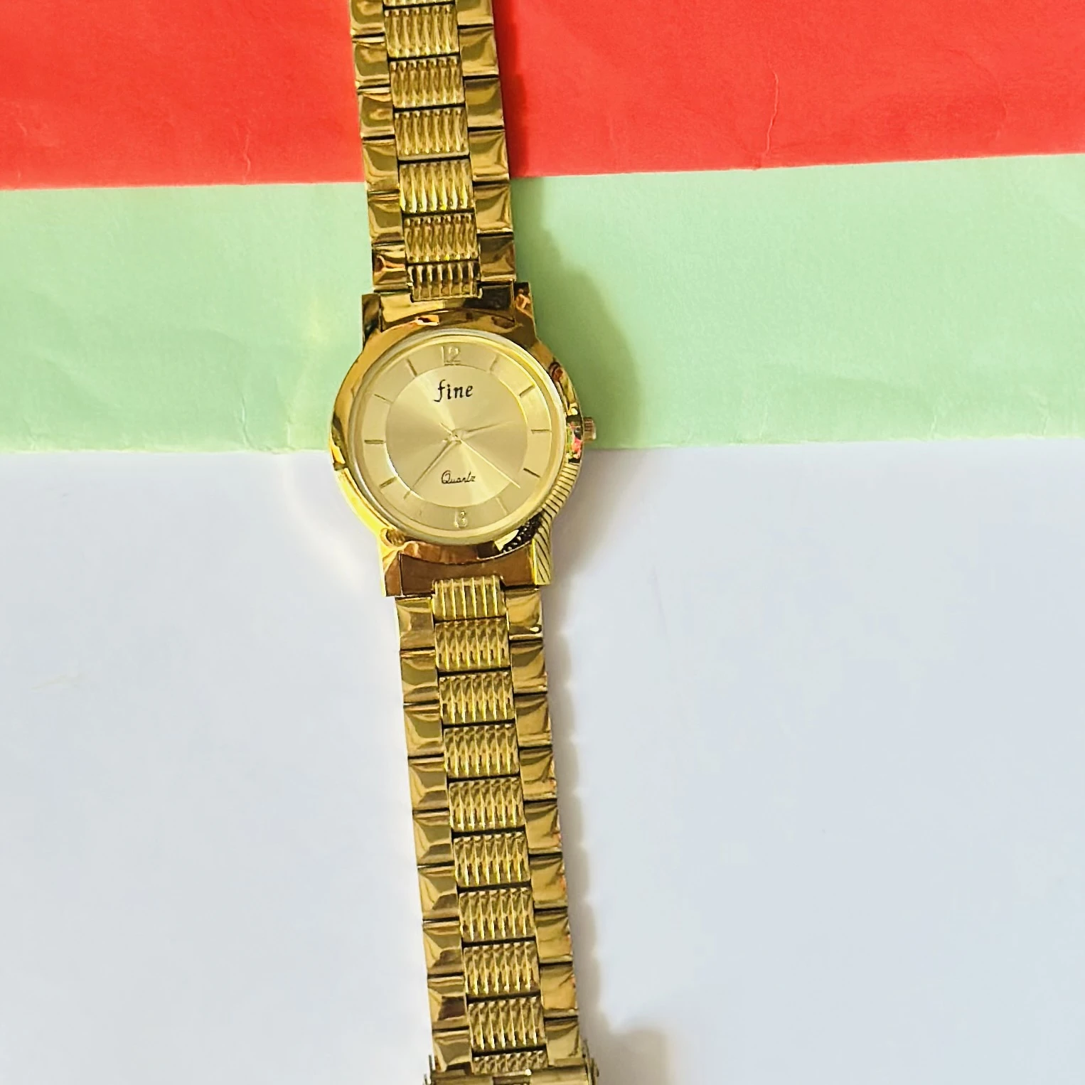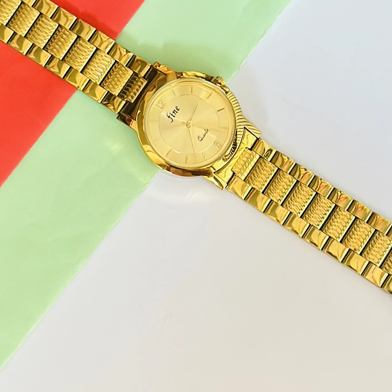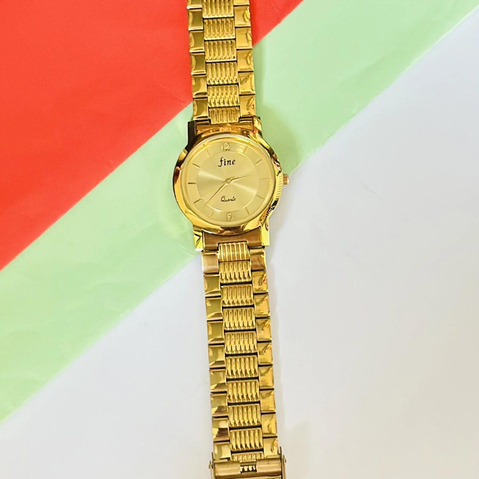 👉 Theme :- Gold tone analog quartz watch with a metal strap.