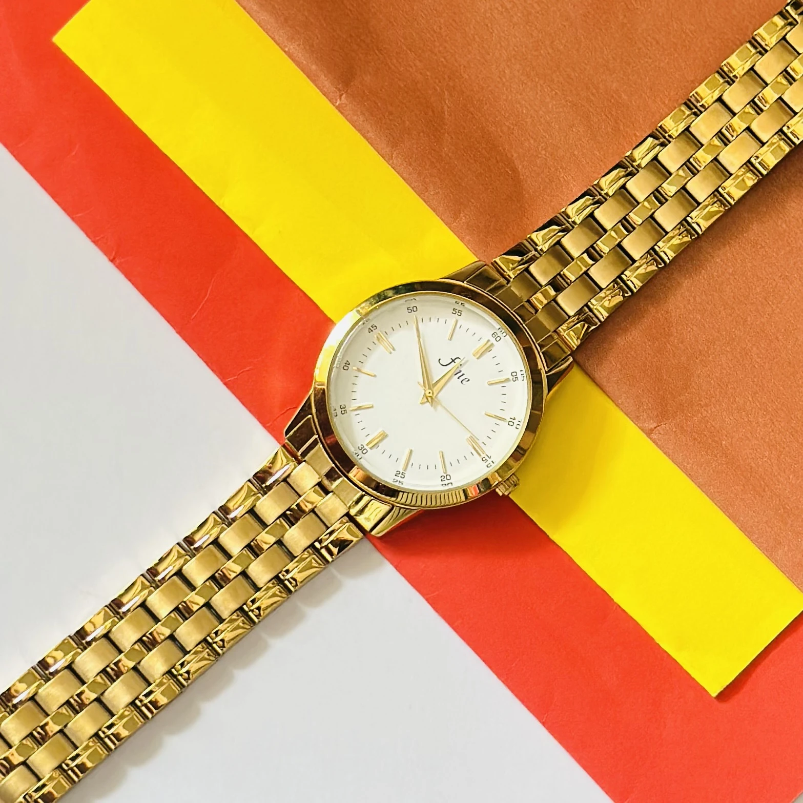 👉 Theme :- Gold toned analog watch with a white dial and metal bracelet.