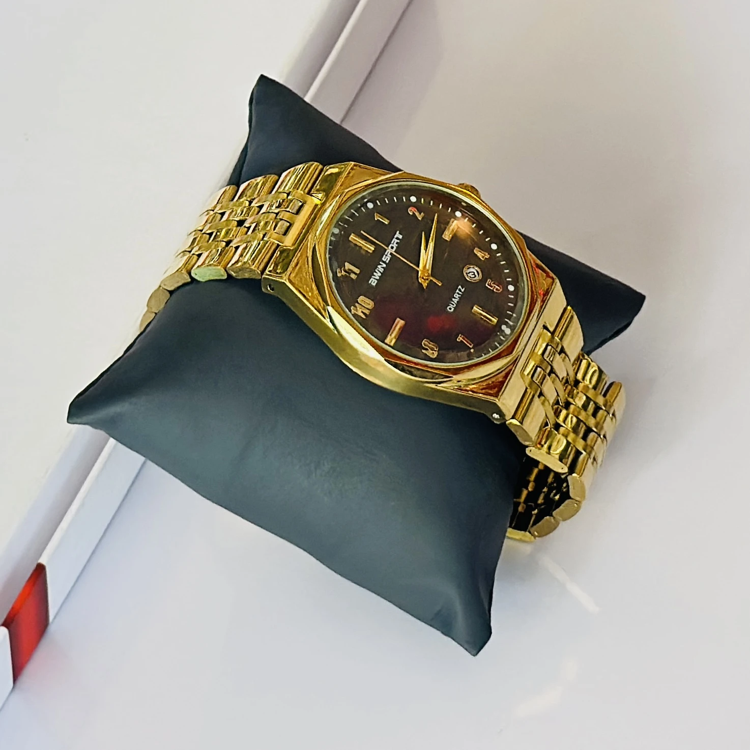 Gold tone AWIN SPORT quartz analog watch for men with a metal strap.