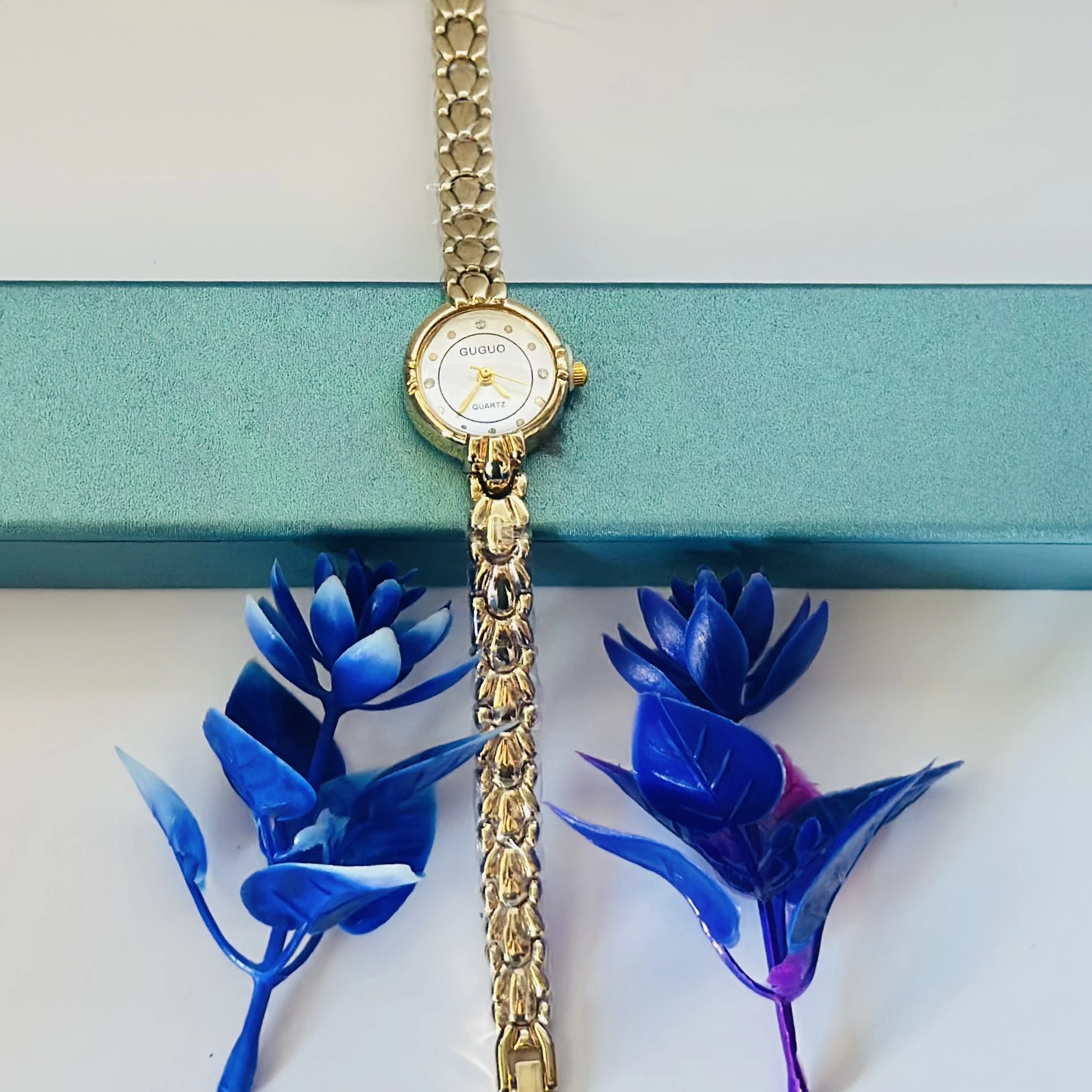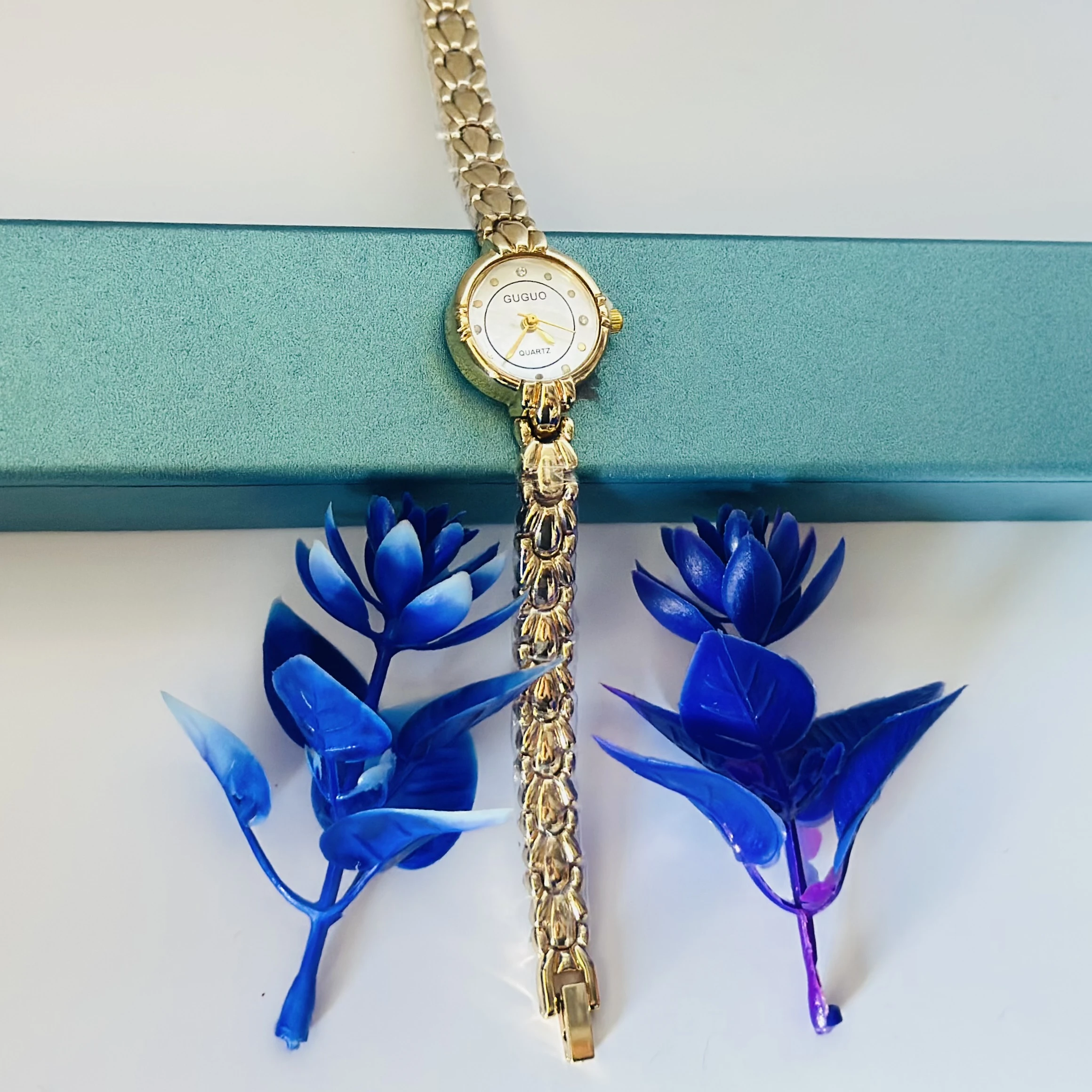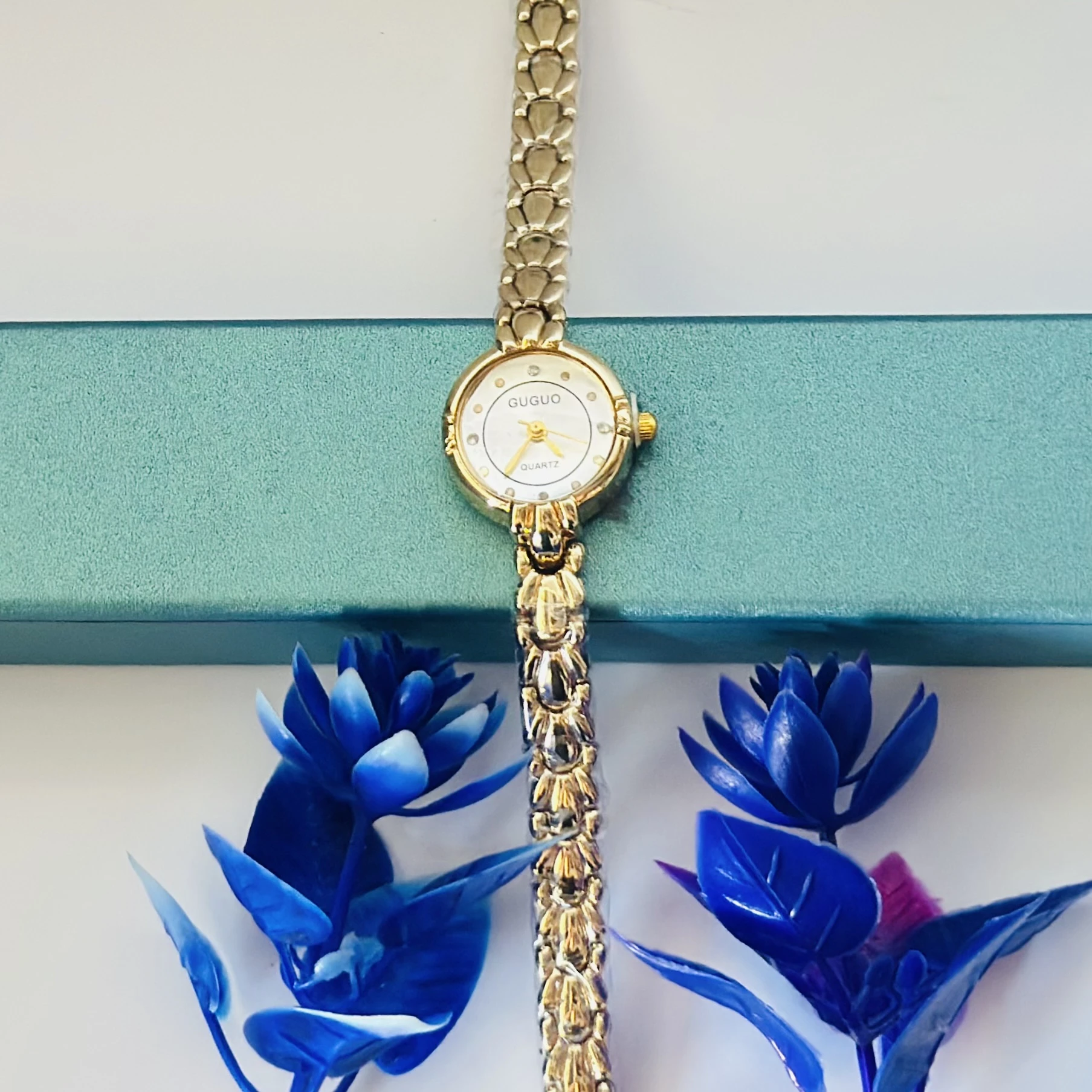 👉 Theme :- gold-tone GUGUO quartz choker watch with a round white face.