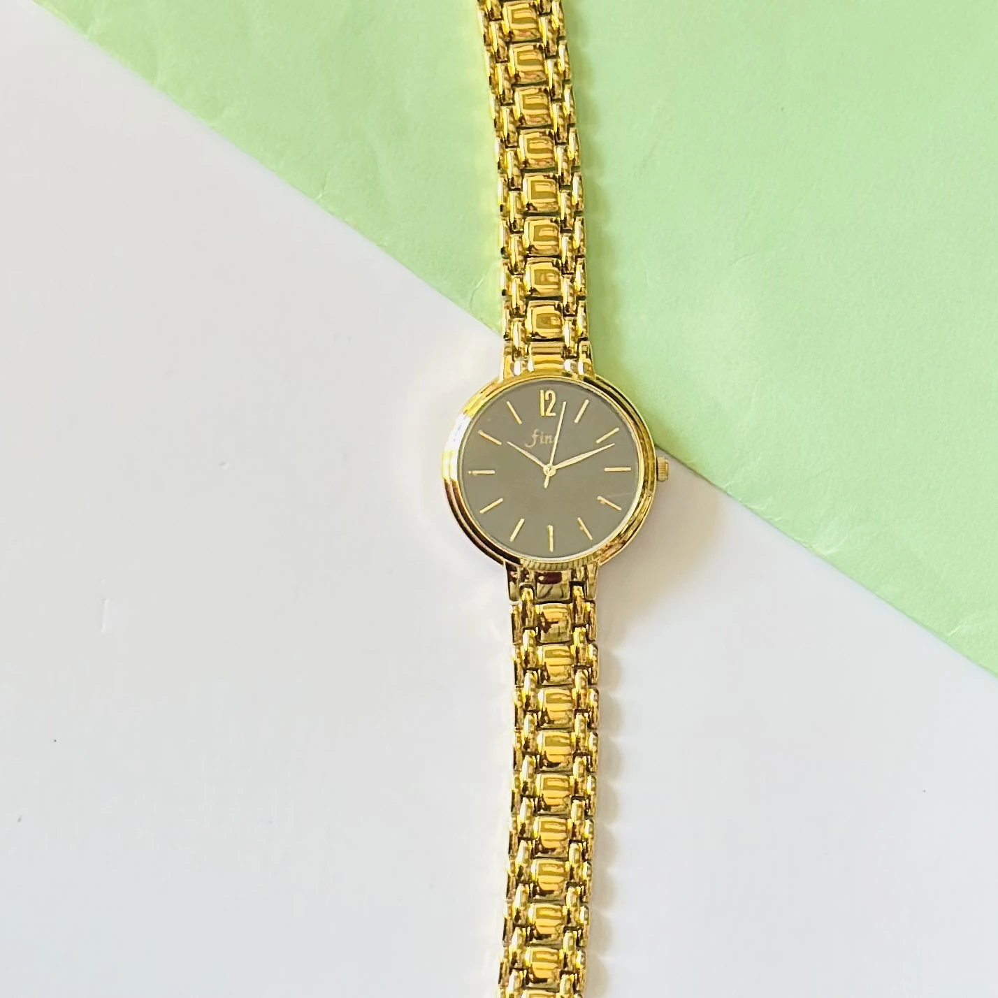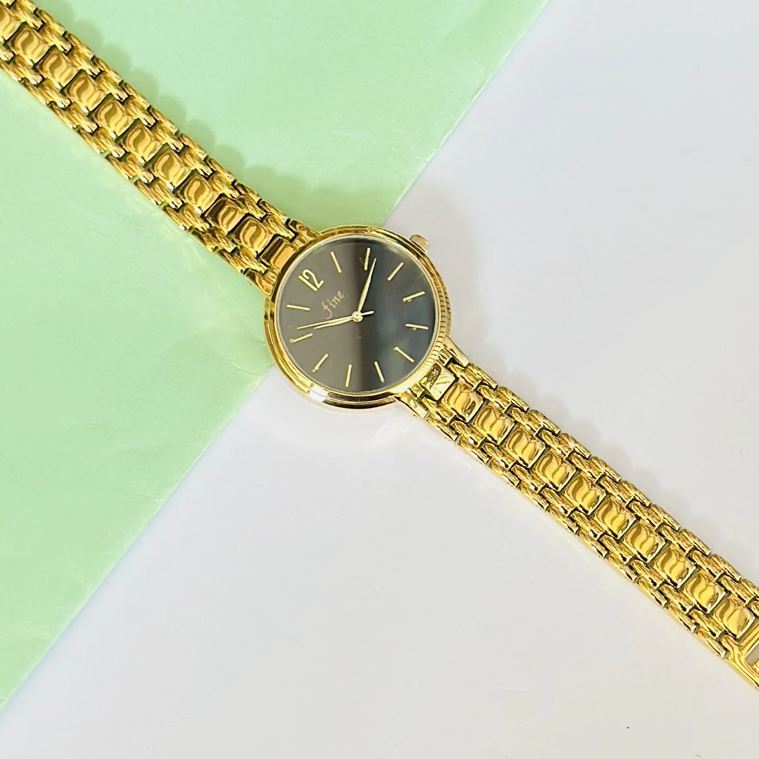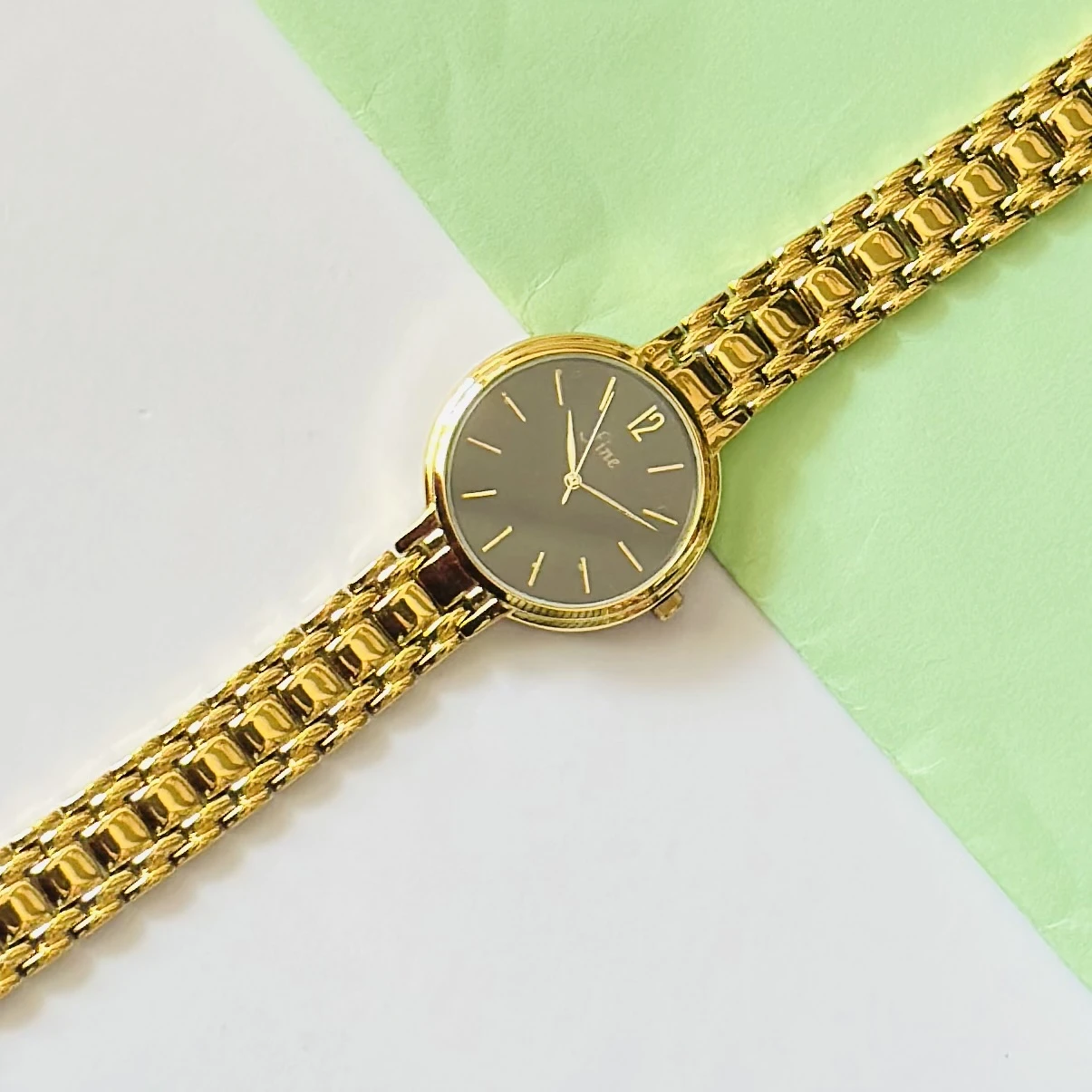 👉 Theme :- Gold tone metal strap watch with a dark grey dial and the brand name "fine" visible on the watch face.