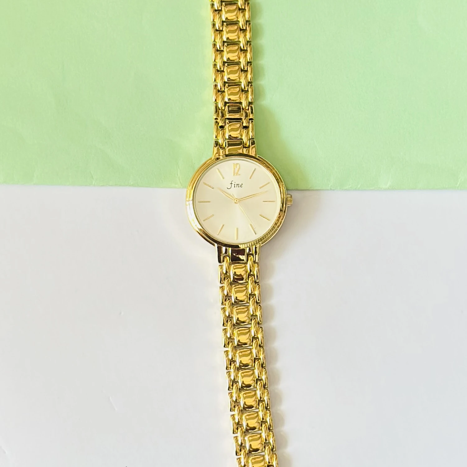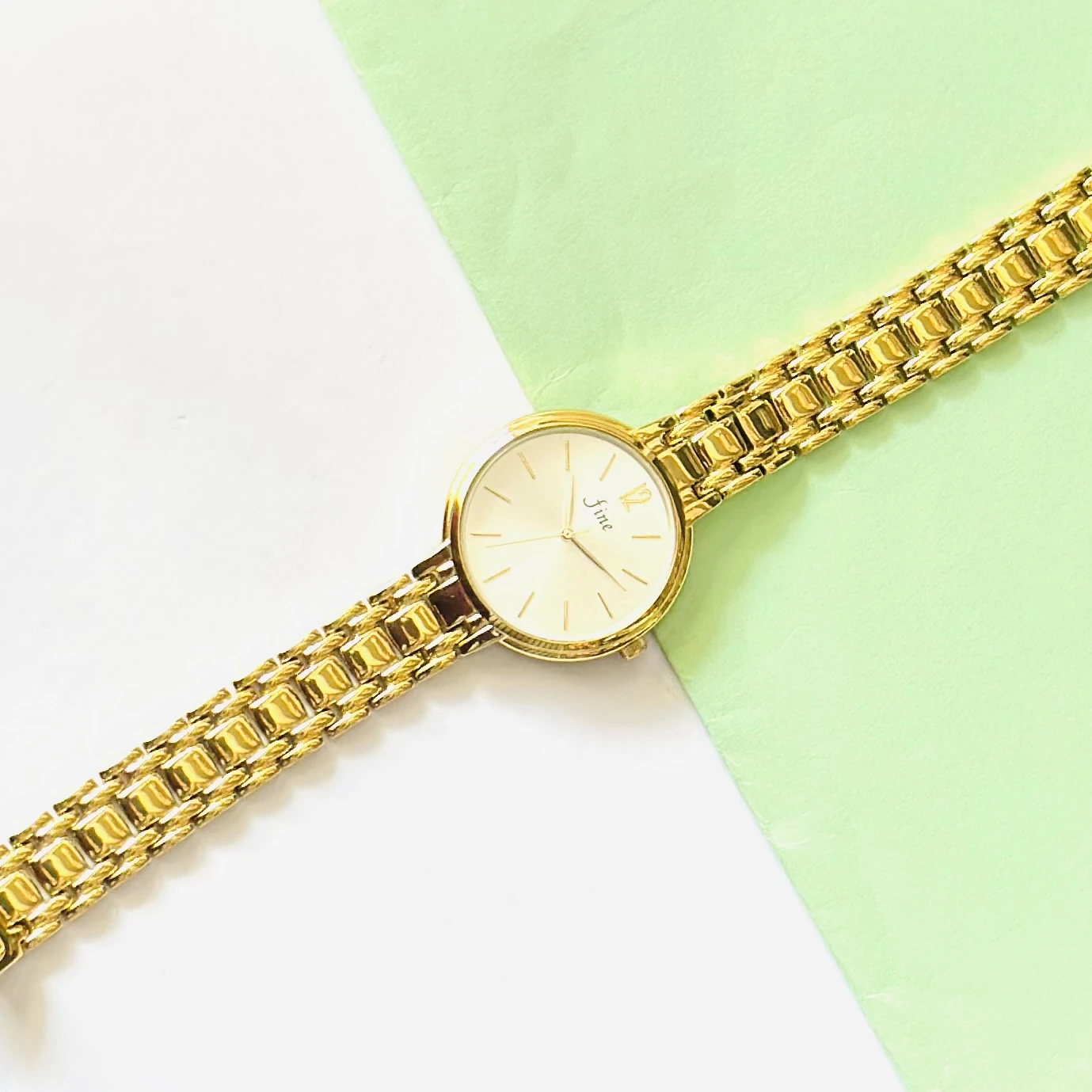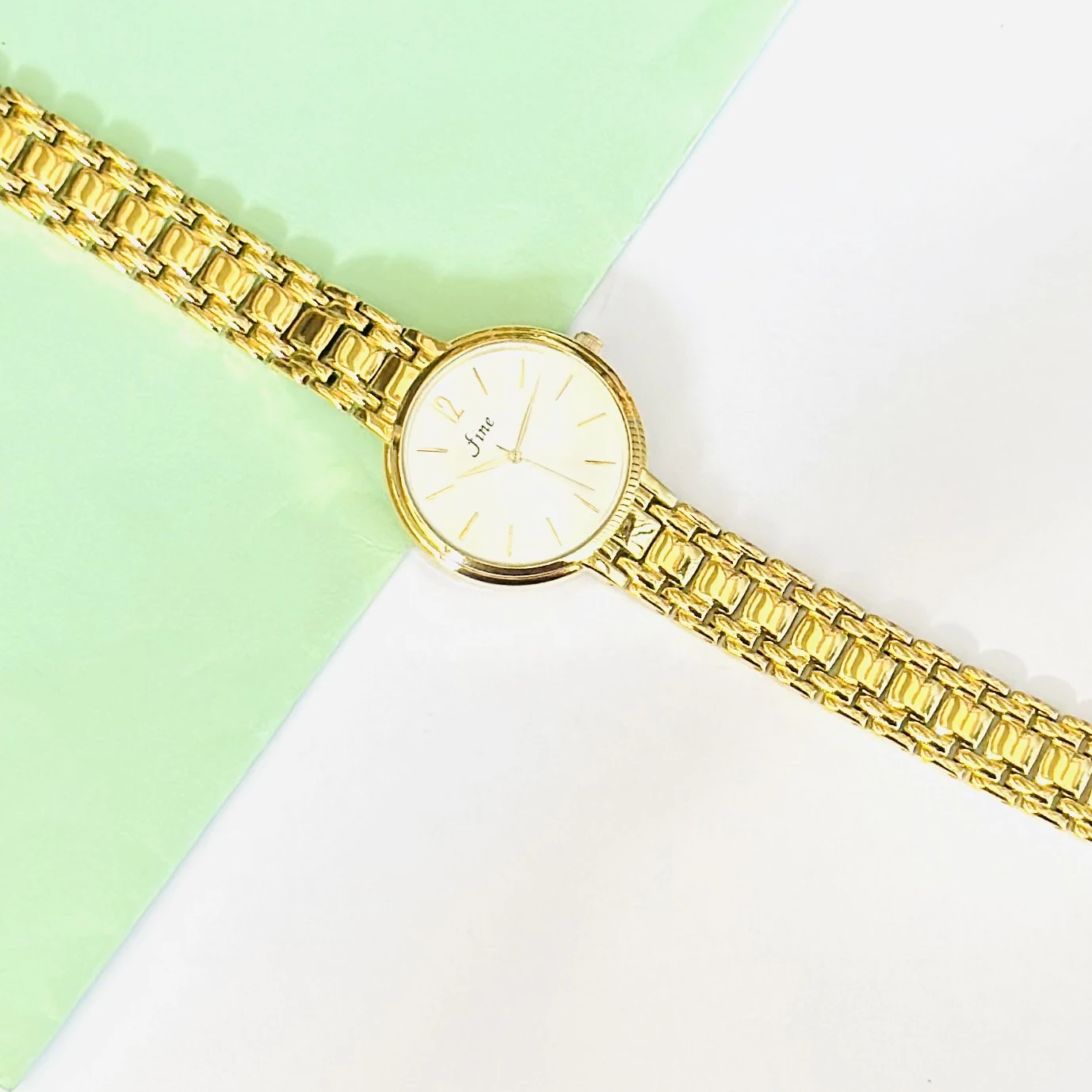 👉 Theme :- Gold tone women's analog watch with a light dial and metal strap, possibly from the brand fine.