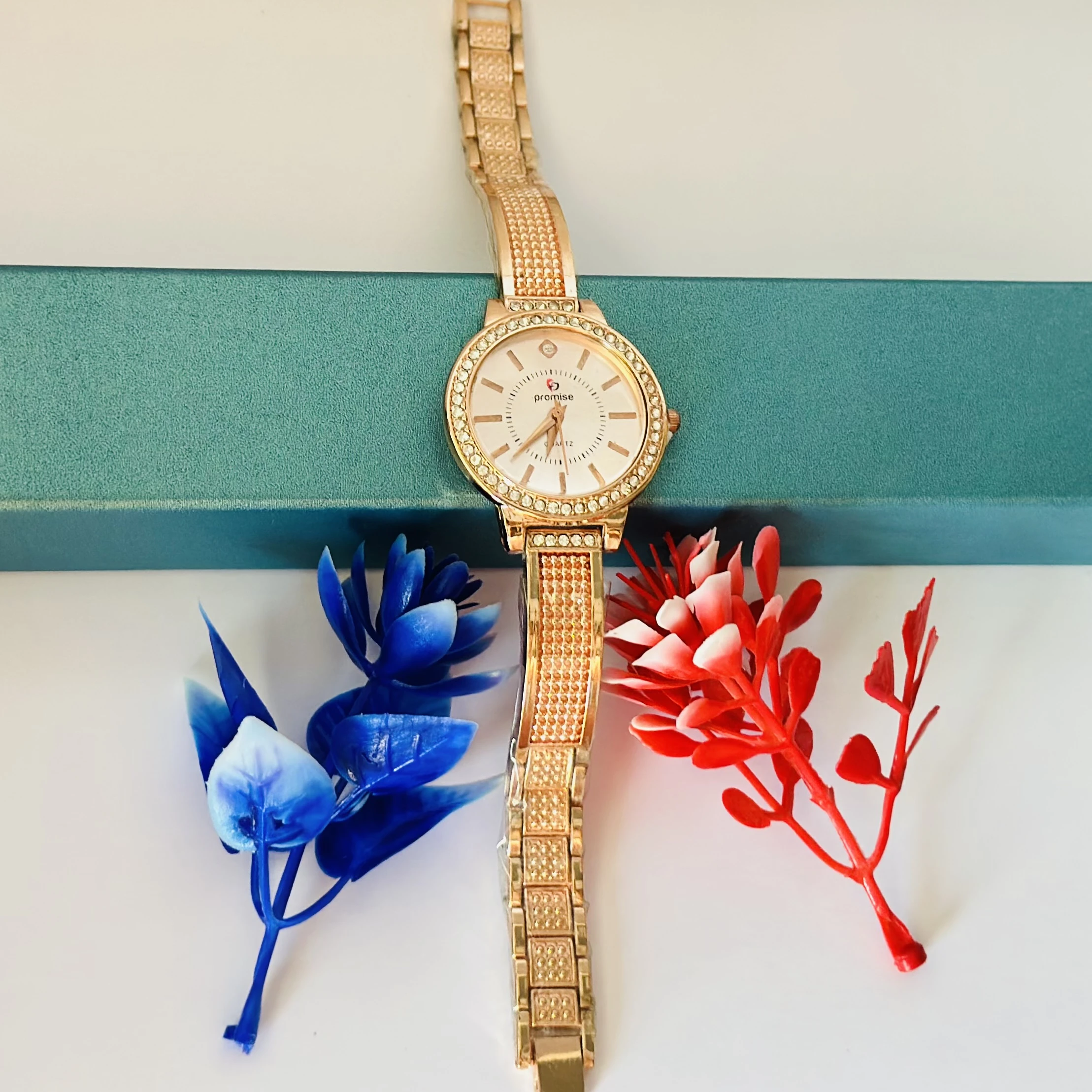 👉 Theme :- Gold tone women's analog watch with a crystal-encrusted bezel and a metal link strap