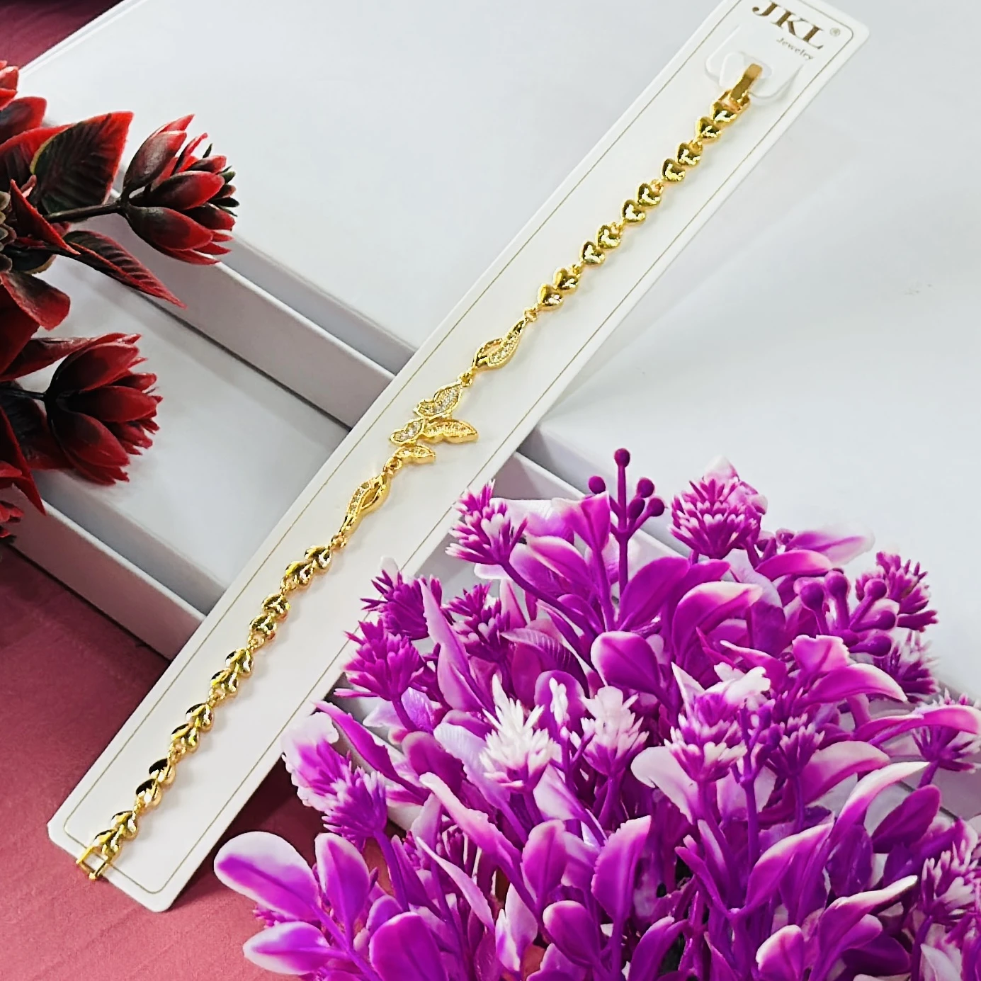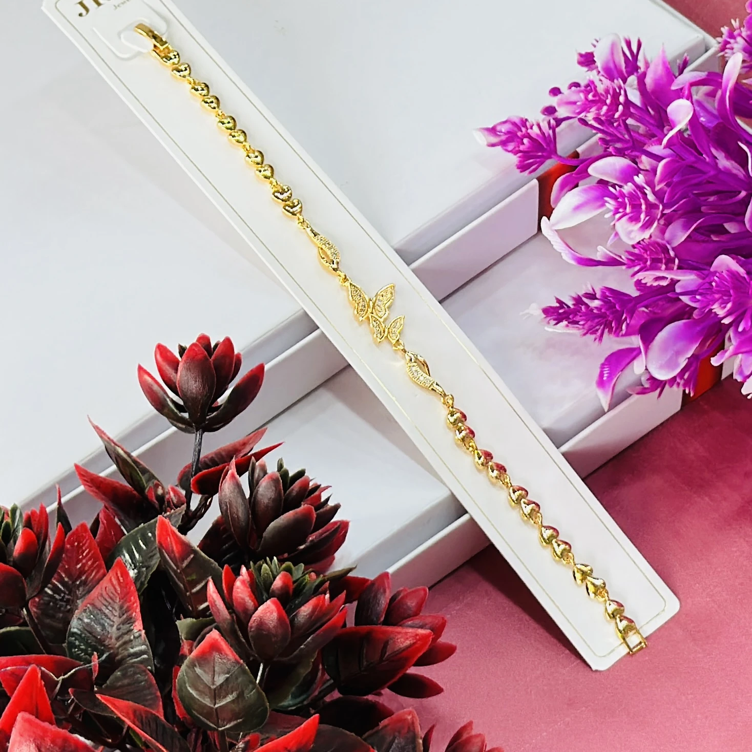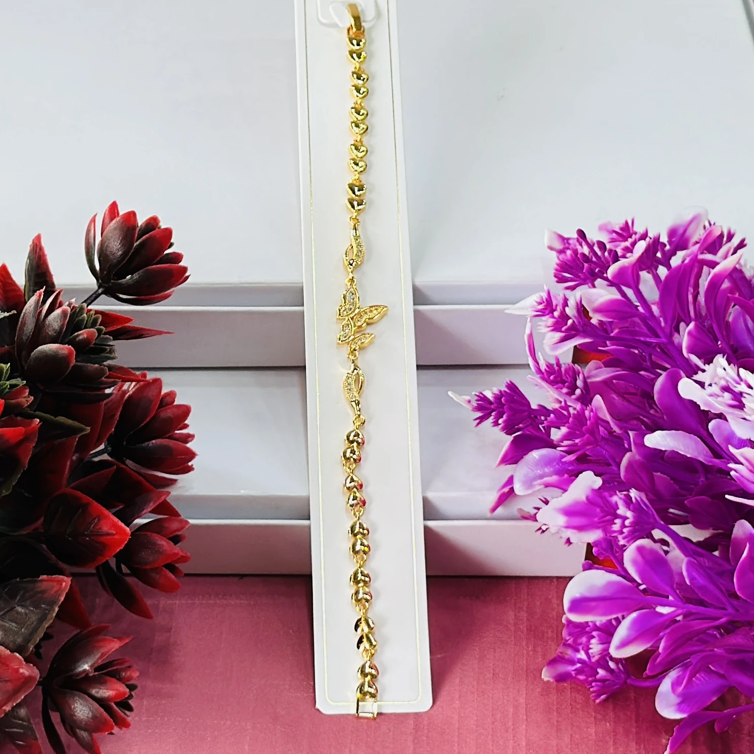 👉Theme :-Gold toned bracelet featuring a central butterfly charm and heart-shaped links