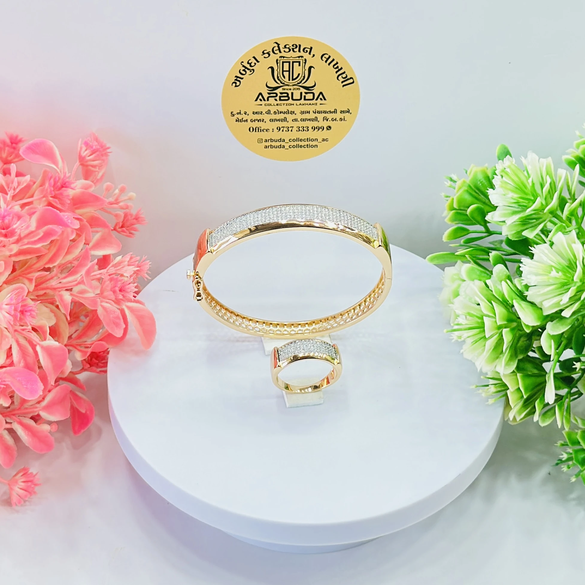 👉 Theme :- Gold toned bracelet and ring set features a kada-style design studded with American Diamonds.