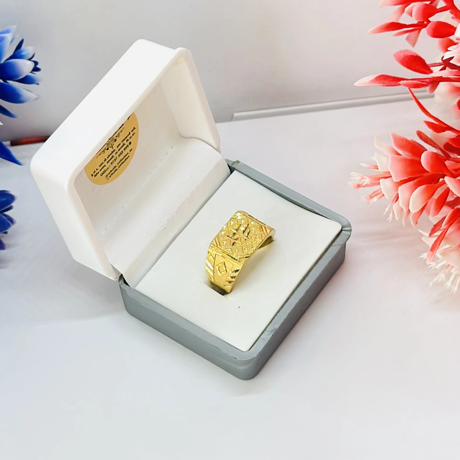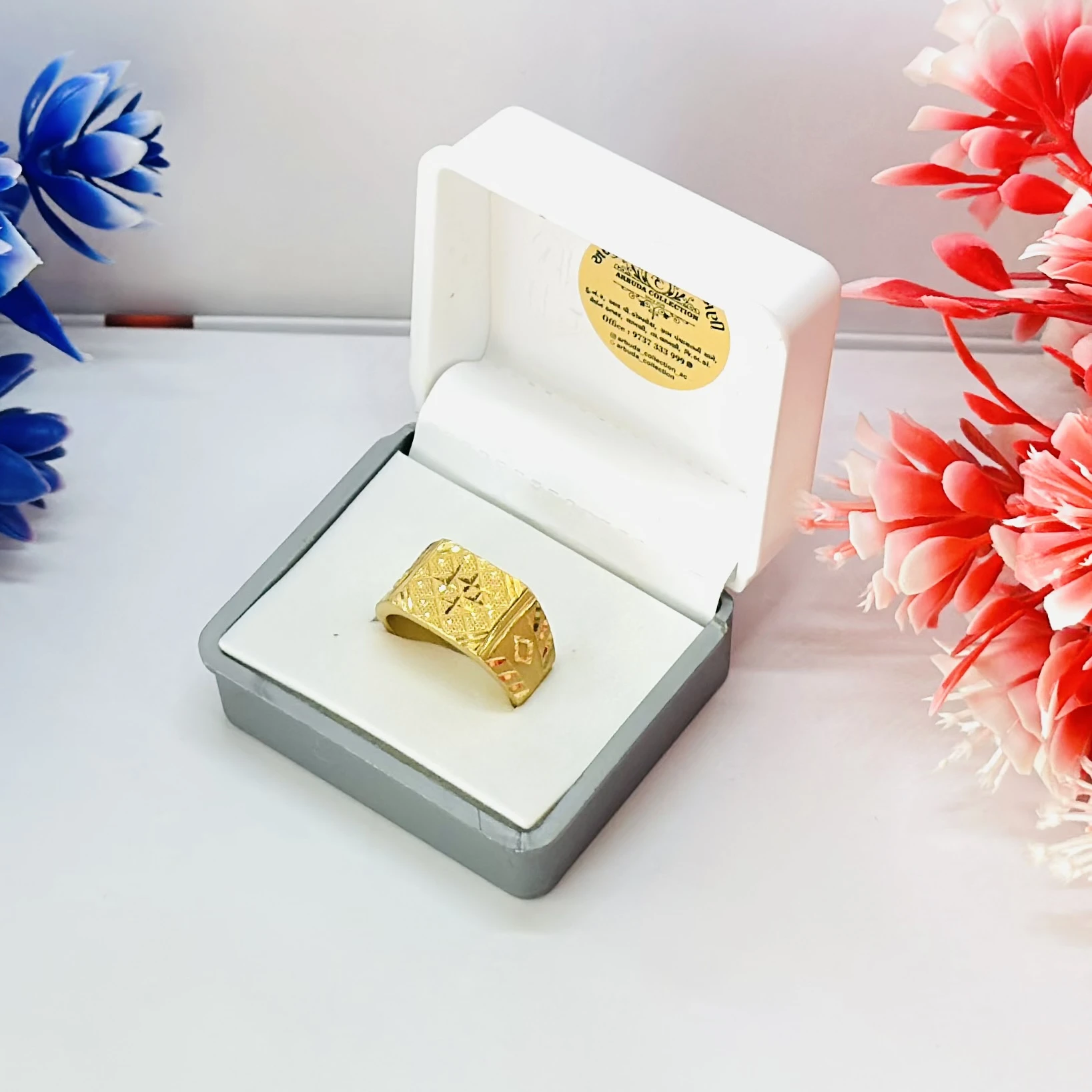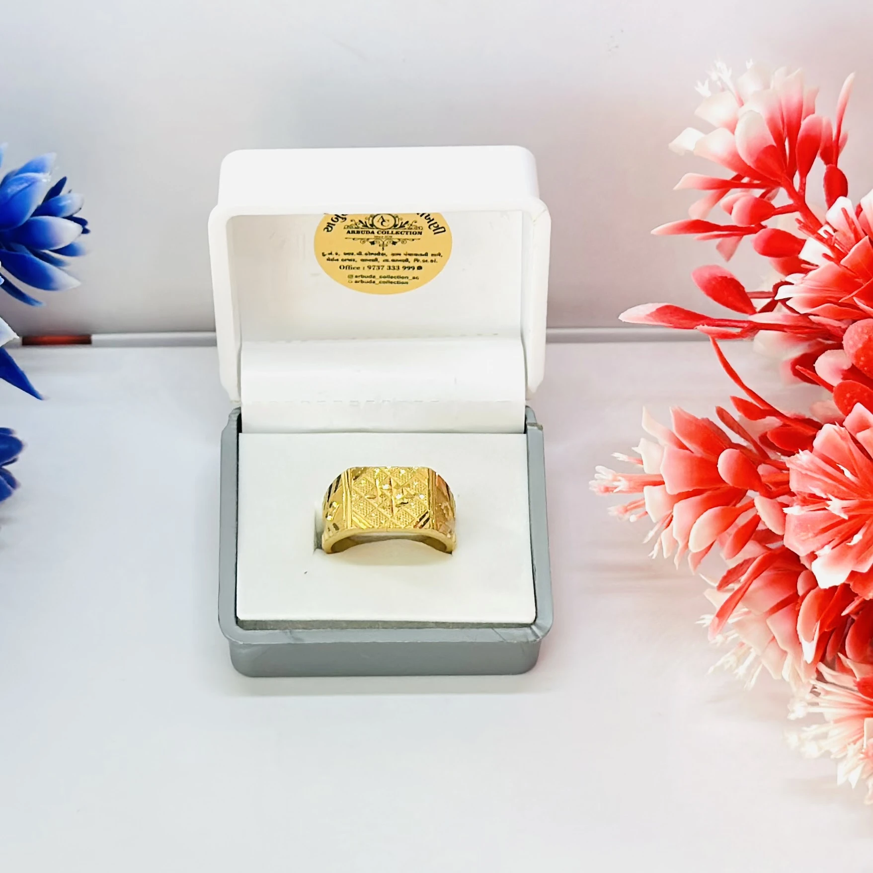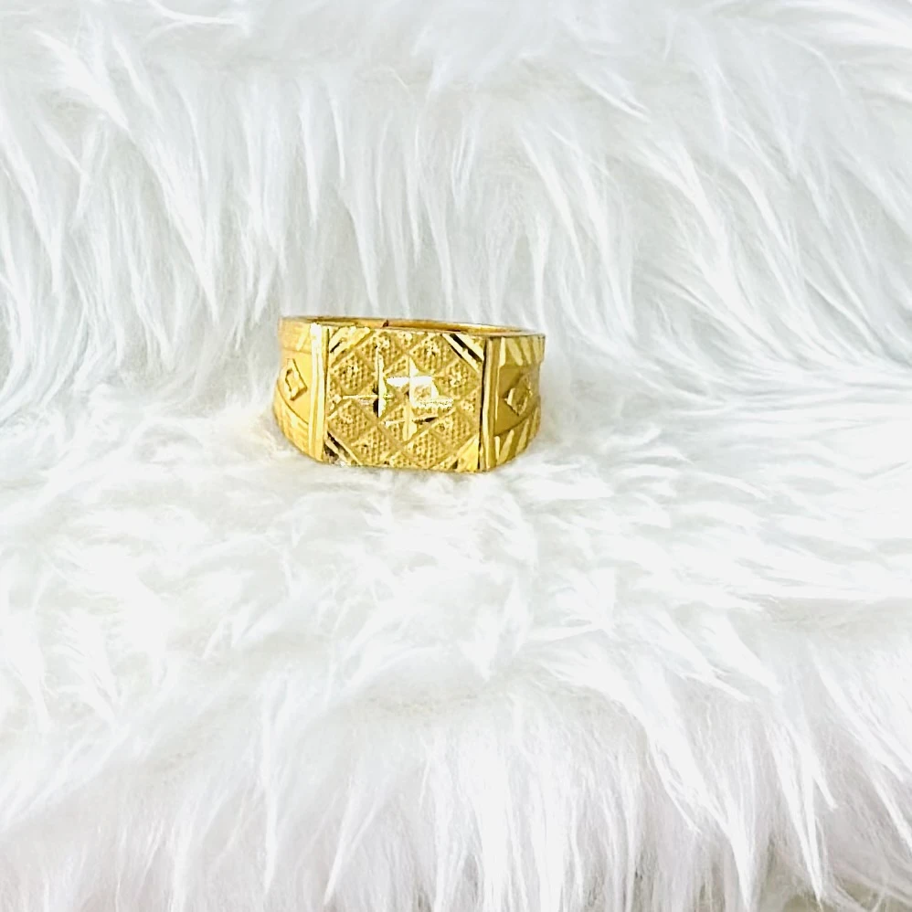 👉 Theme :- Gold gent's ring with a textured design and diamond accents.