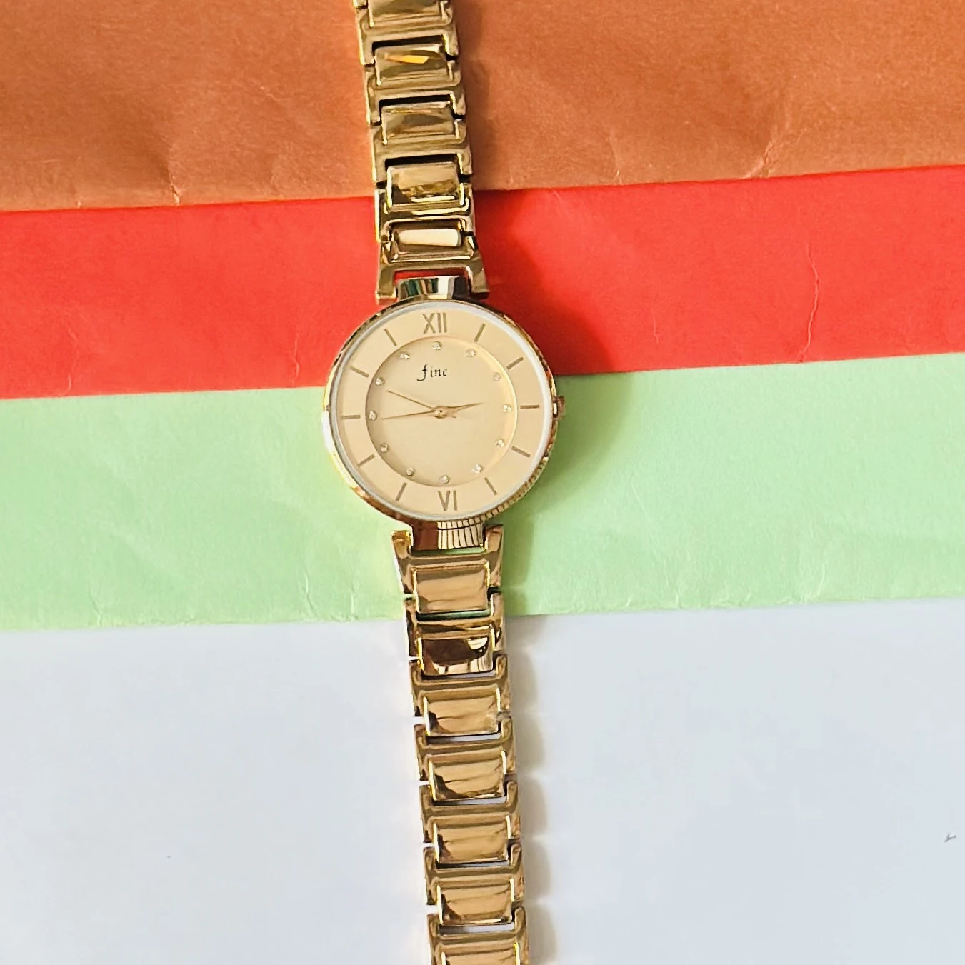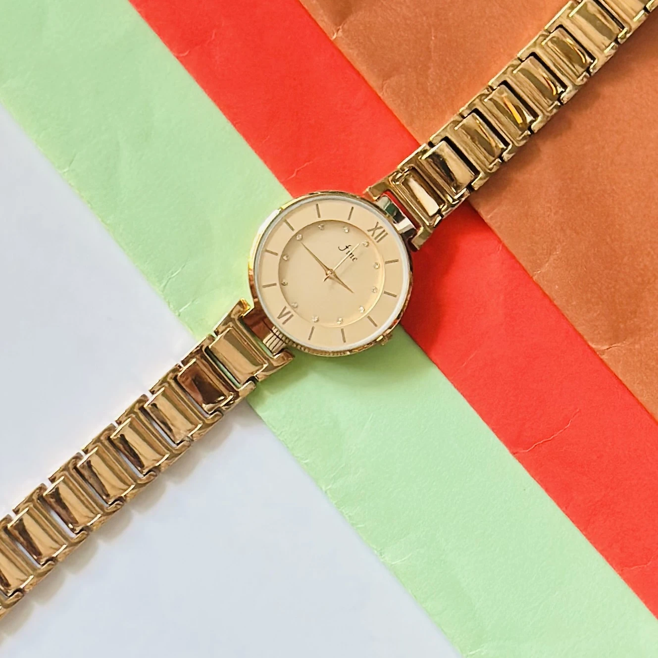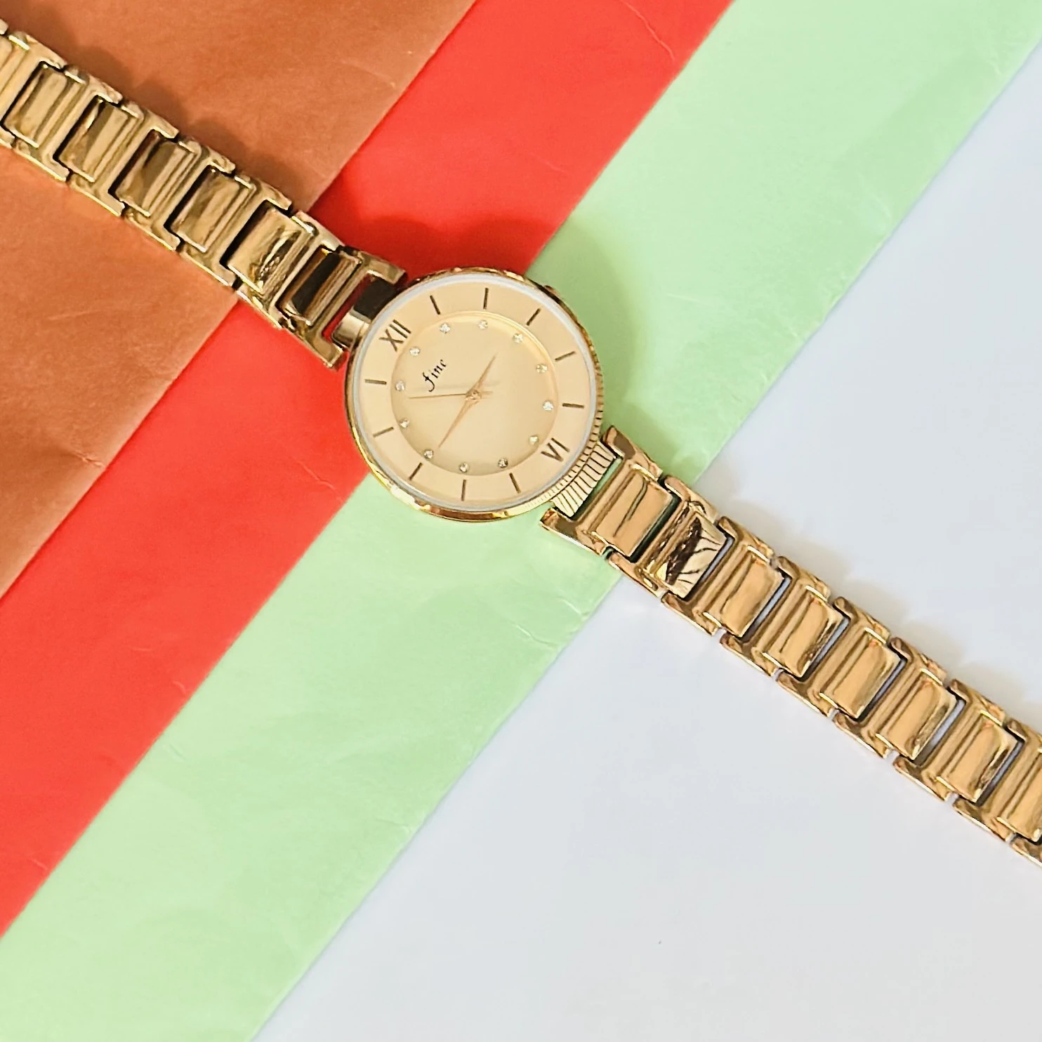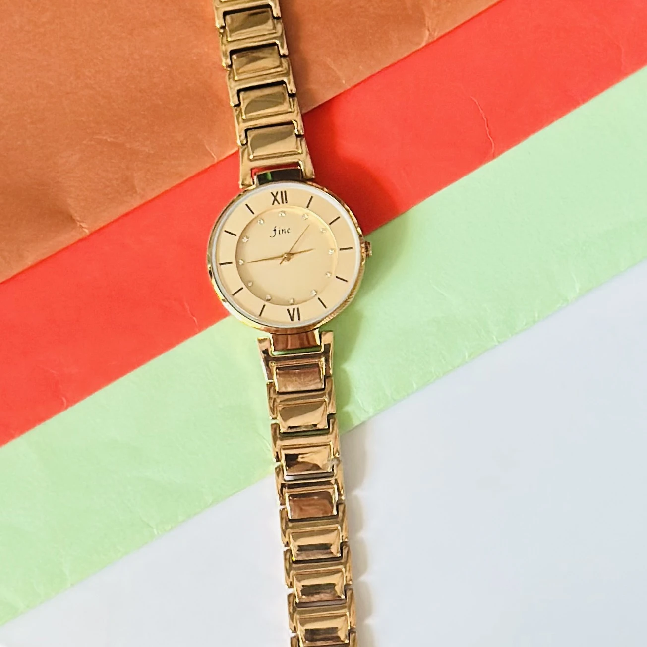 👉 Theme :- Gold toned women's analog watch, possibly a Romofy bracelet stylish watch.