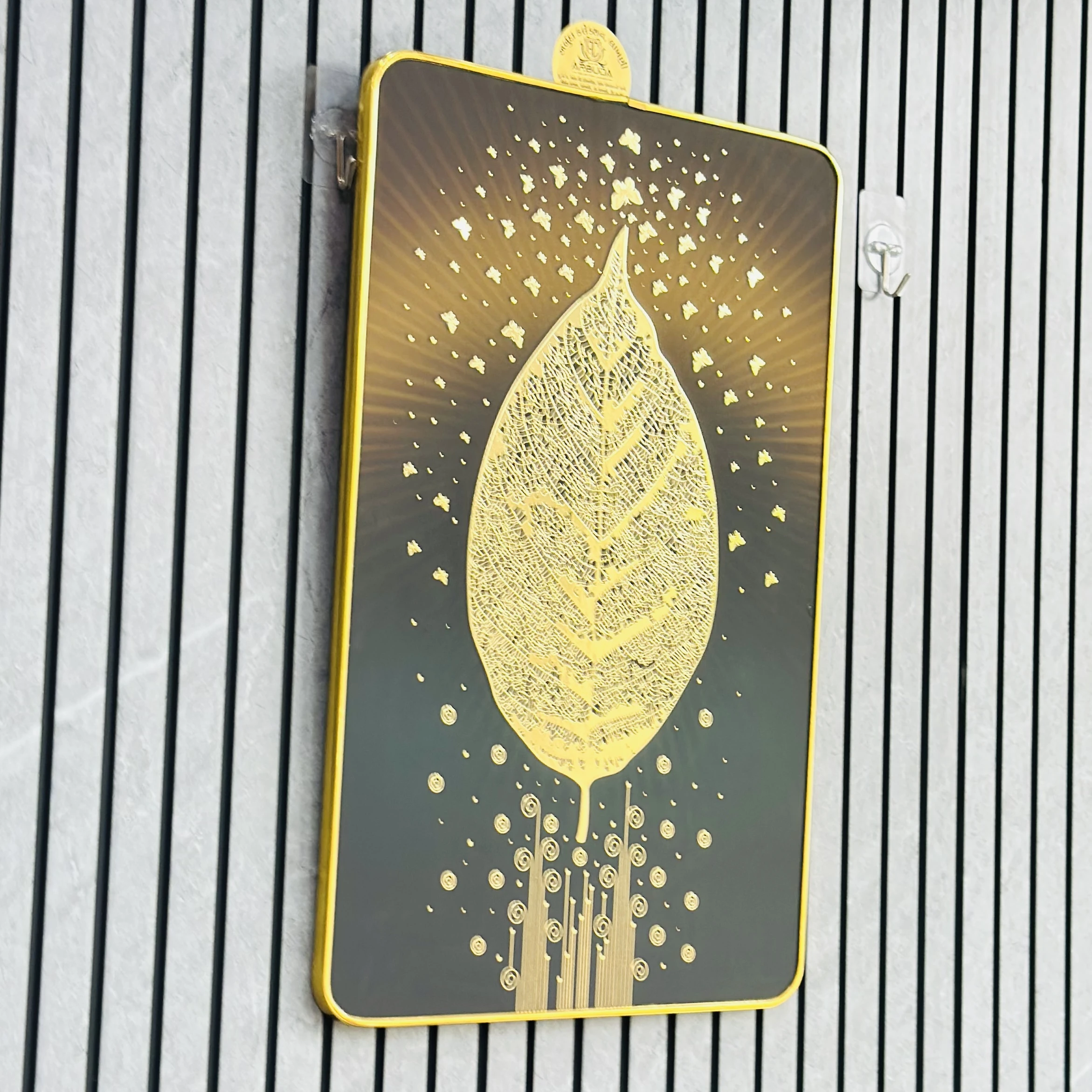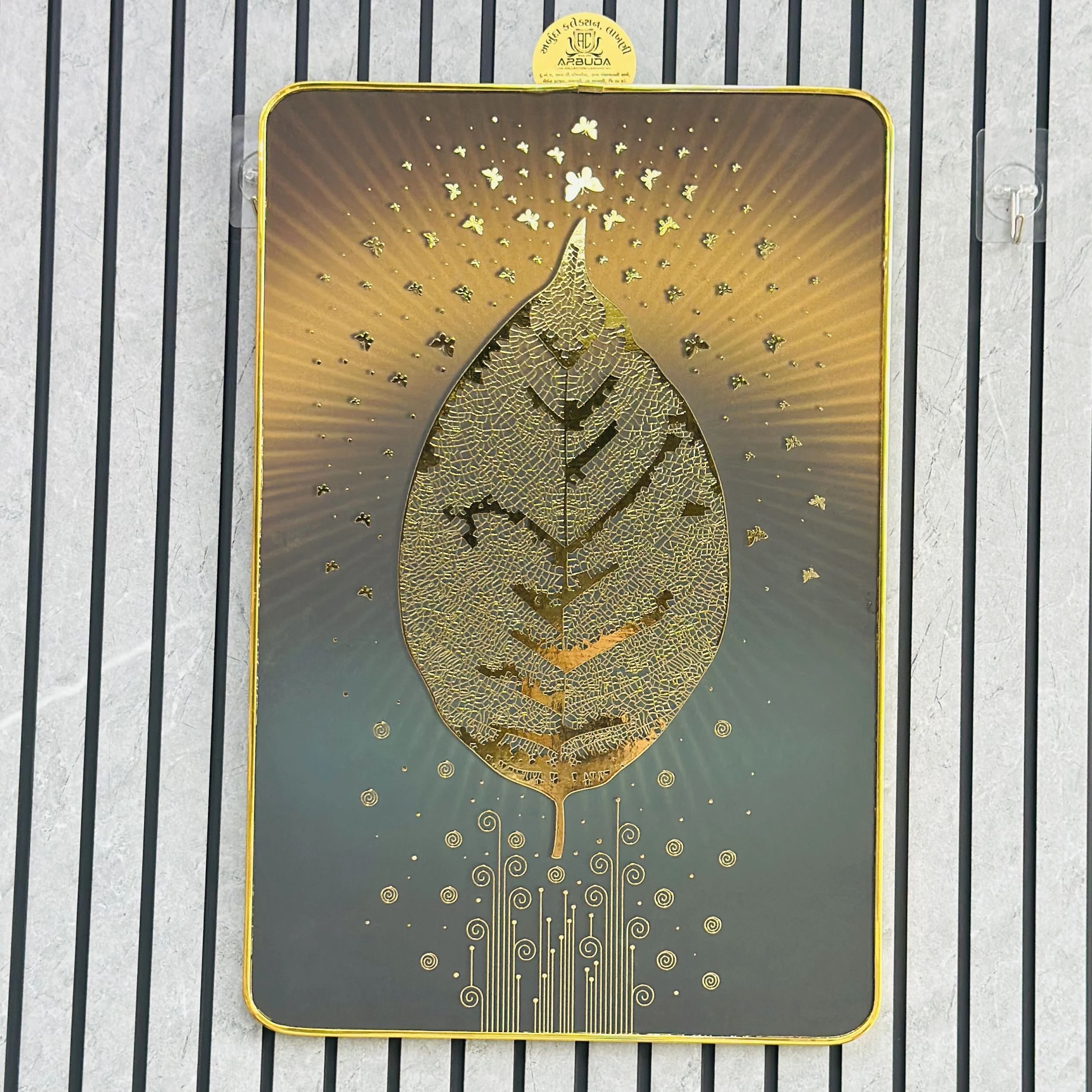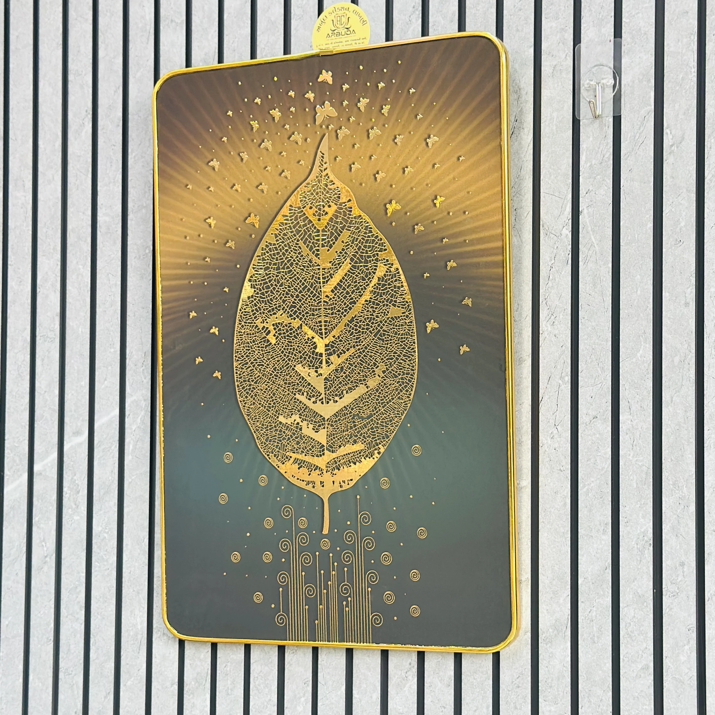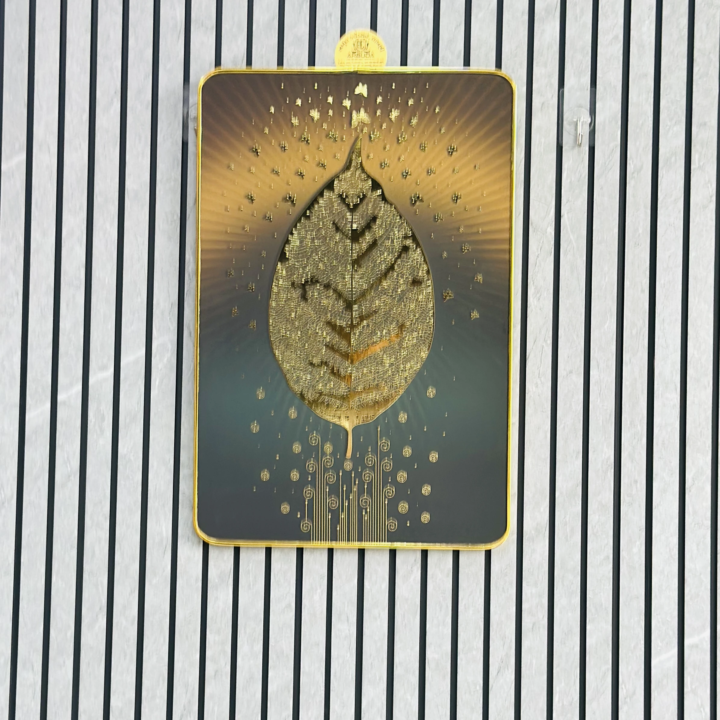 👉 Theme :- golden embossed wall painting featuring a leaf and butterflies.