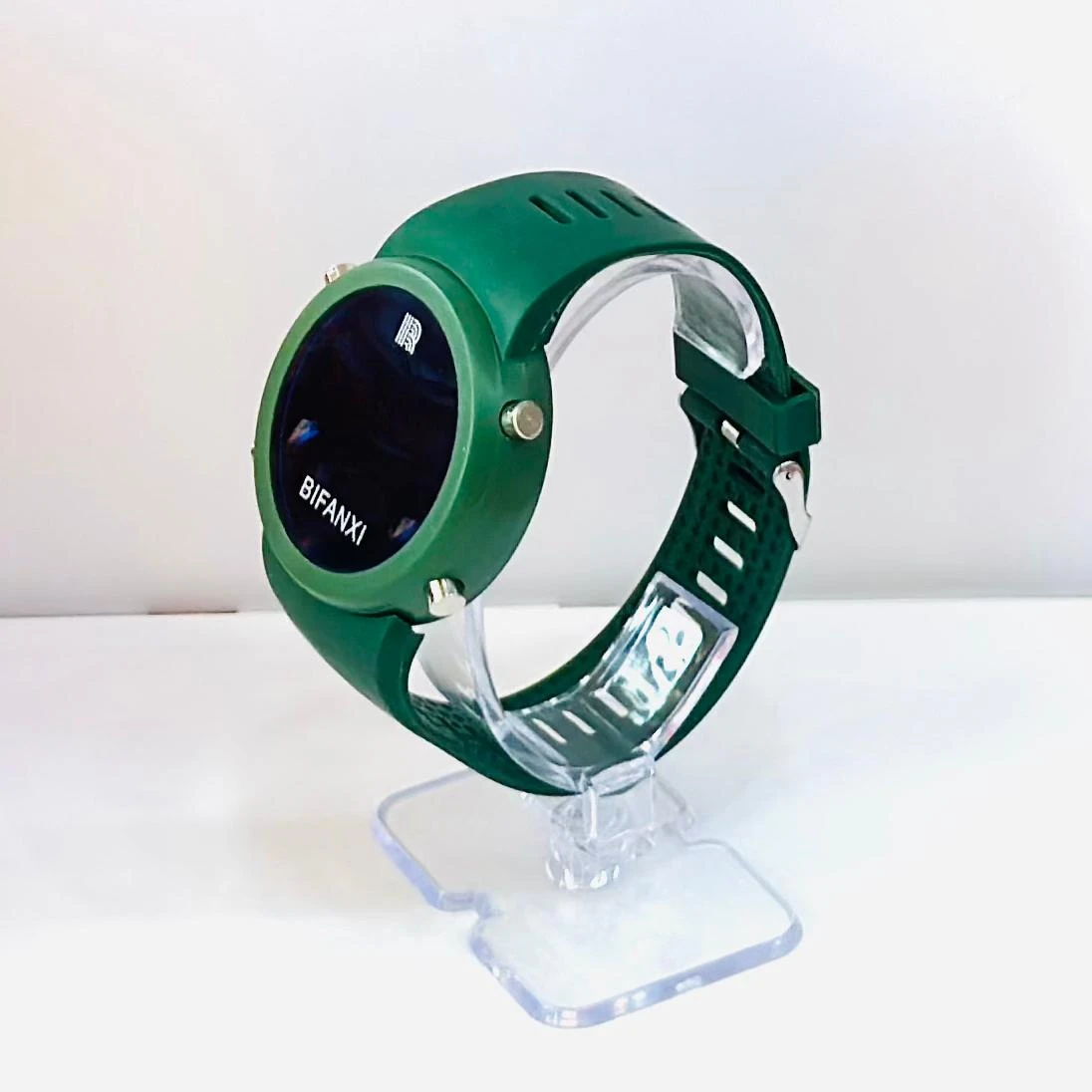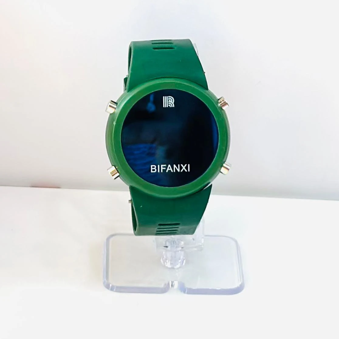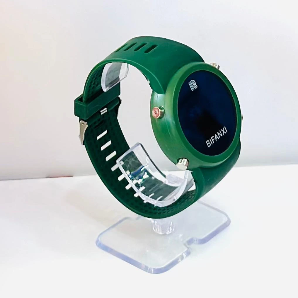 👉 Theme :- Green BIFANXI digital sports watch with a round dial and a black silicone or TPU strap.