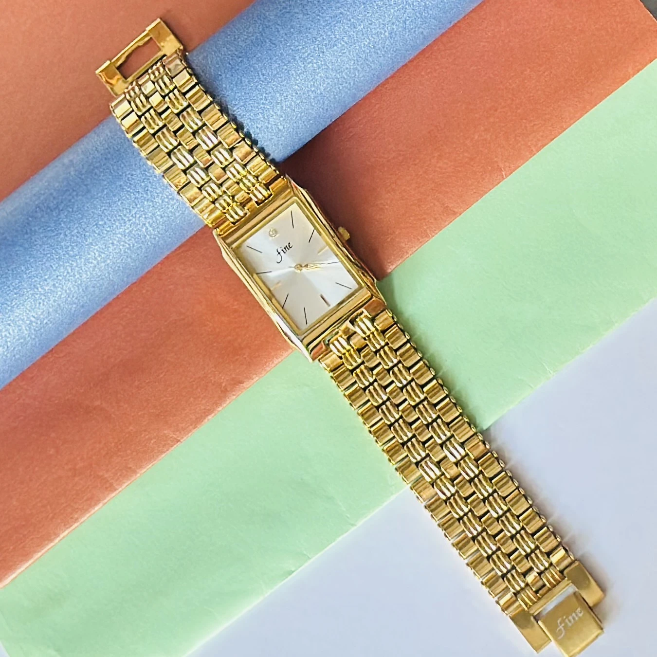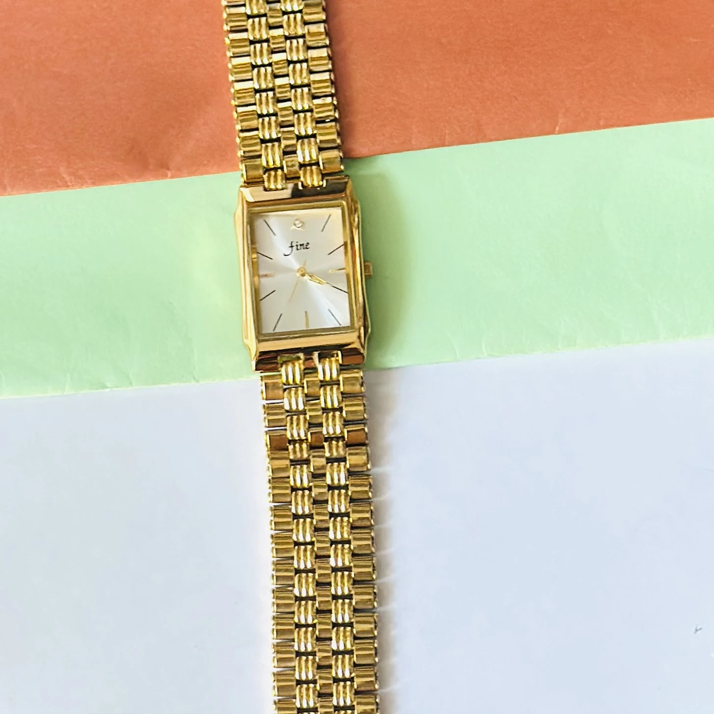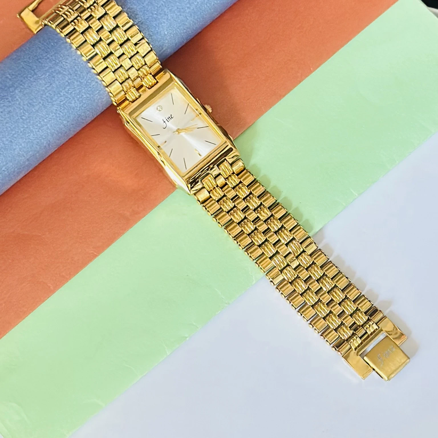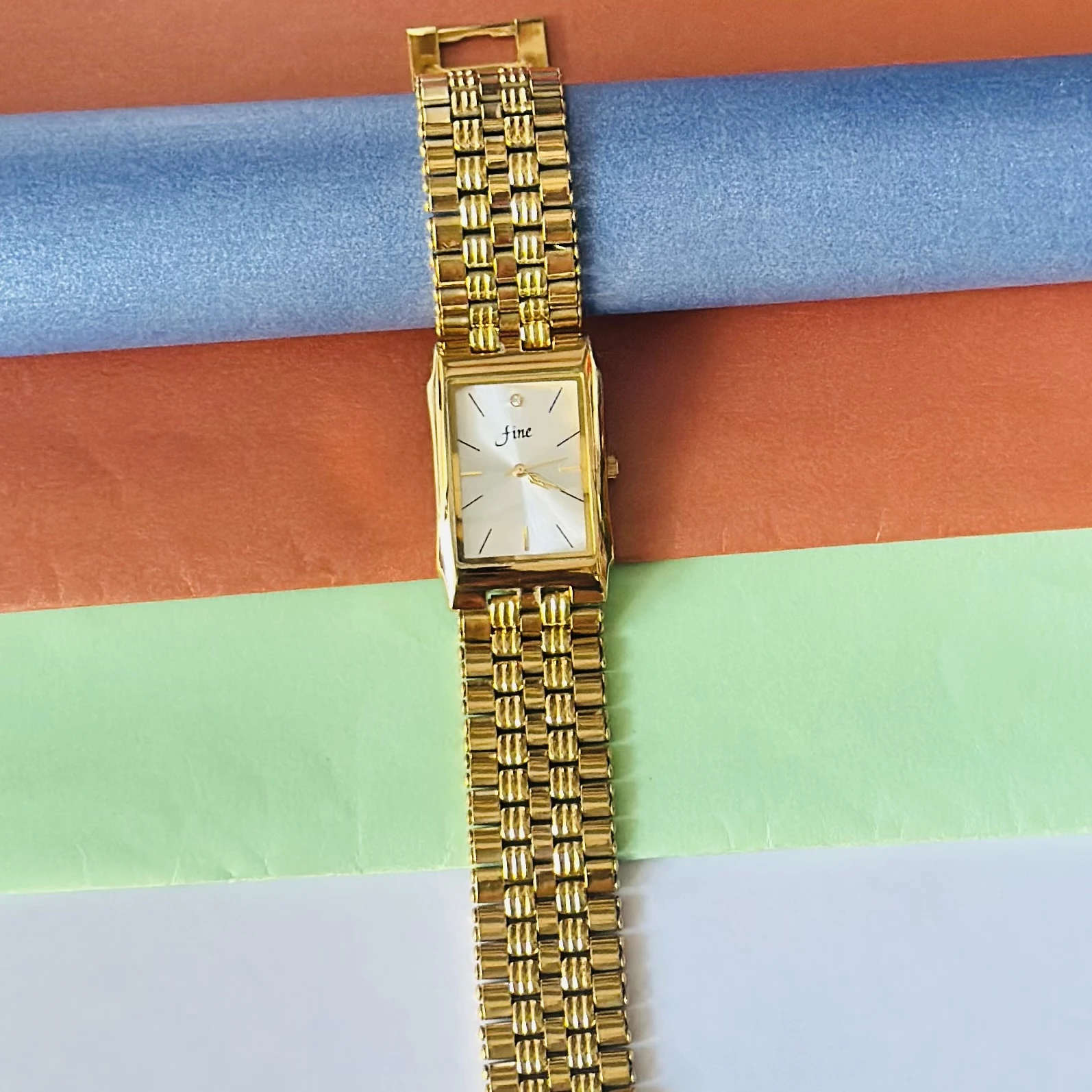👉 Theme :- Gold tone analog quartz watch with a metal strap.