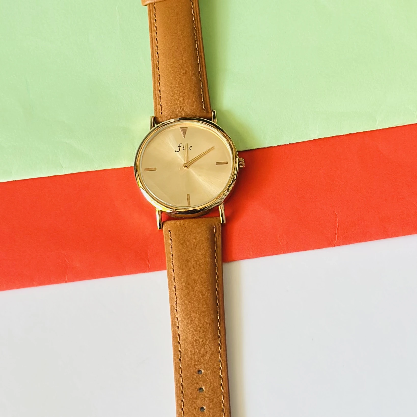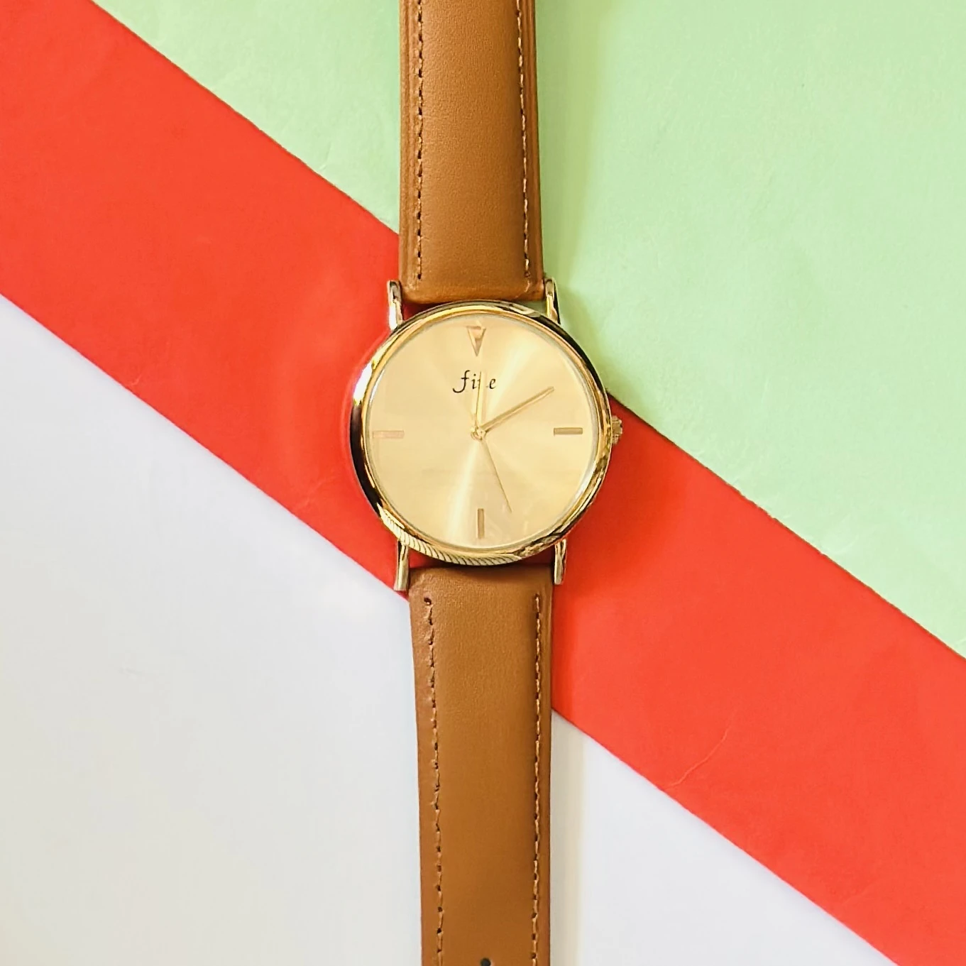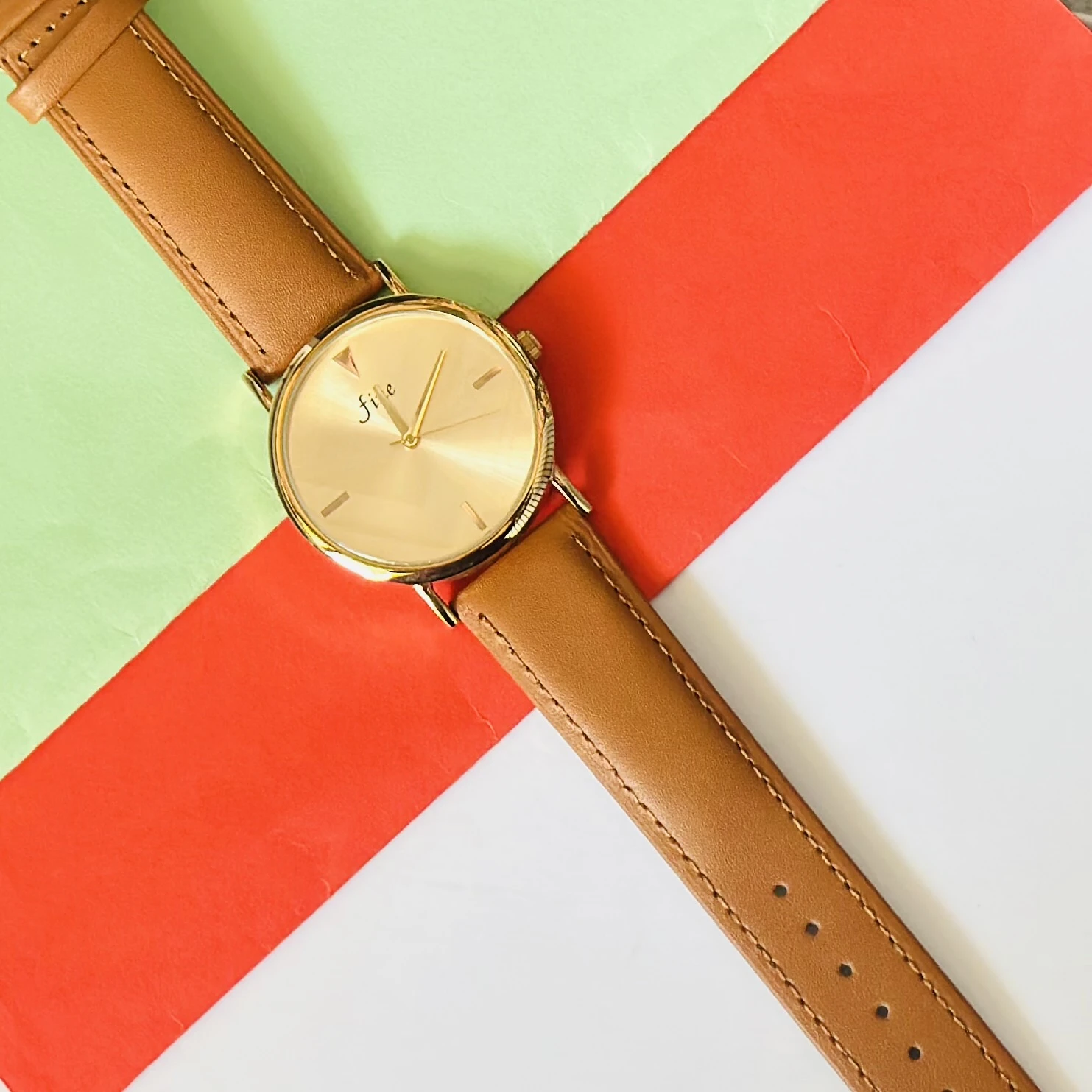 👉 Theme :- Jule Sun-Kissed watch with a tan faux leather strap and gold-toned details.