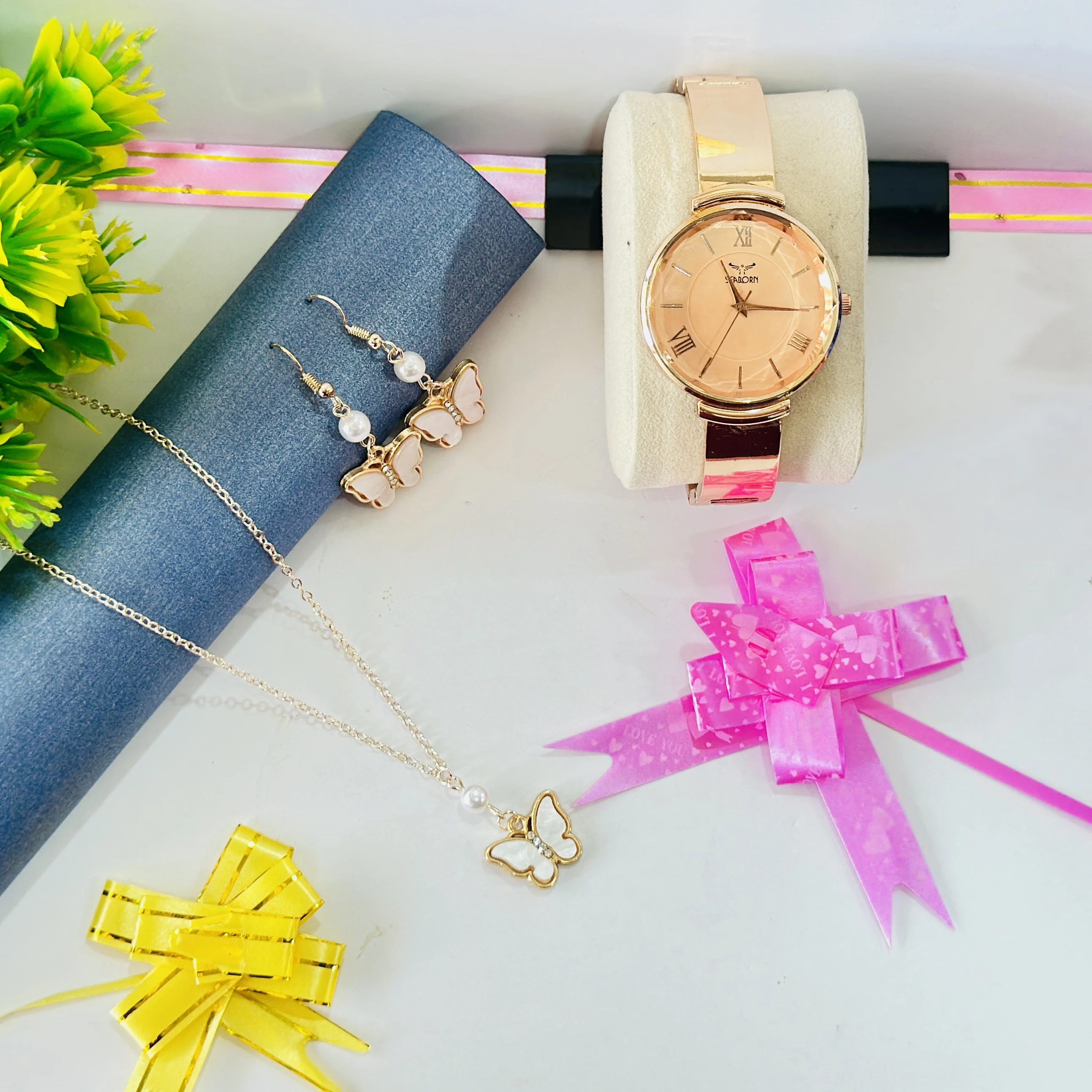Seaborn watch and jewelry set features a rose gold-toned analog timepiece paired with a matching butterfly necklace and earrings.