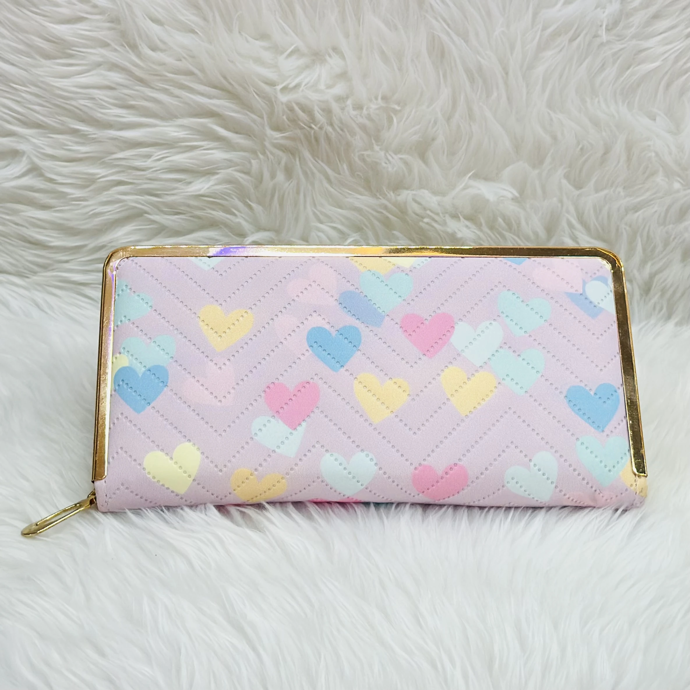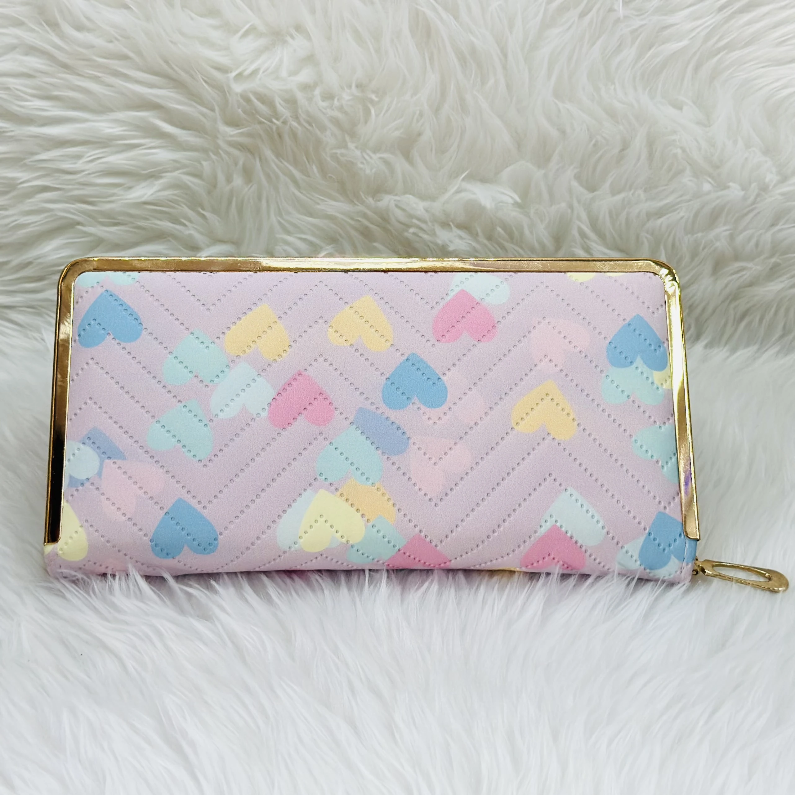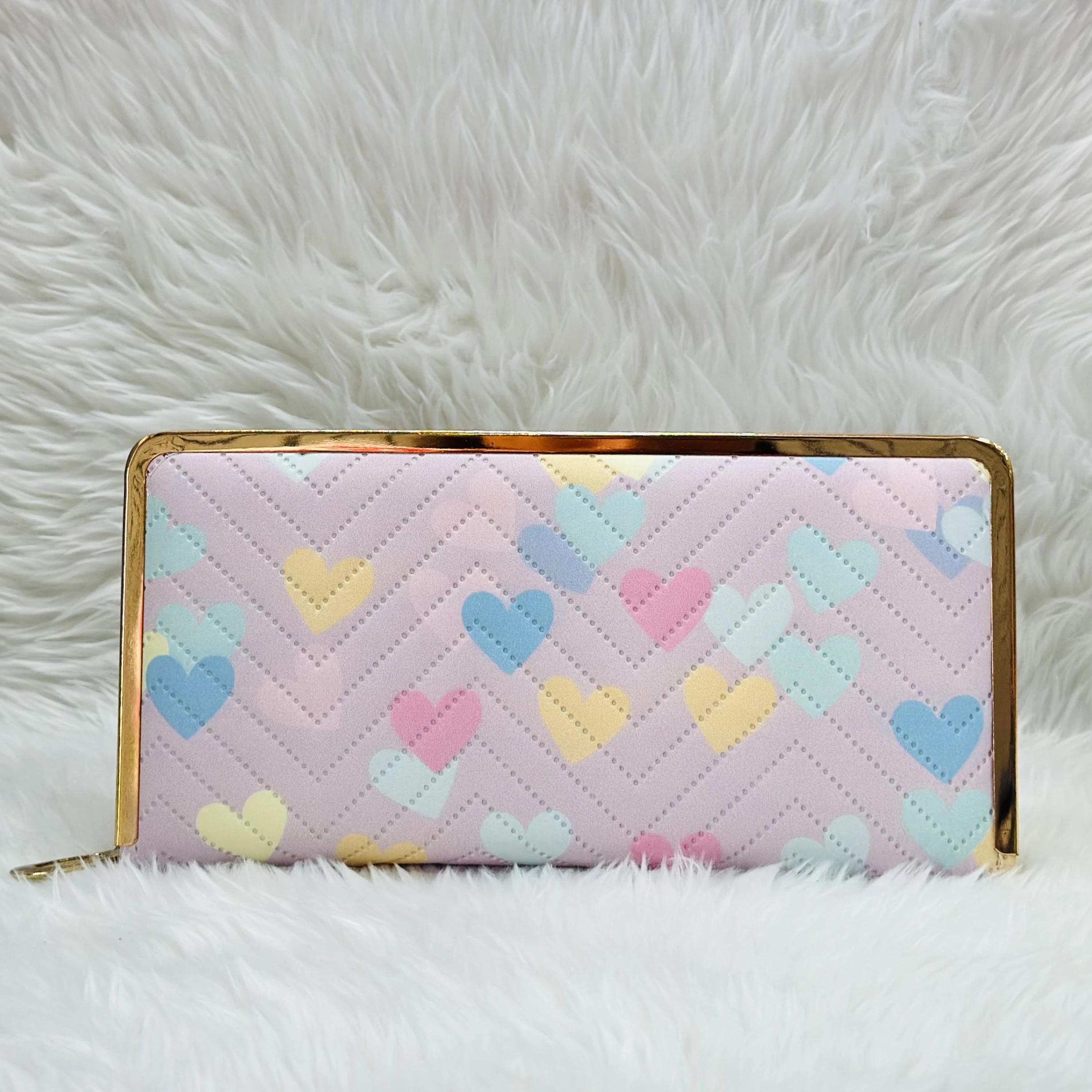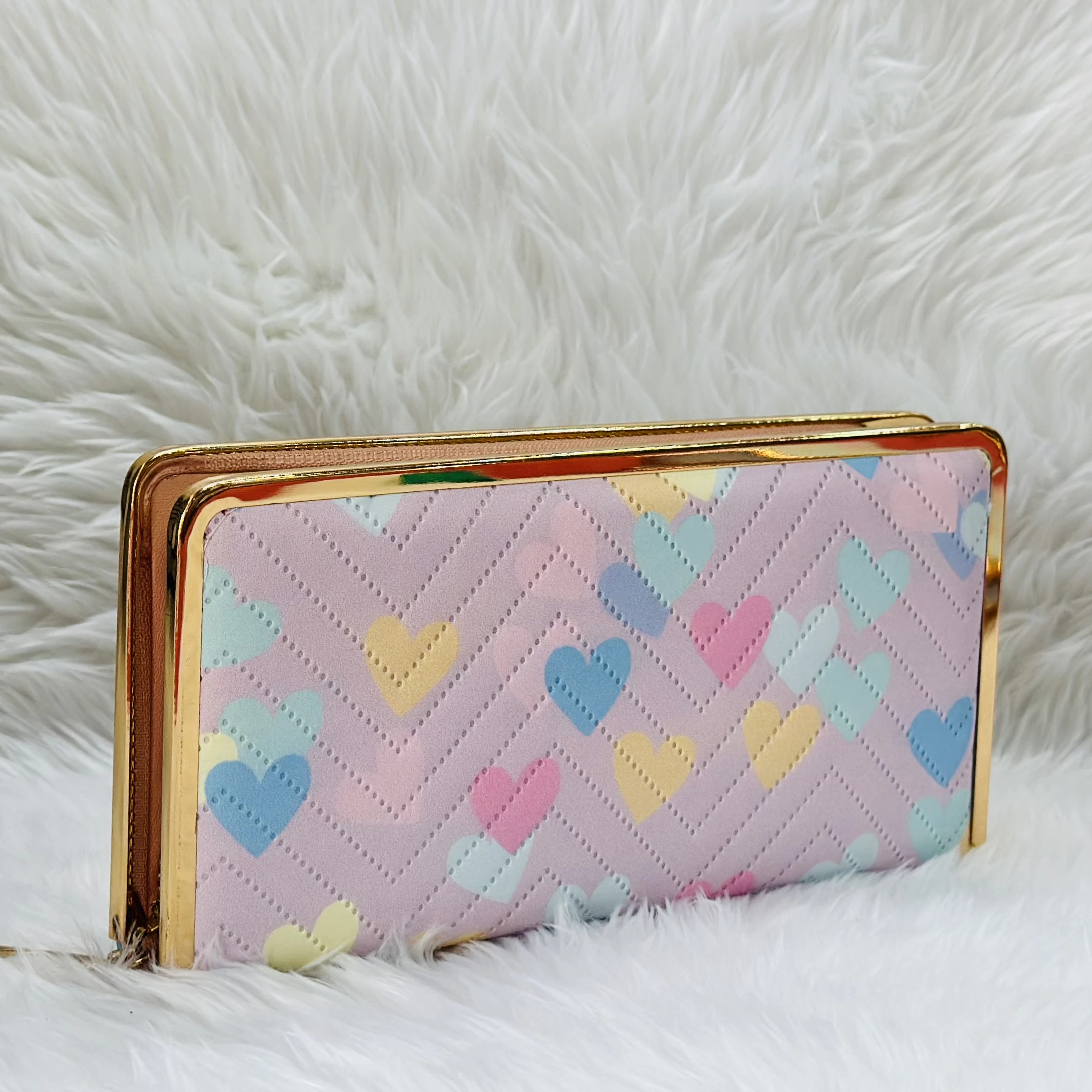 π Theme :- Kyraton pink women's wallet with a heart pattern and a gold-colored frame.Β