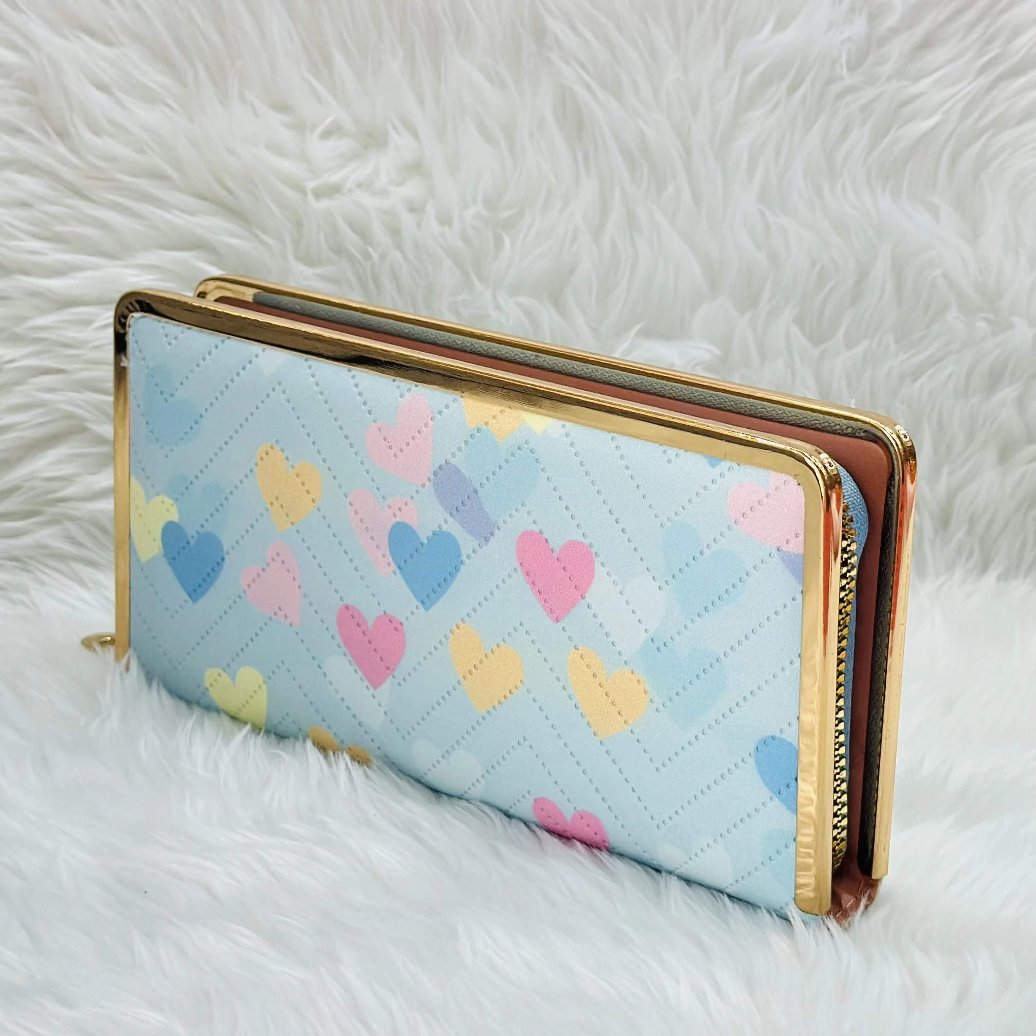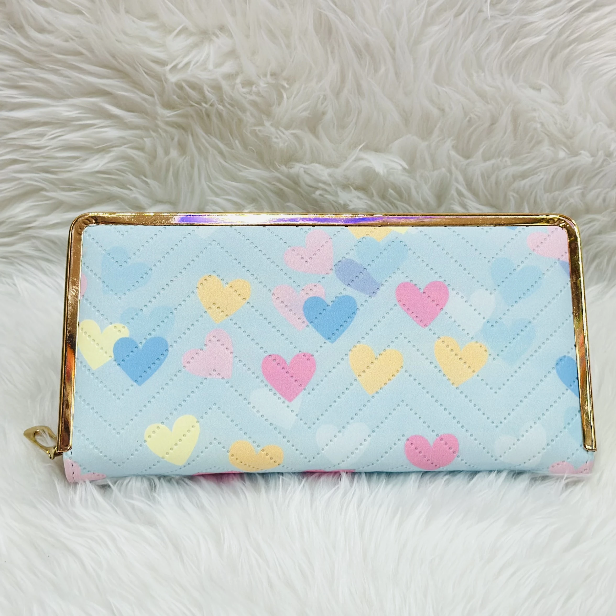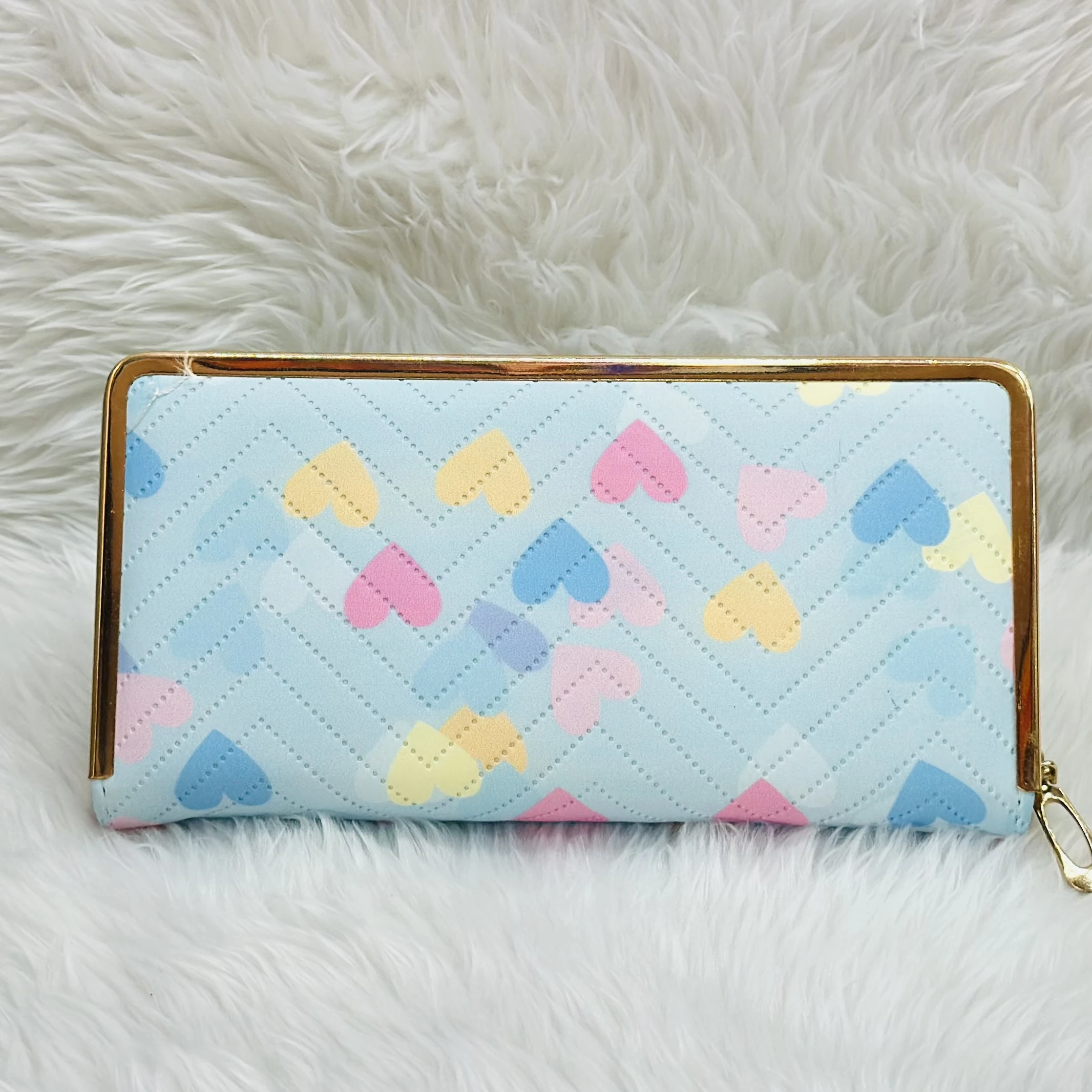 π Theme :- Kyraton women's long wallet with a light blue chevron and multi-colored heart pattern.