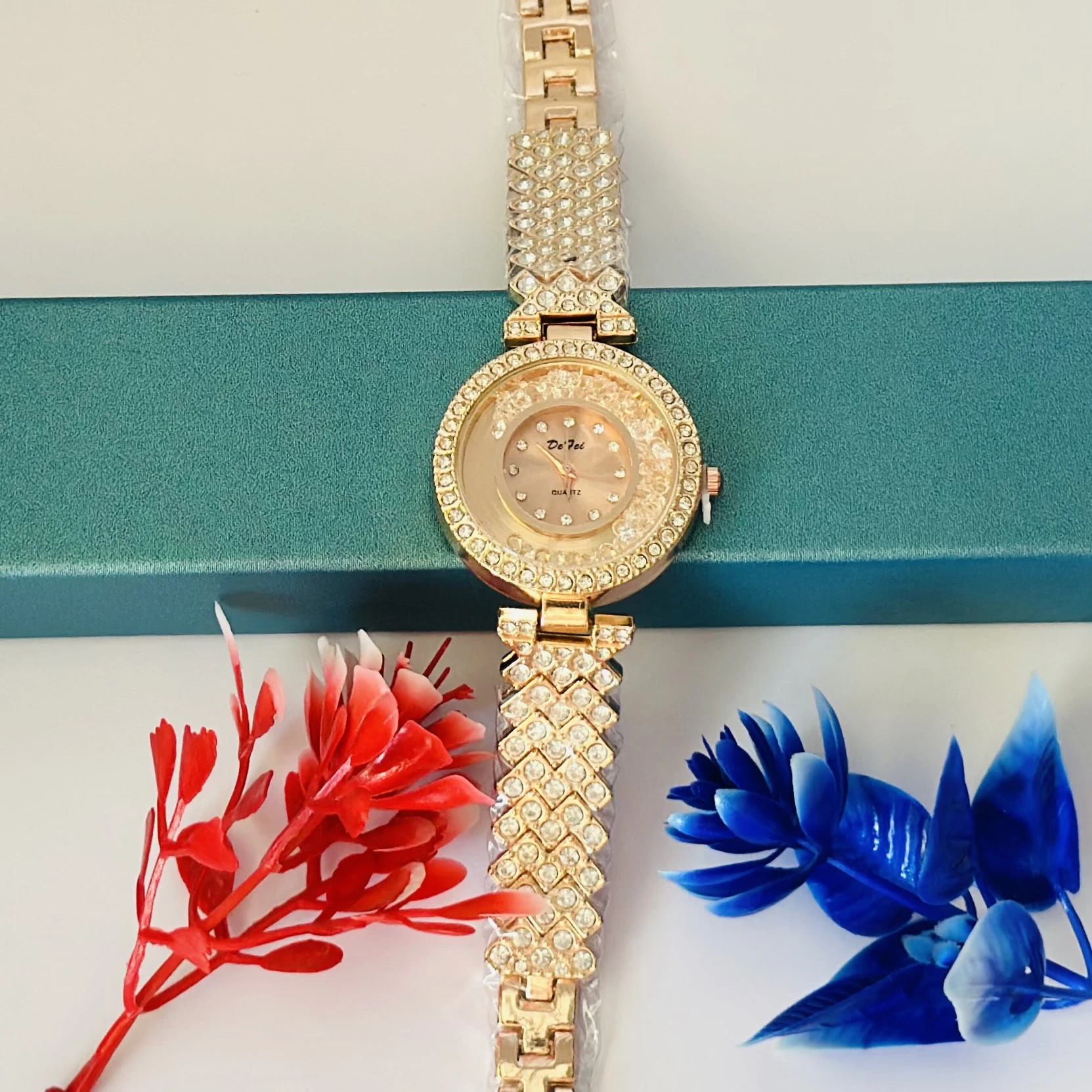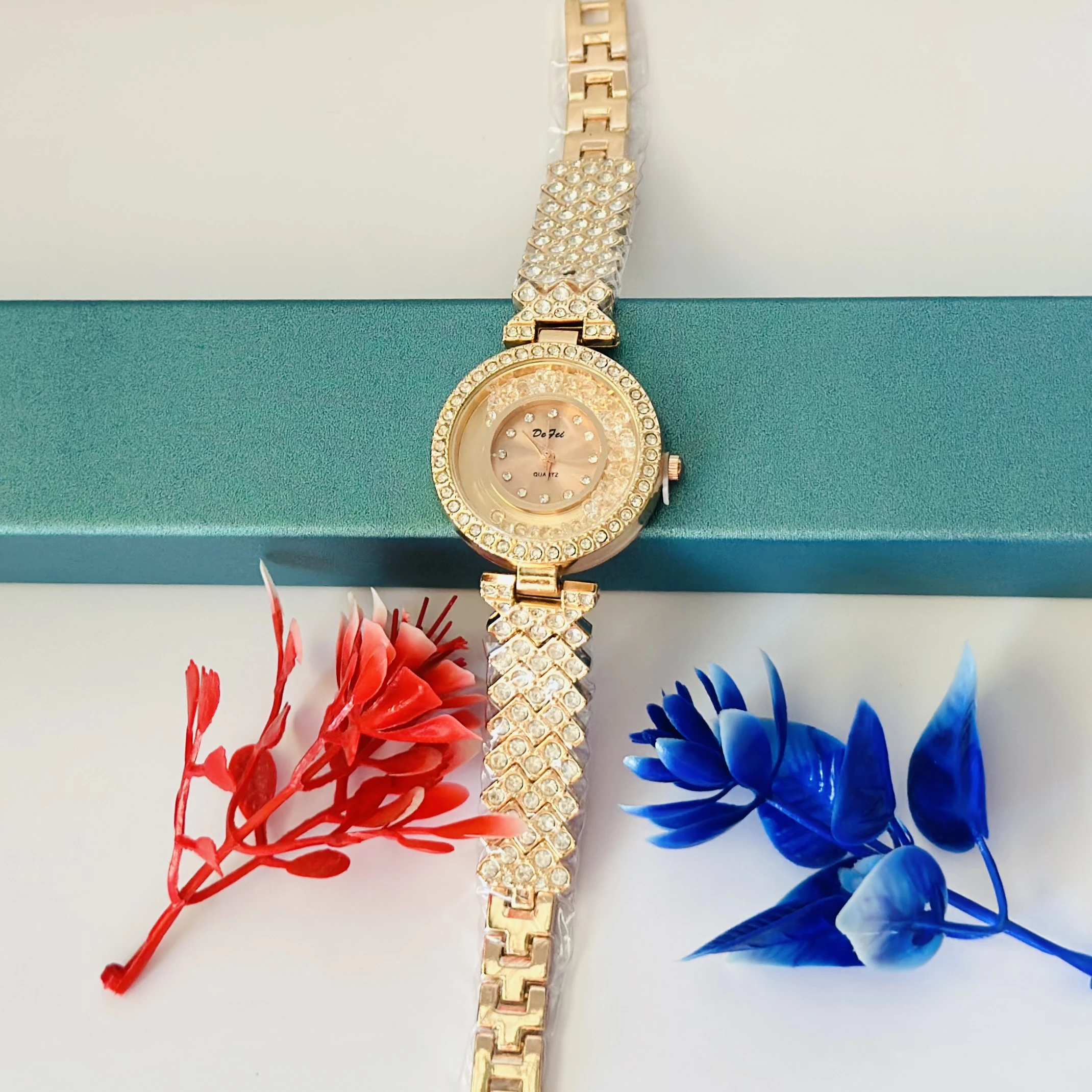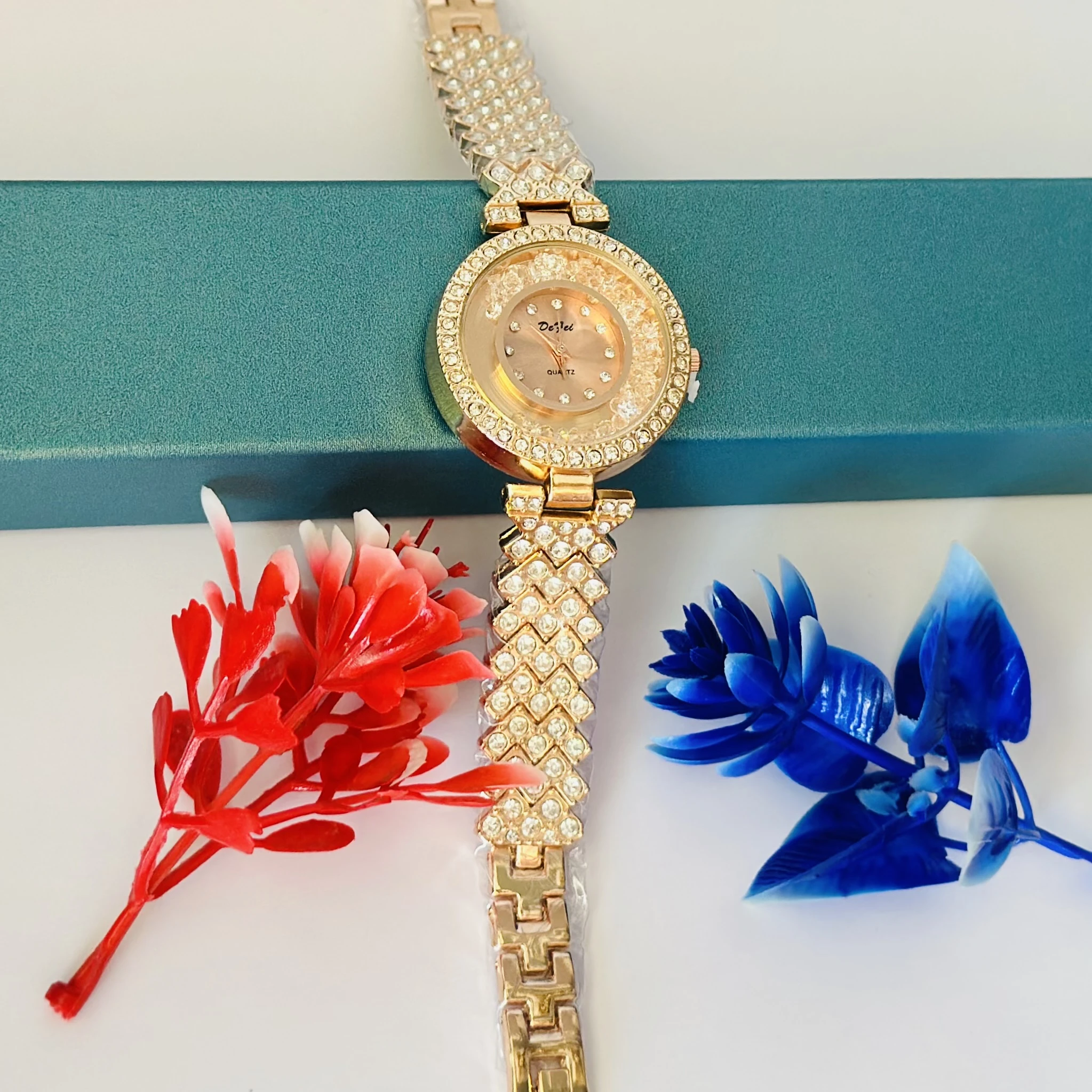 👉 Theme :- ladies crystal watch with a rose gold-tone band and crystal-studded dial.