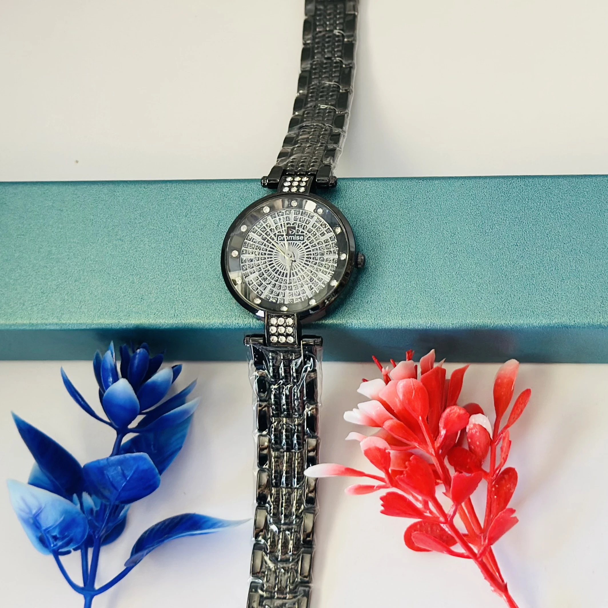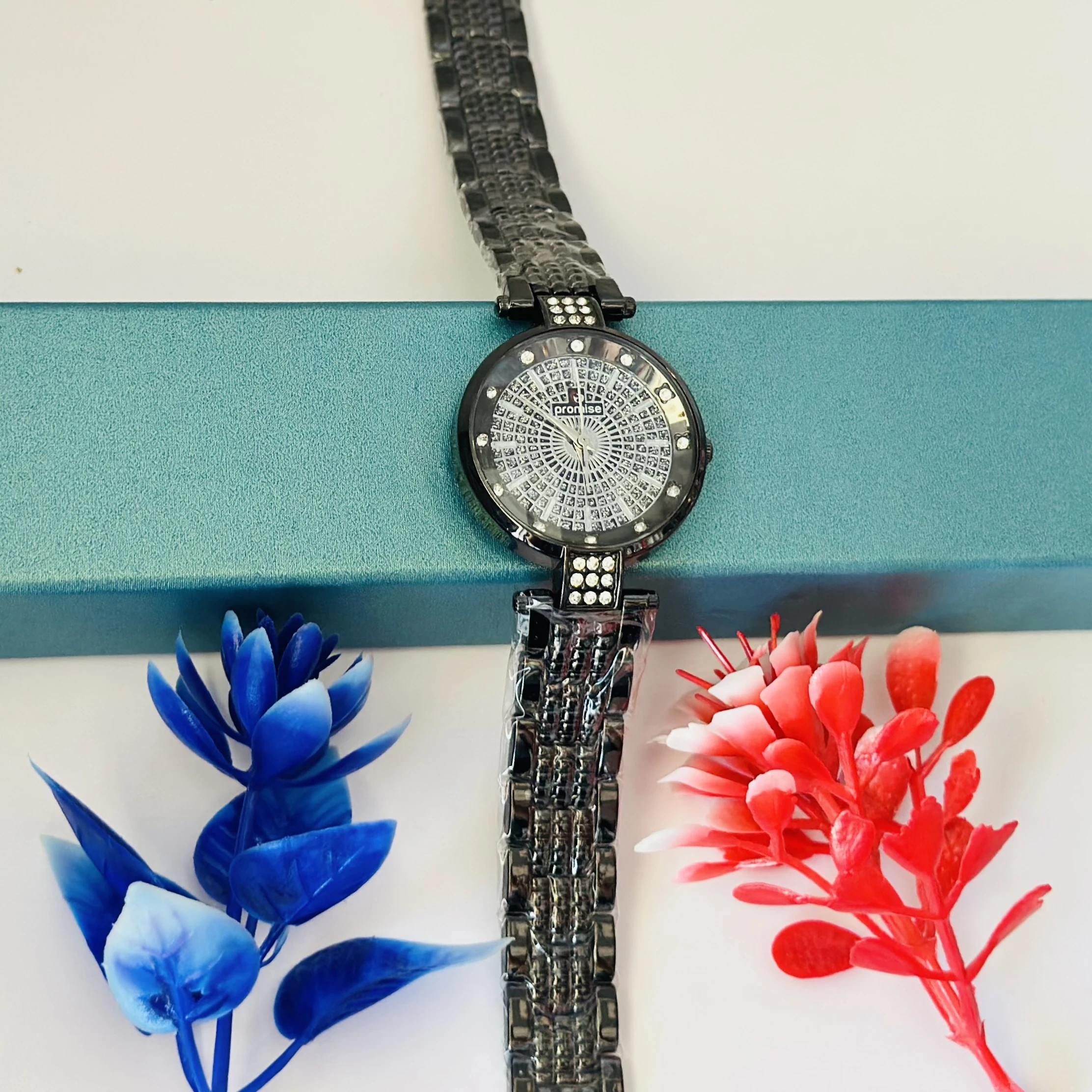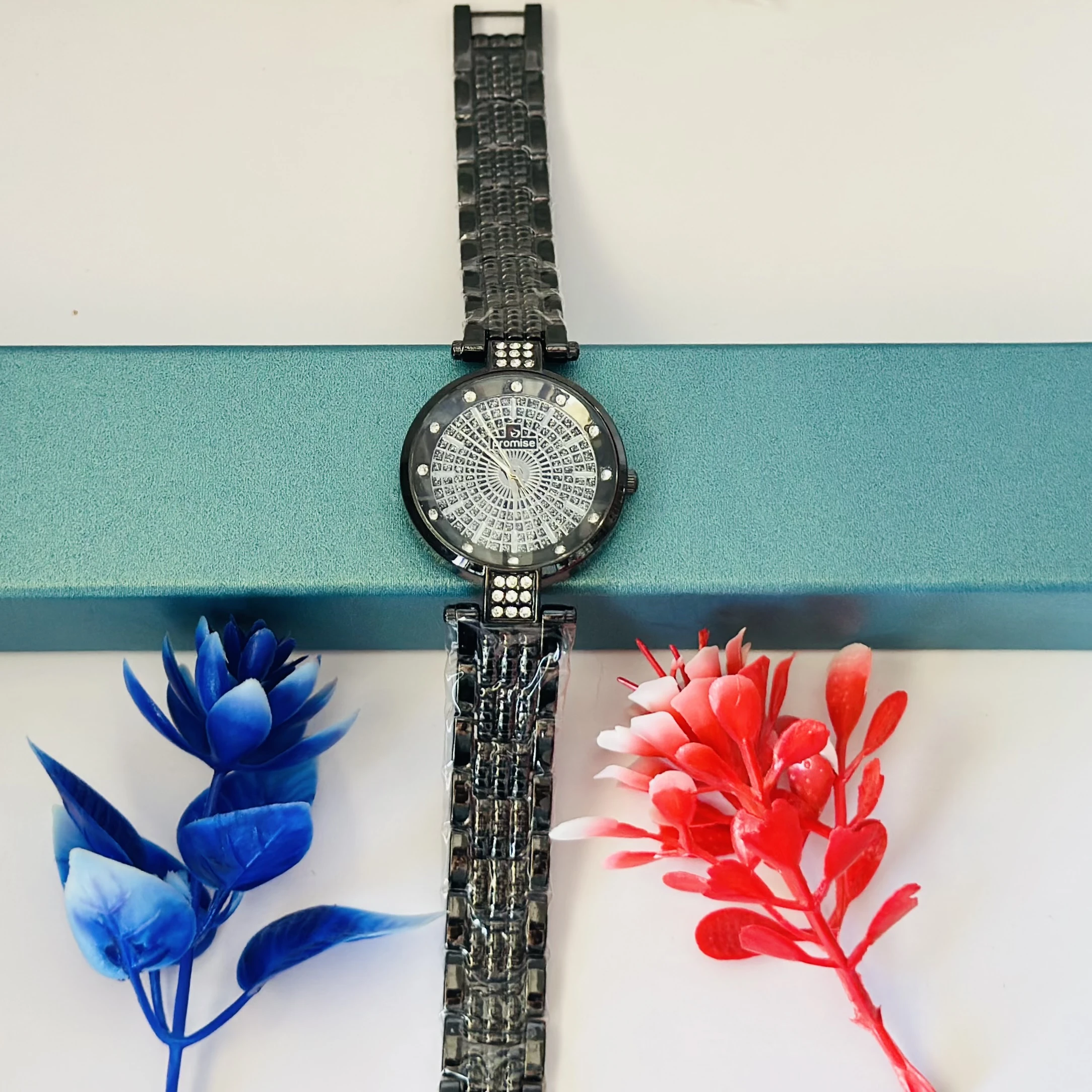 👉 Theme :- Ladies fashion watch with a black metal strap.