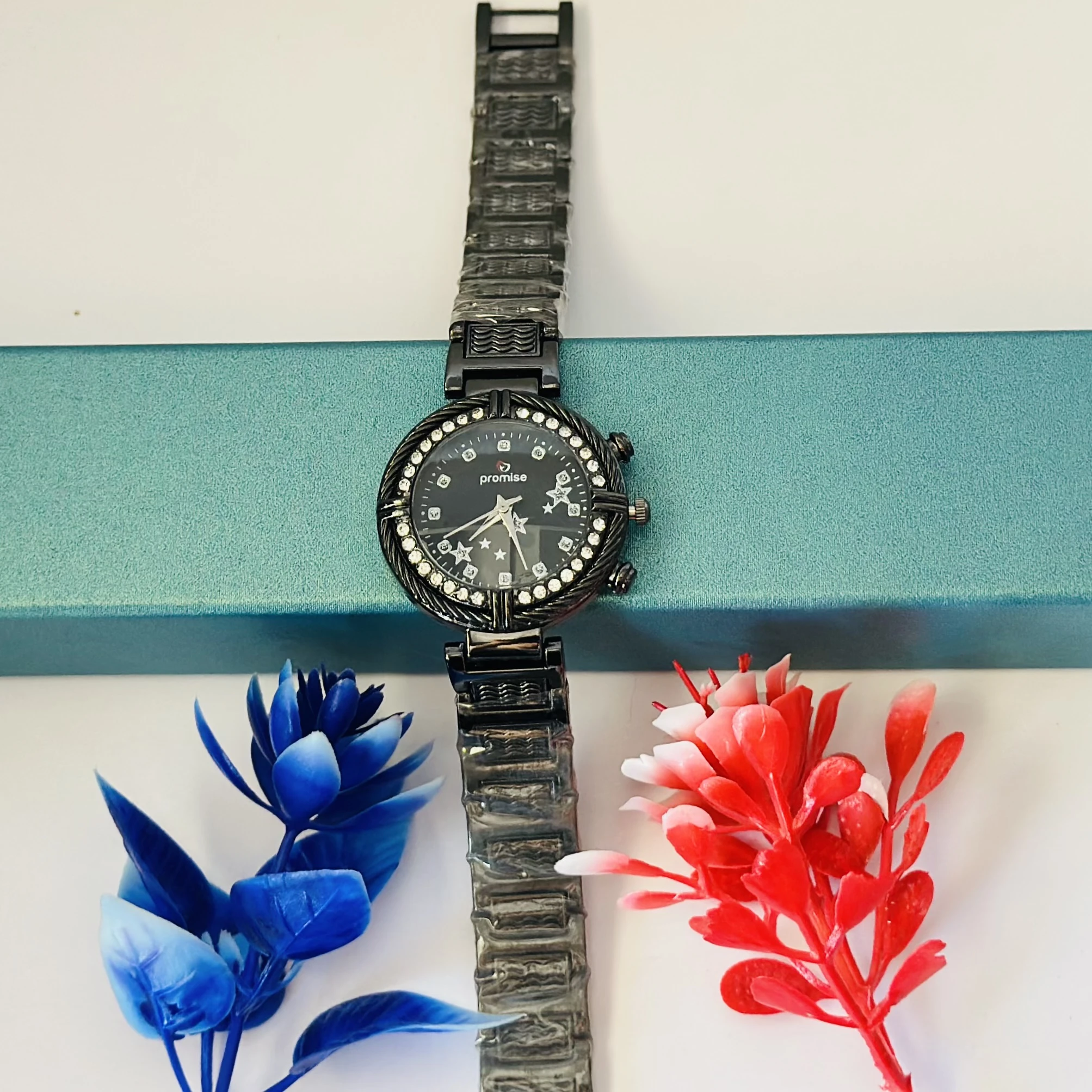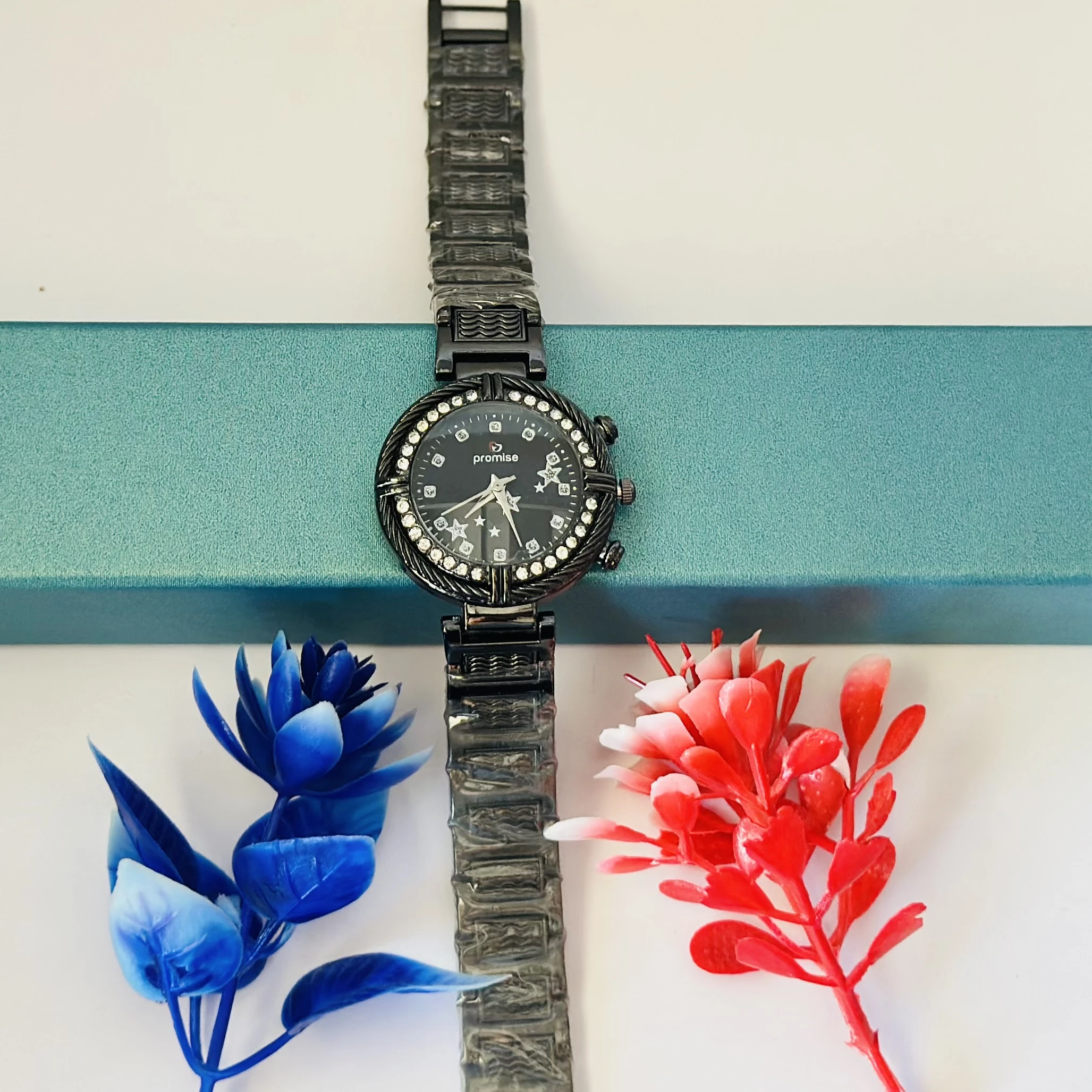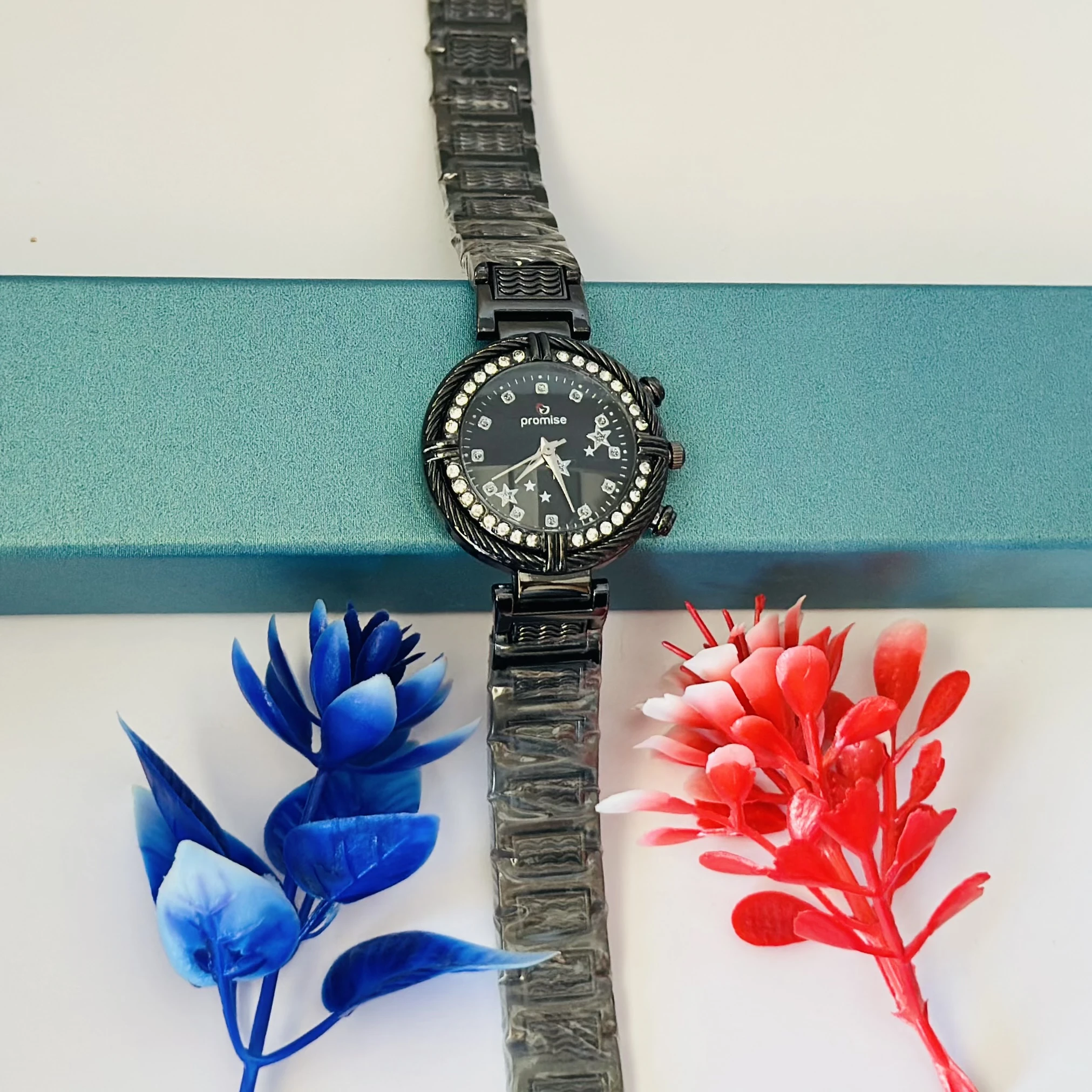 👉 Theme :- Ladies fashion watch with a black metal strap.