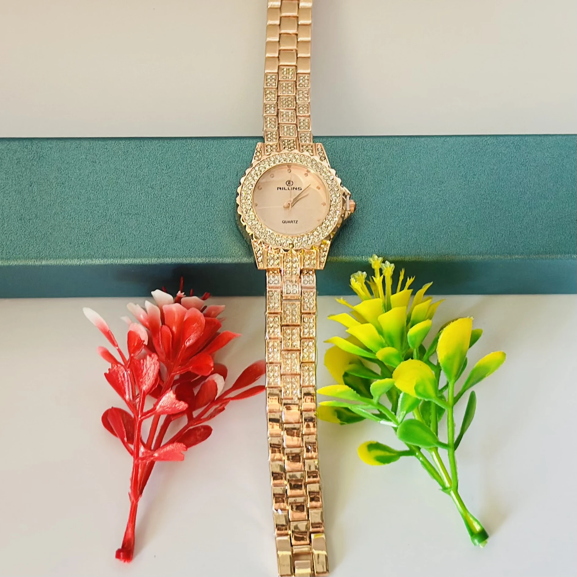 👉 Theme :- ladies' quartz watch with a gold-tone crystal bracelet.