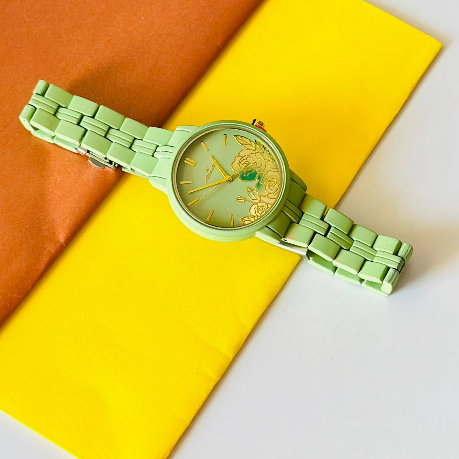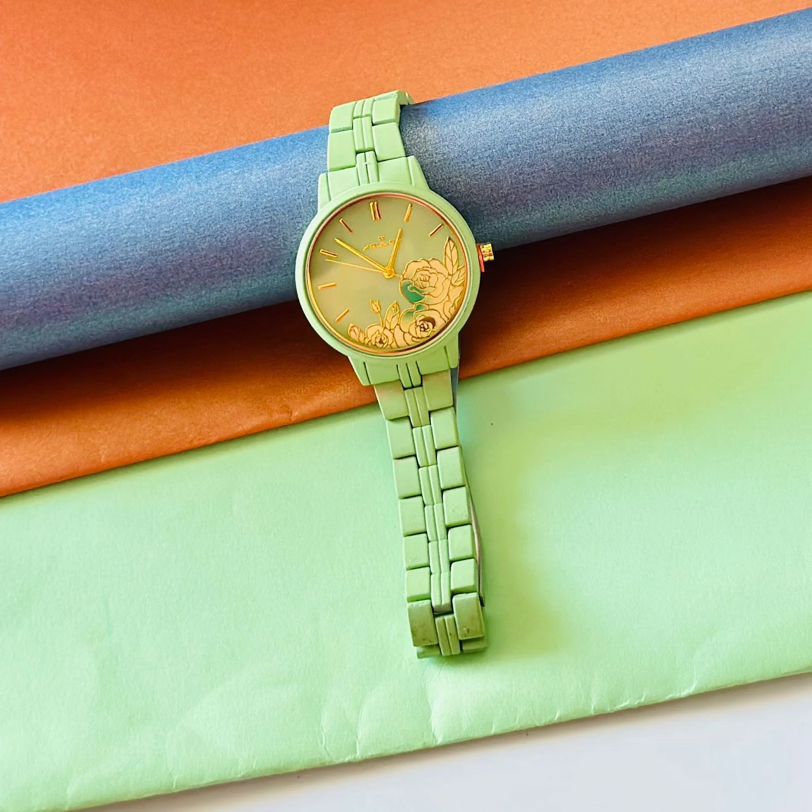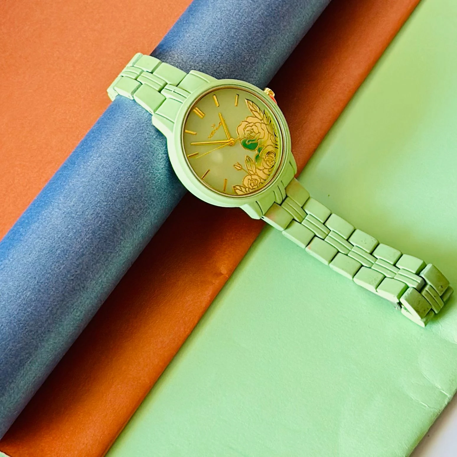 👉 Theme :- light green women's analog watch with a floral print on the dial and a link bracelet.