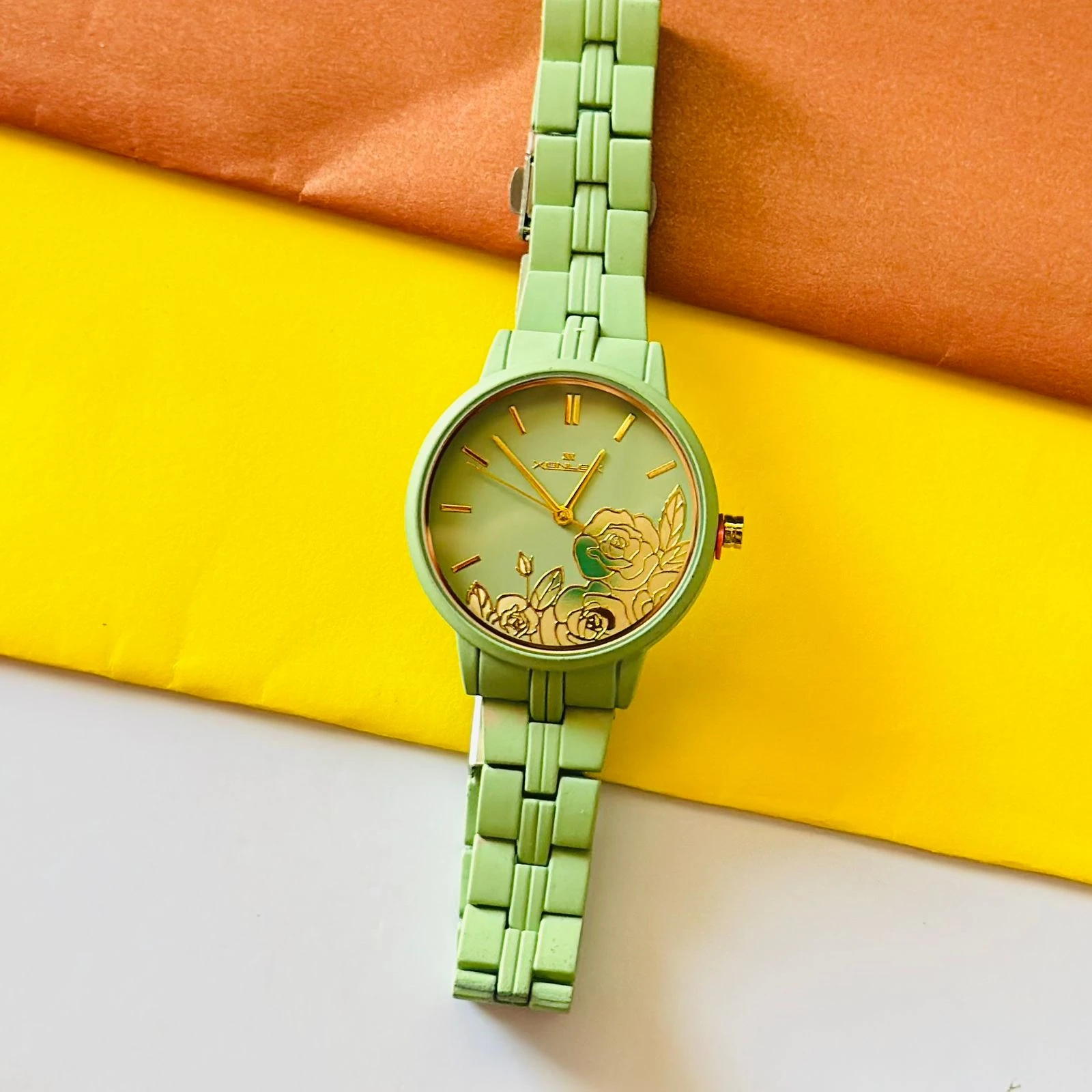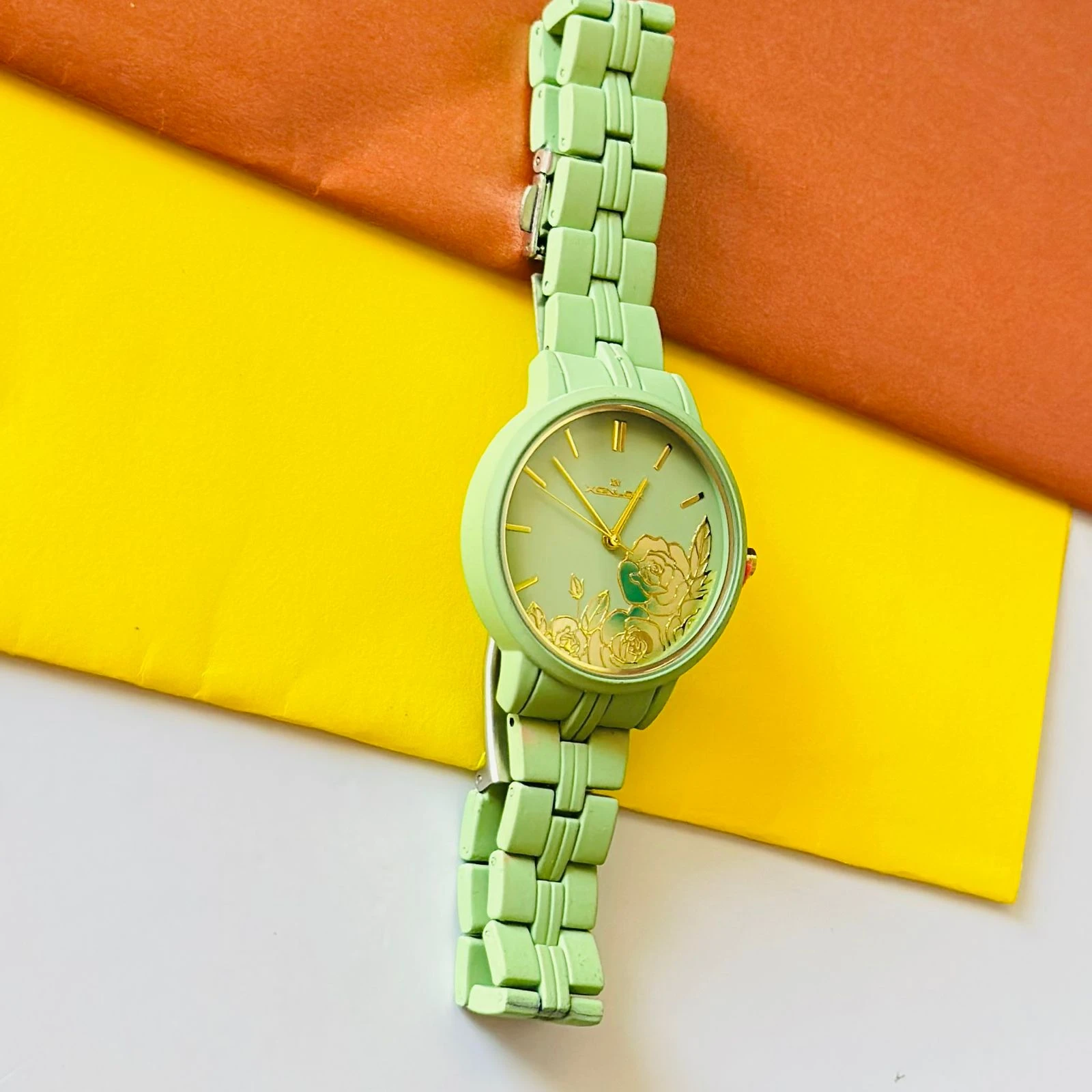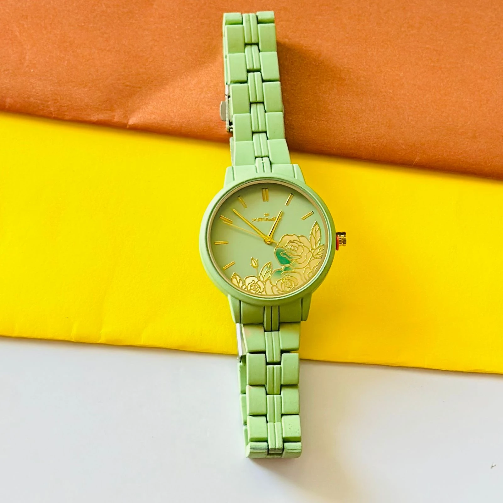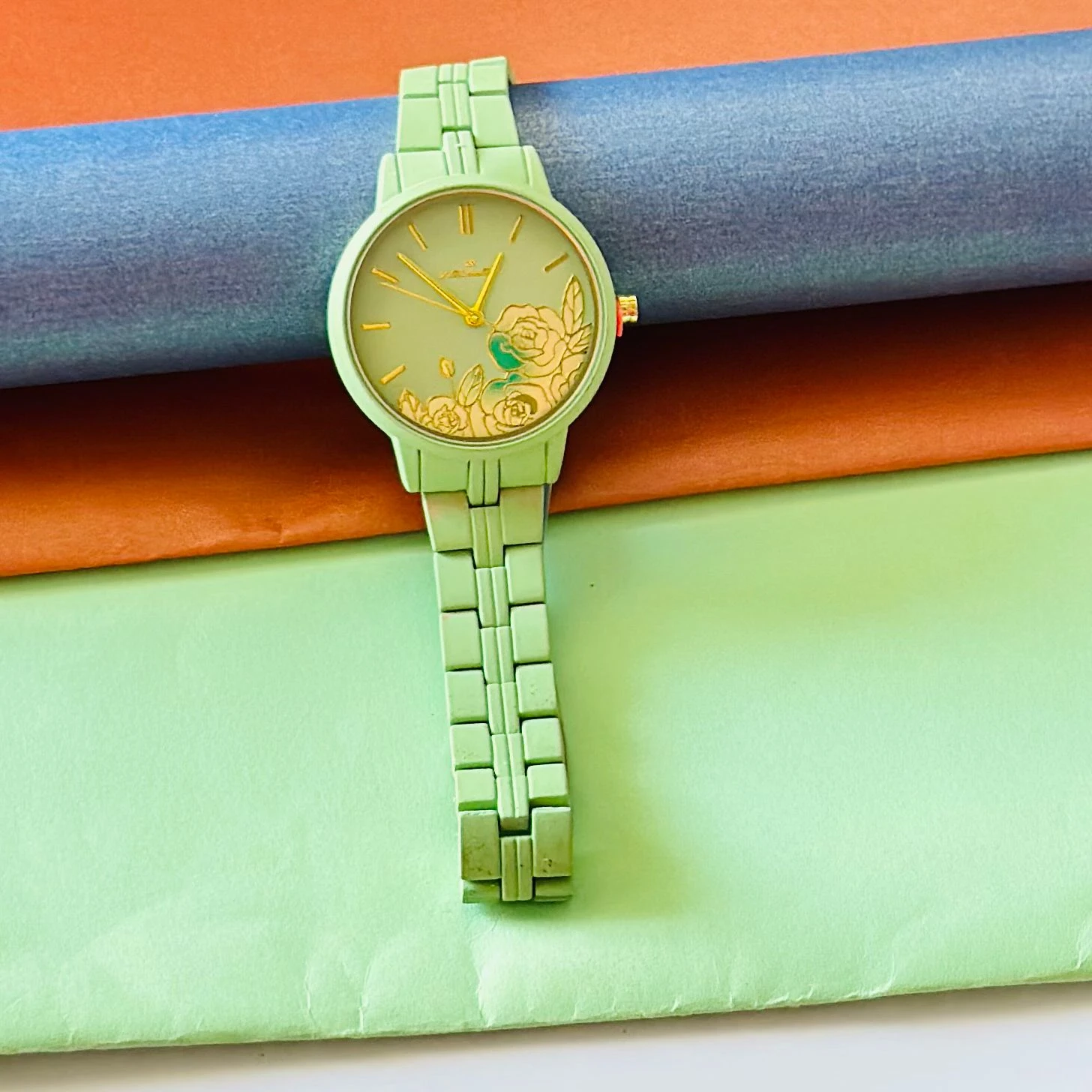 👉 Theme :- light green women's analog watch with a floral print on the dial and a link bracelet.