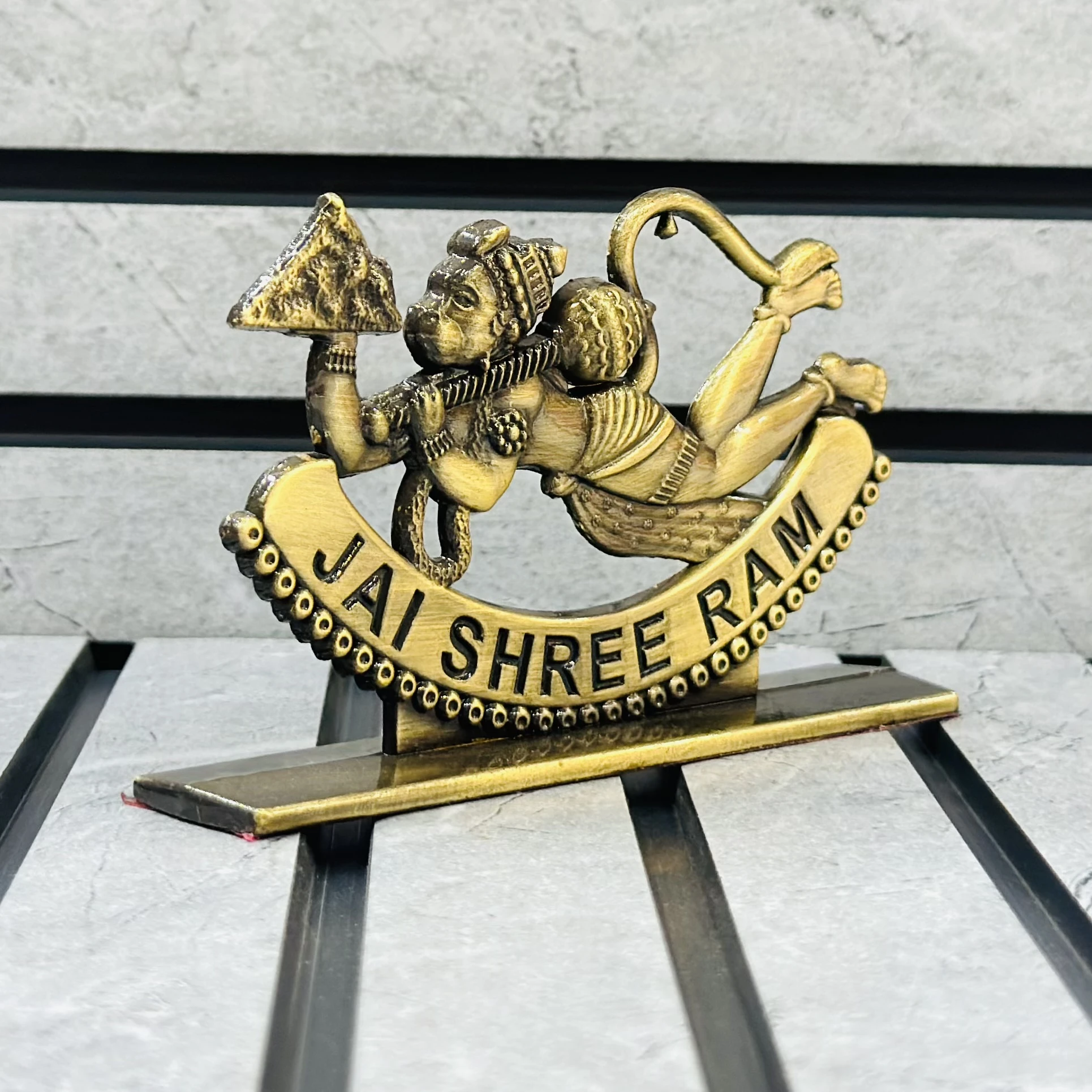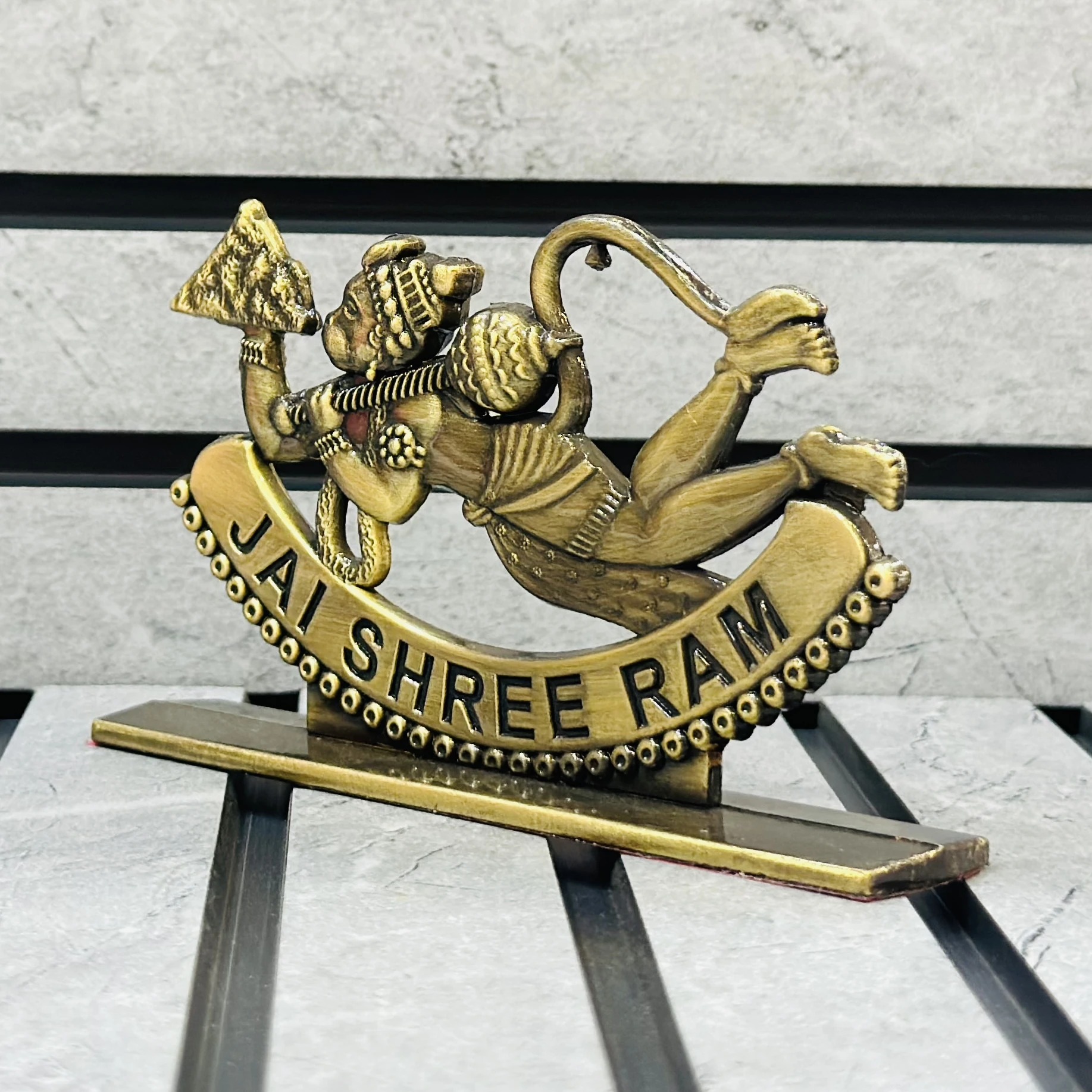 👉 Theme :- metal idol of Lord Hanuman in a flying pose, carrying the Sanjeevani hill, with the words "JAI SHREE RAM" written on the base.