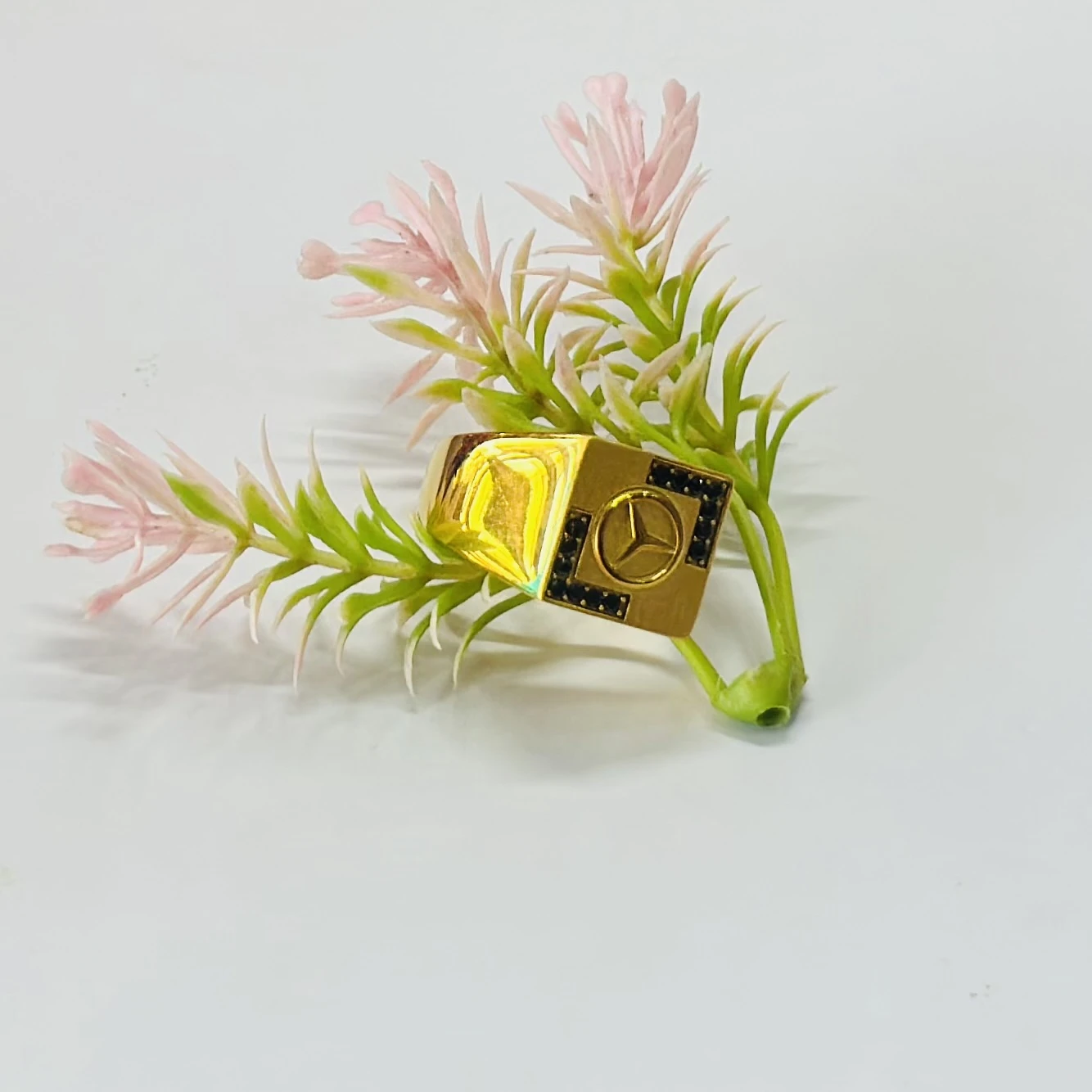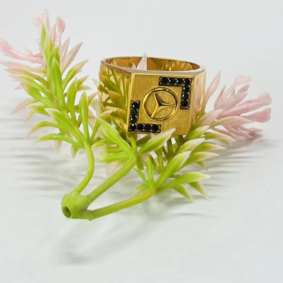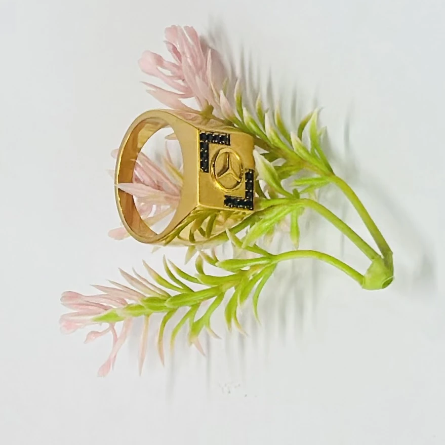 👉 Theme :- Gold plated men's ring featuring the Mercedes-Benz logo and black accent stones
