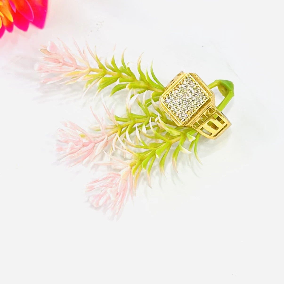 👉 Theme :- Gold gent's ring with a textured design and diamond accents.